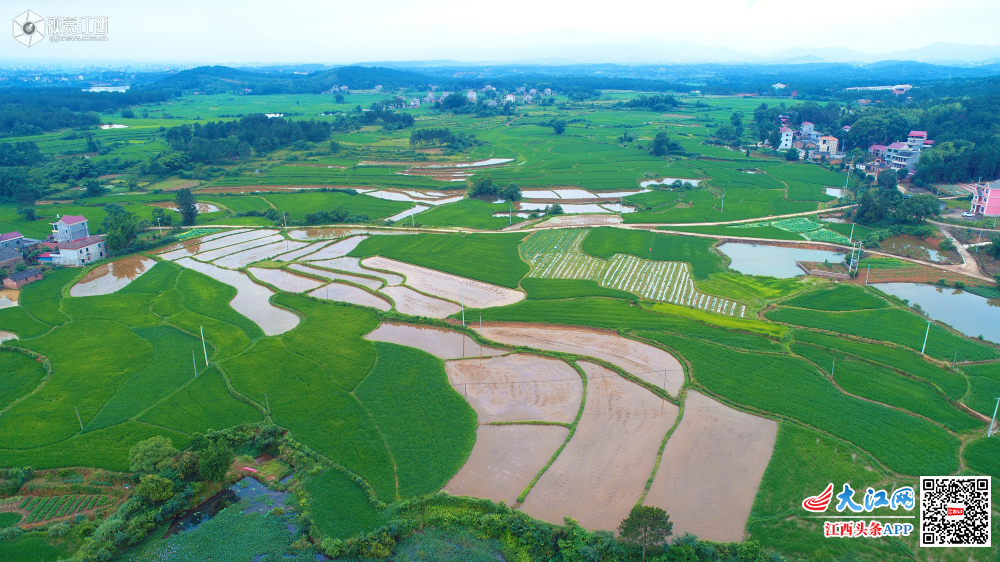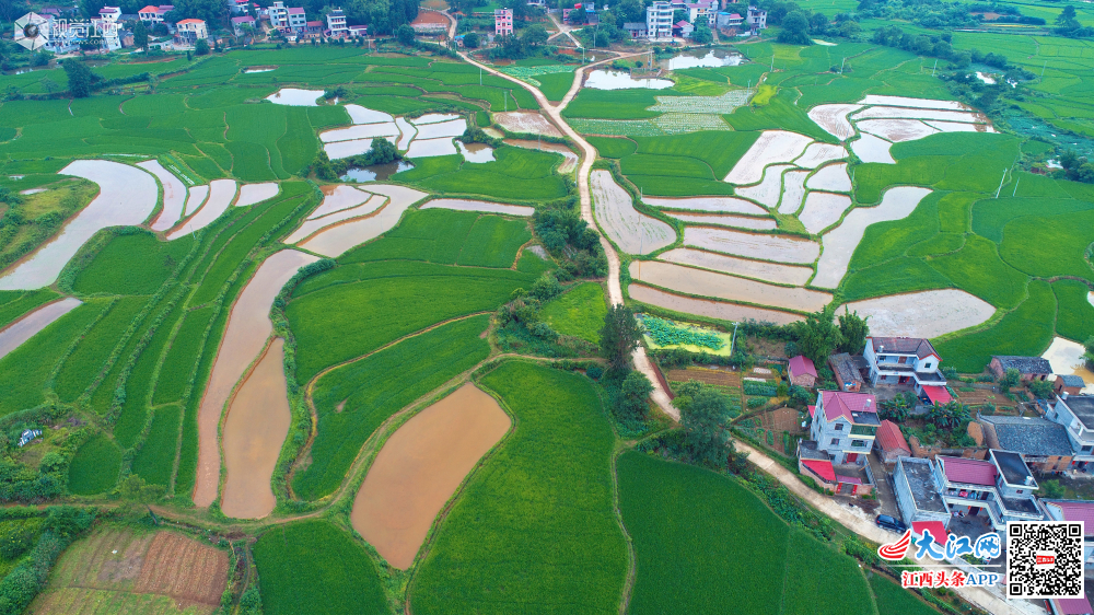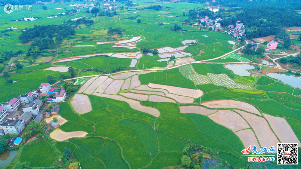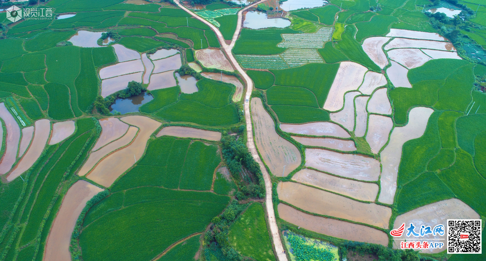 5月27日,位于井冈山脚下的江西省吉安市泰和县马市镇东来村,夏日田园如诗如画。在缓坡丘陵梯田上,绿油油的早稻田与即将播种的中稻田,绿白相间,色彩鲜明,与村庄相映成趣,构成了一幅幅江南夏日田园风光。