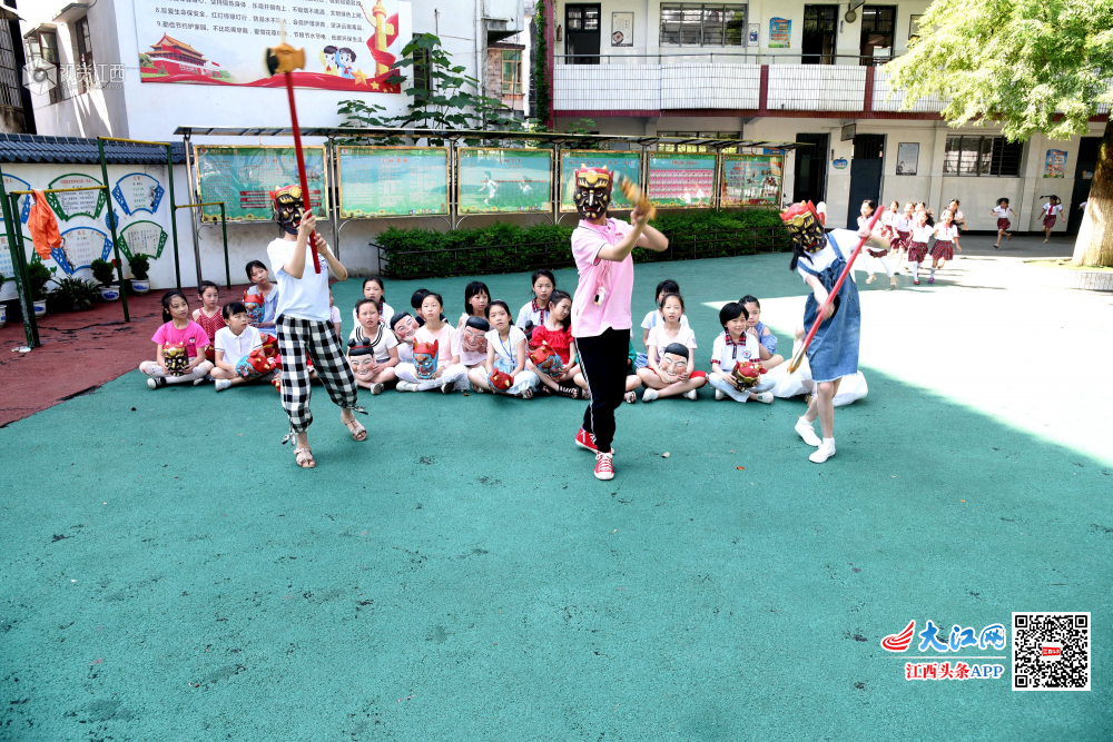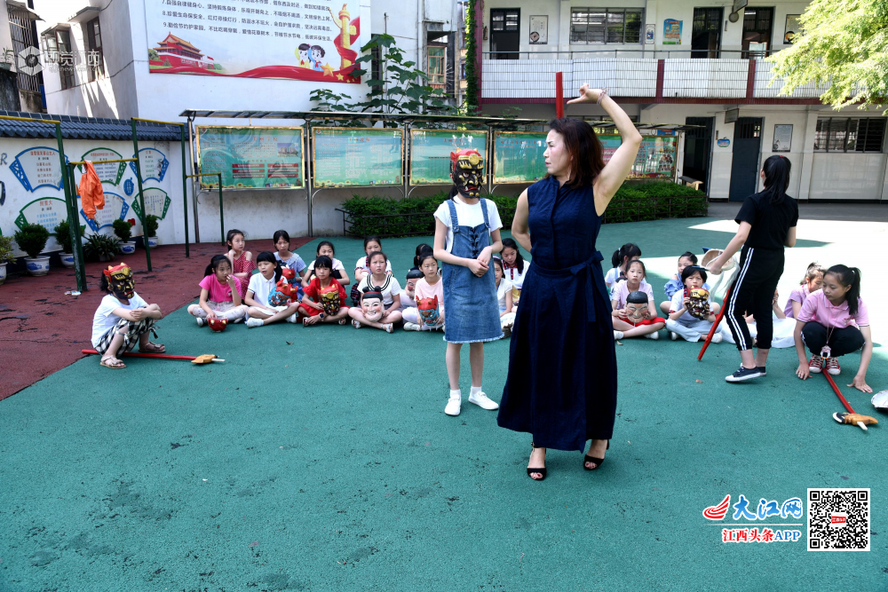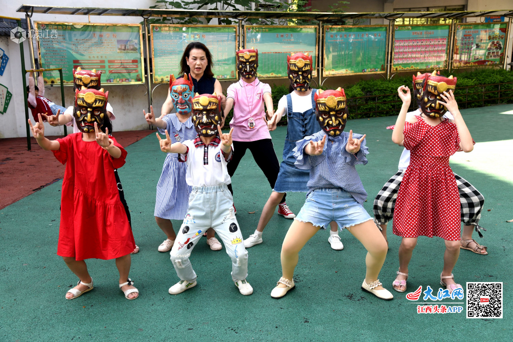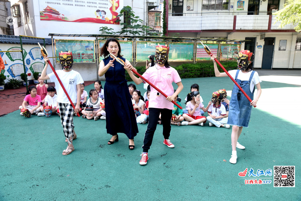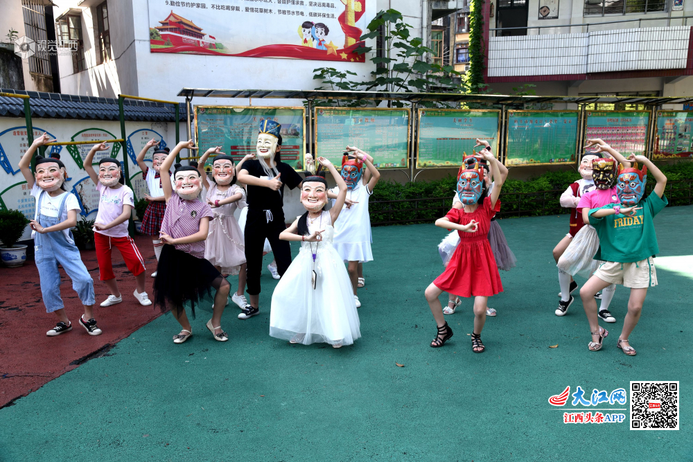 6月4日,江西省南丰县教师进修学校附属小学的孩子们在排练原创少儿歌舞节目“我跟阿公学跳傩”。