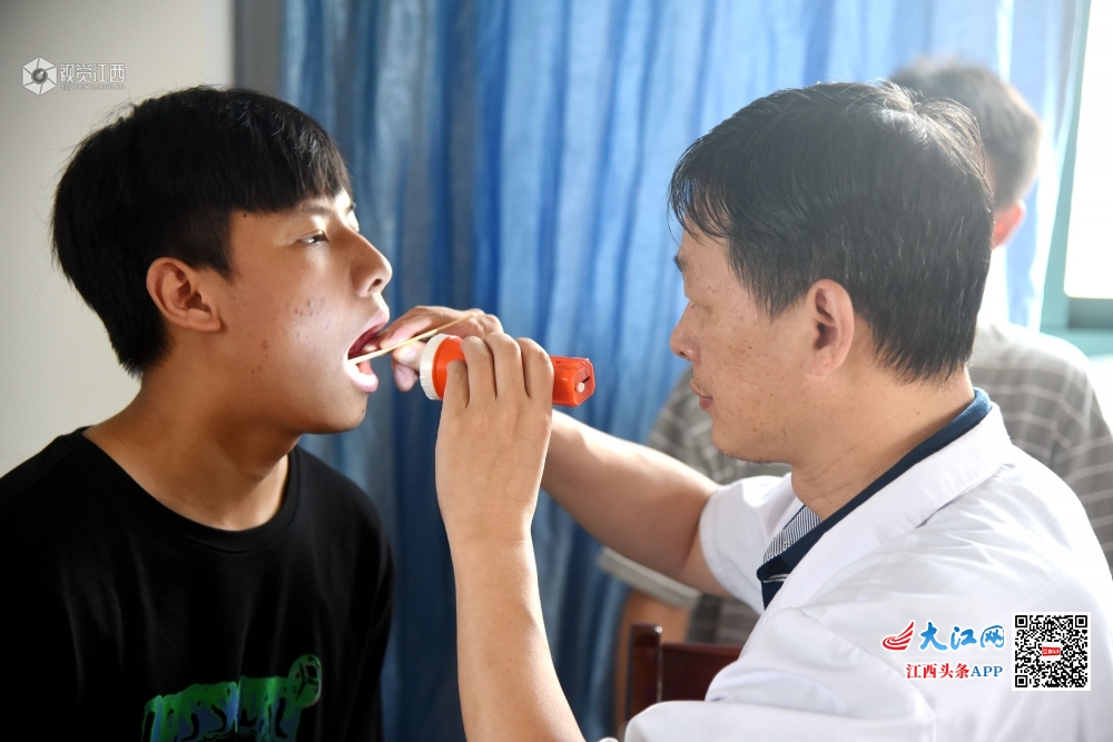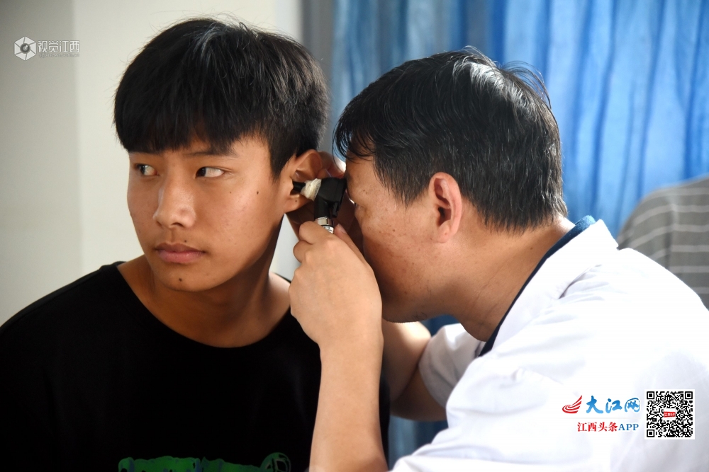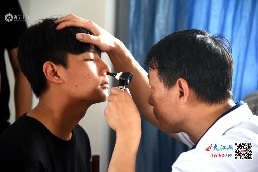 2019年7月5日上午,在江西省南丰县琴城镇卫生院征兵体检站,体检医师正在一丝不苟的为报名参军的适龄青年进行体格检查。