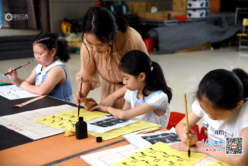 2019年7月12日,在江西省南丰县文化馆培训教室内,孩子们在老师指点下认真练习毛笔、硬笔等书法。