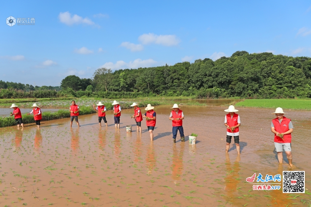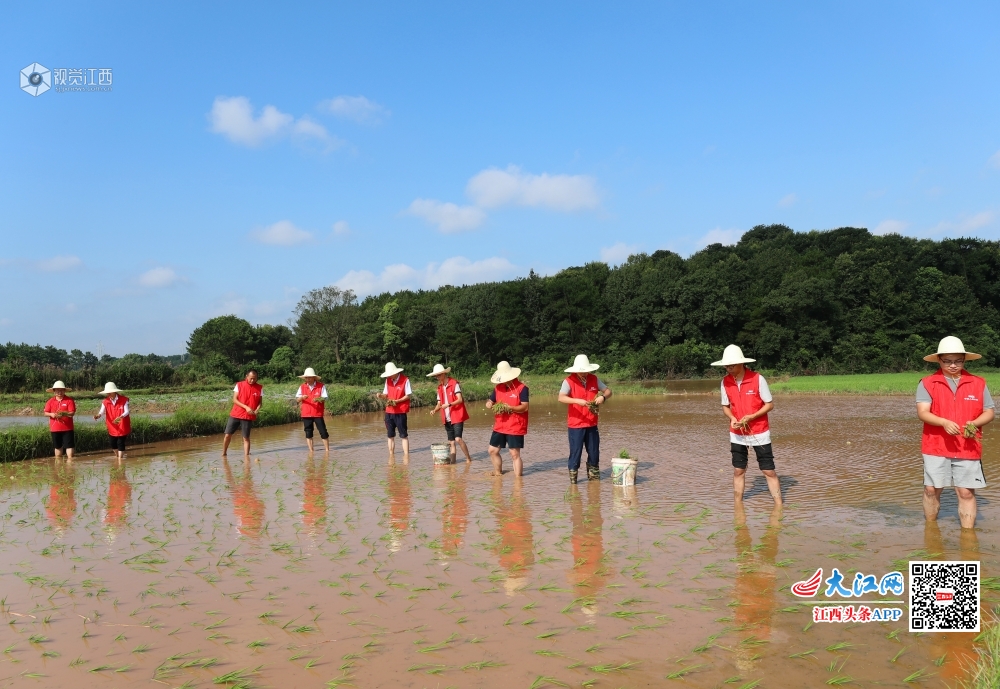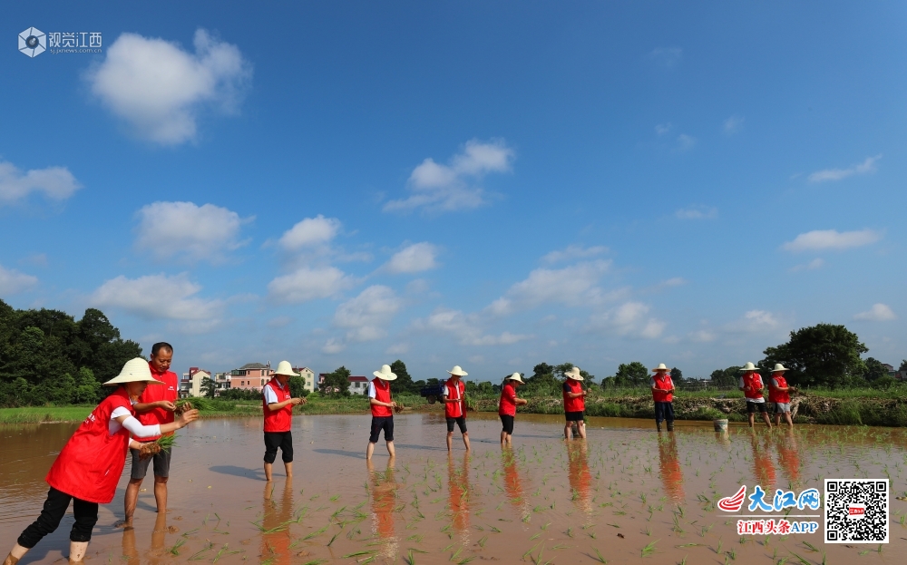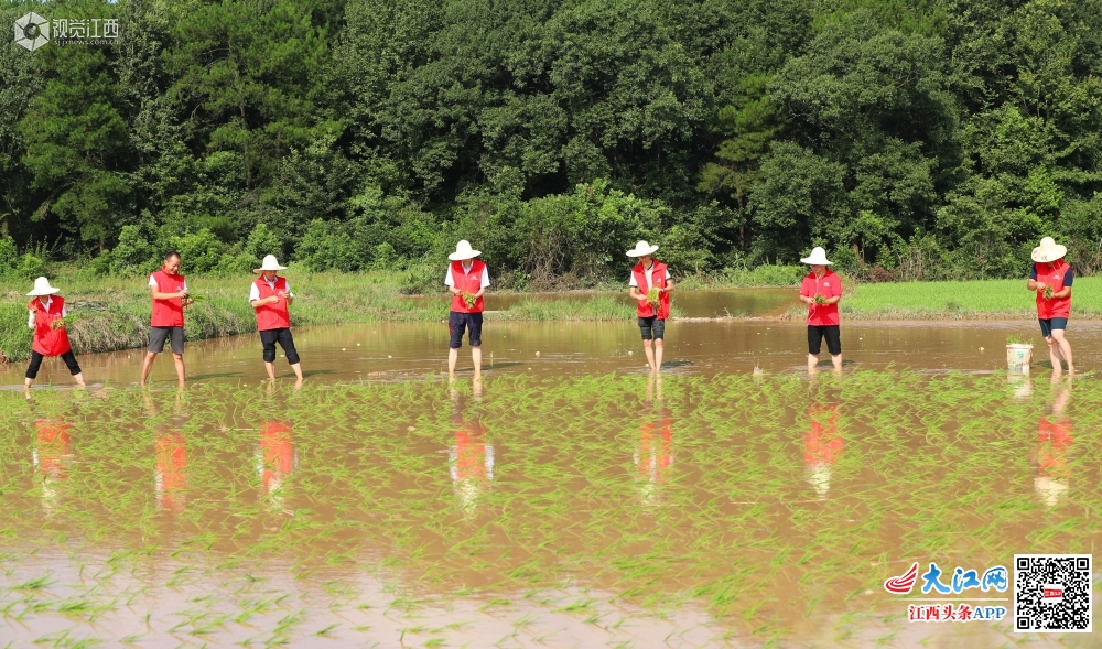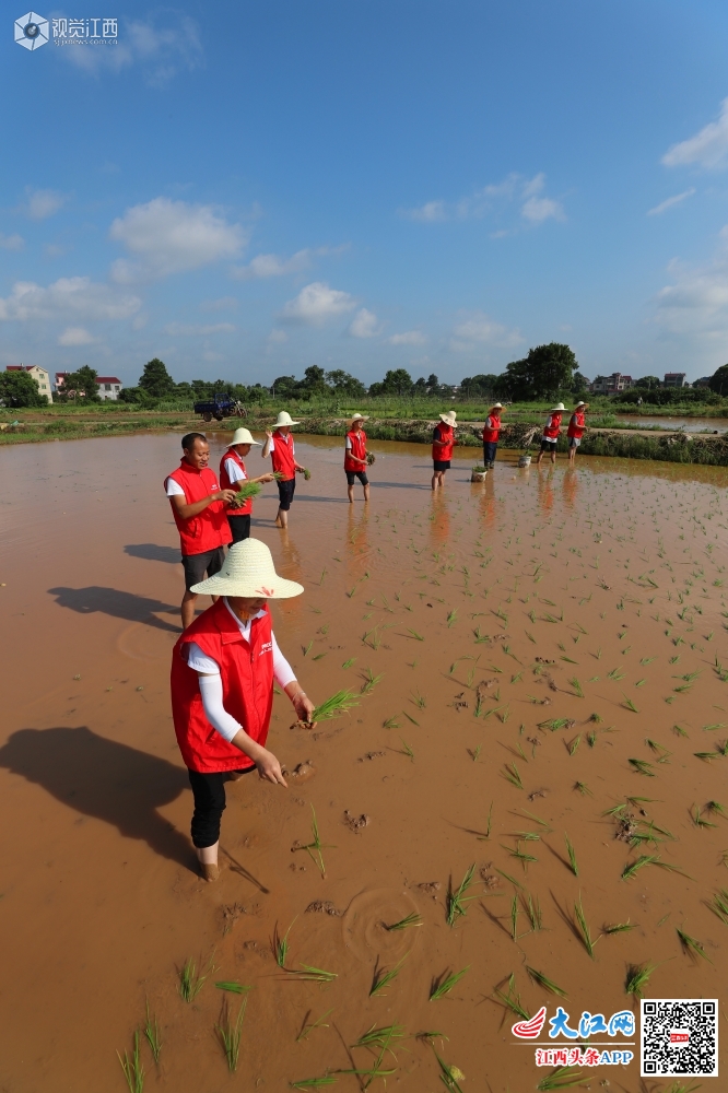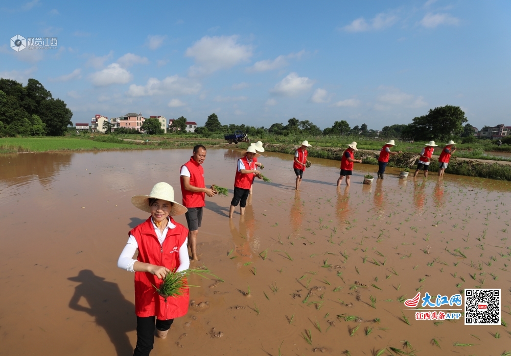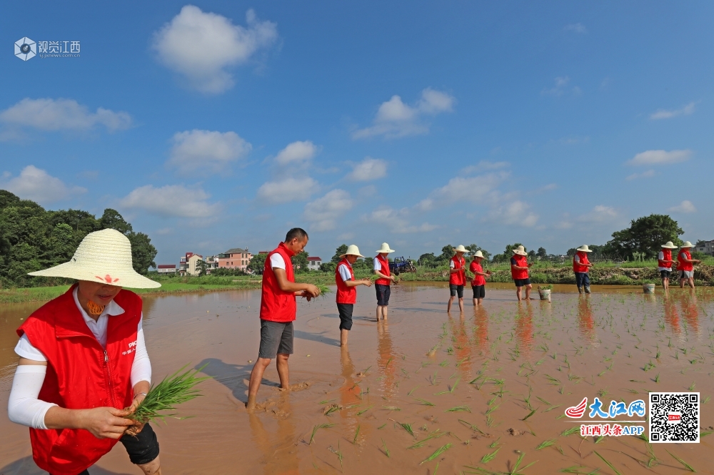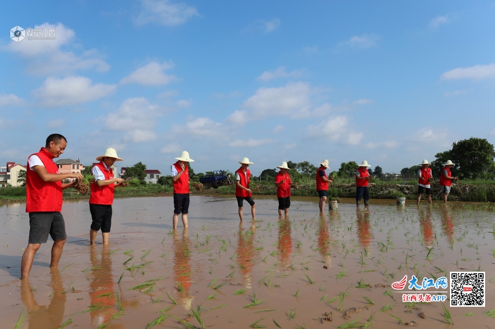 7月23日,在江西省吉安市泰和县螺溪镇兰溪村,志愿者在贫困群众稻田抛秧,播种晚稻。