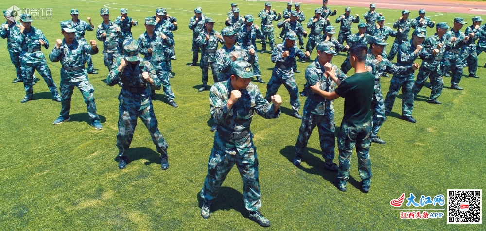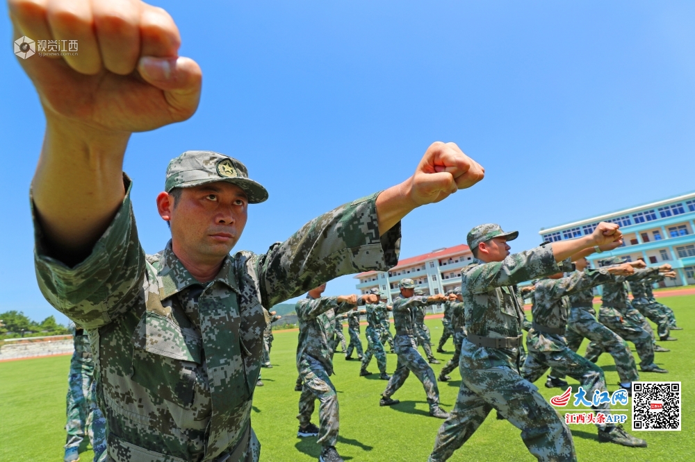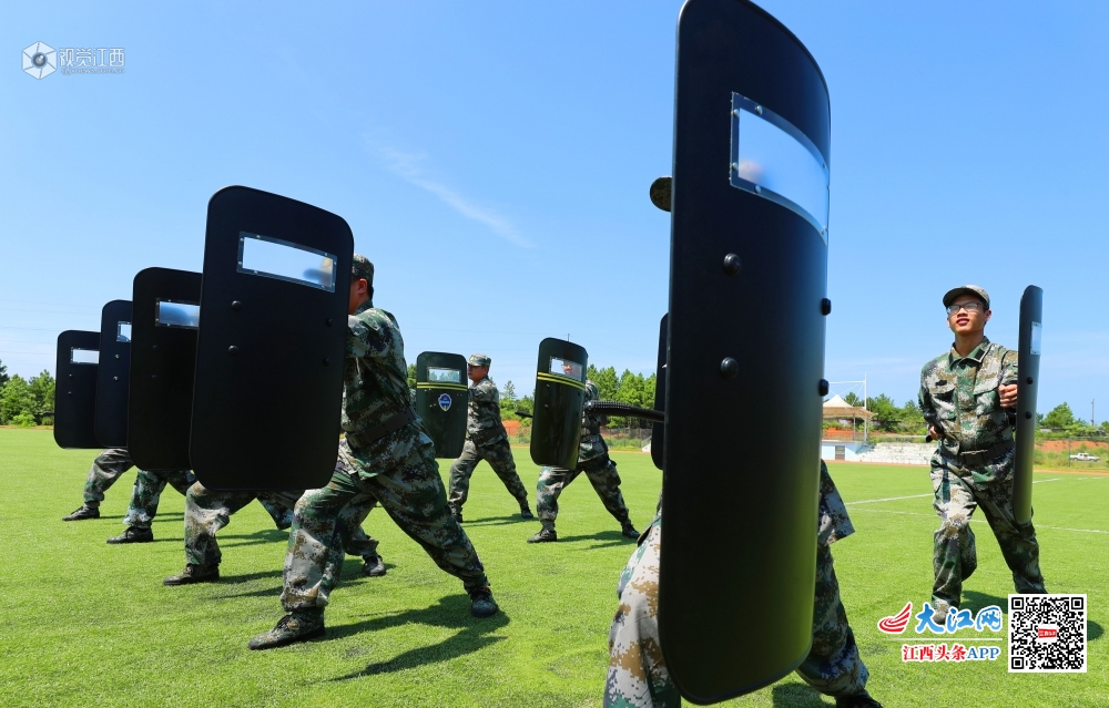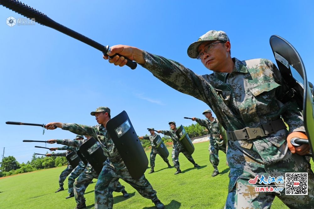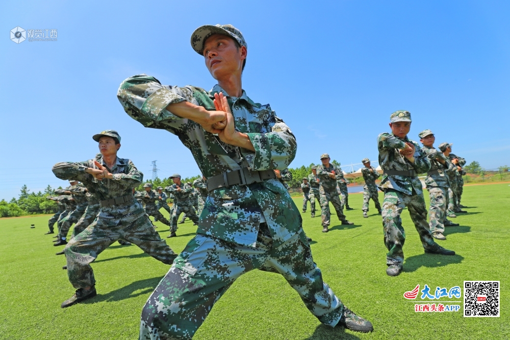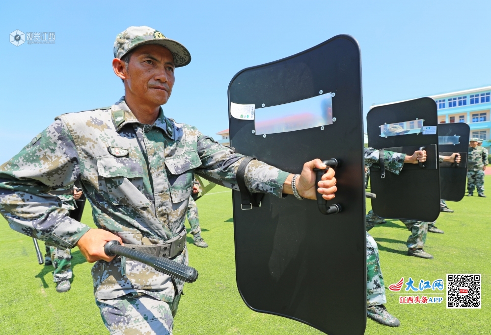 7月25日,在江西省吉安市泰和县人武部2019年第二期基干民兵训练班上,民兵在进行军事技能训练。