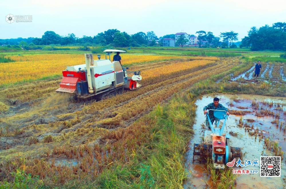 7月25日,在江西省吉安市泰和县沿溪镇山东村,一农民驾驶收割机在收割早稻,另一农民开着手扶拖拉机在翻耕整地播种晚稻,构成一幅夏日田园“双抢”图。