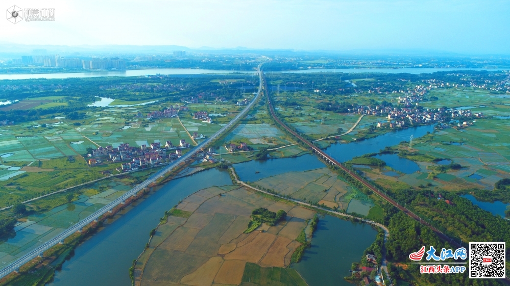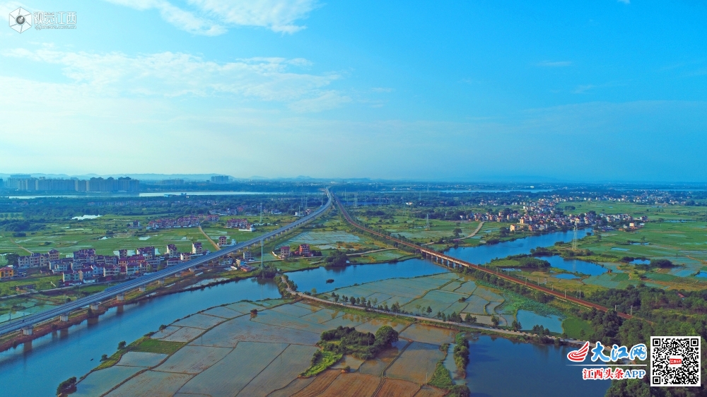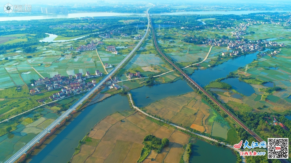 7月28日,在江西省吉安市泰和县塘洲镇龙口村,京九铁路、昌赣高铁,由北往南呈“八”字形穿越田园,蔚为壮观。两条钢铁交通大动脉犹如两条巨龙,承载起沿线省份高质量发展的“钢铁脊梁”。