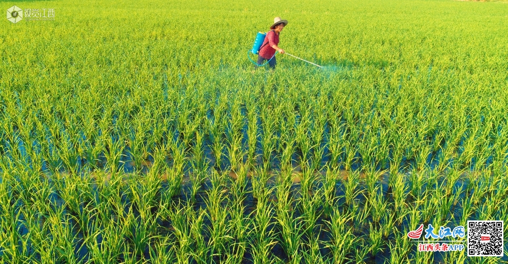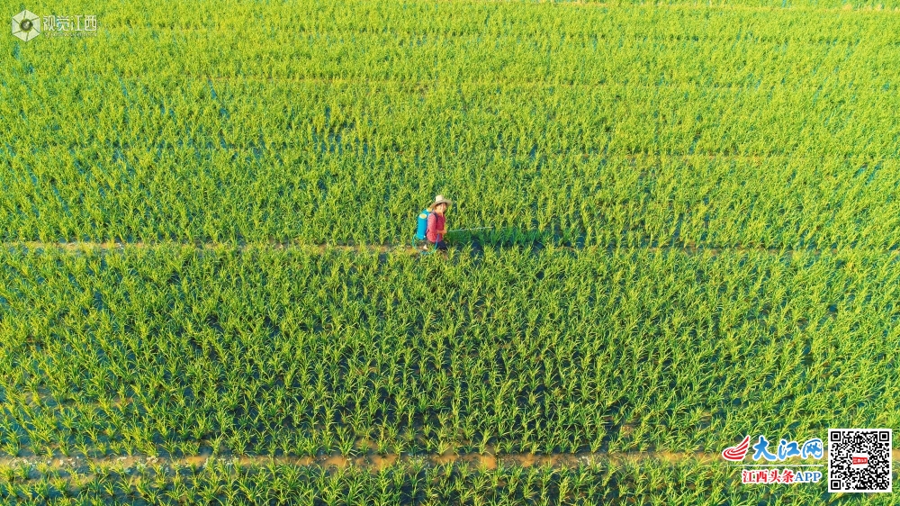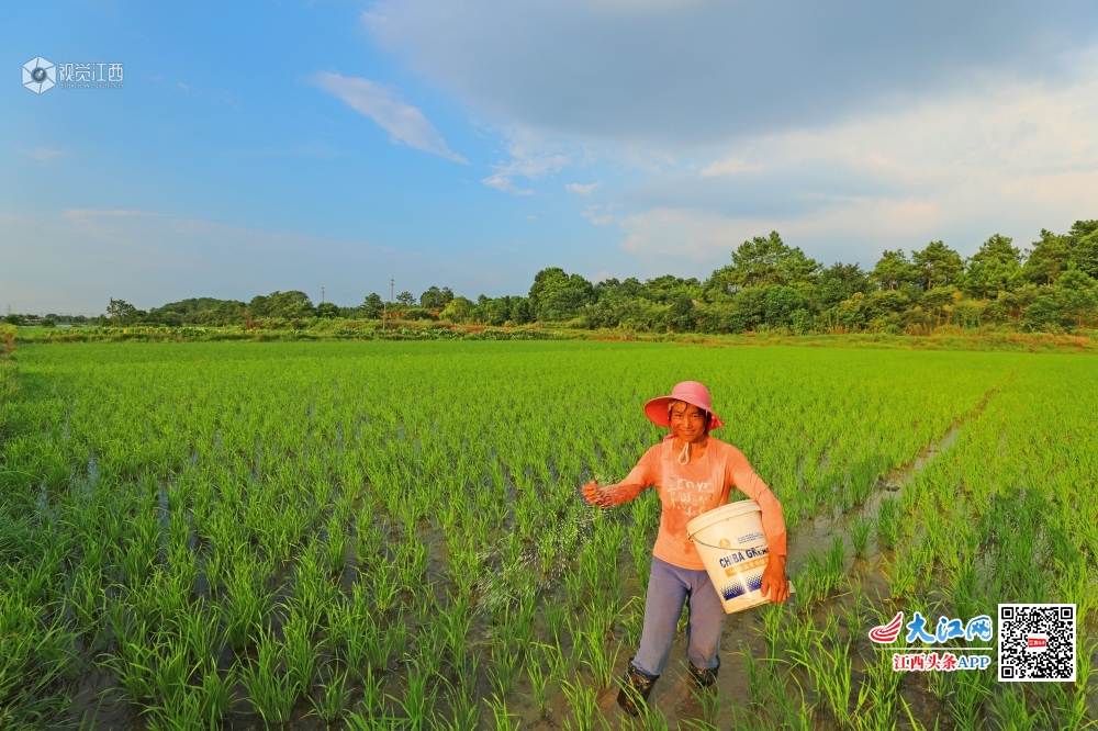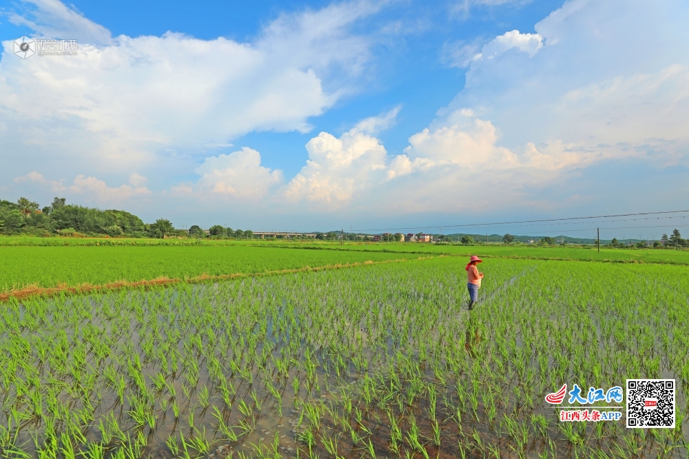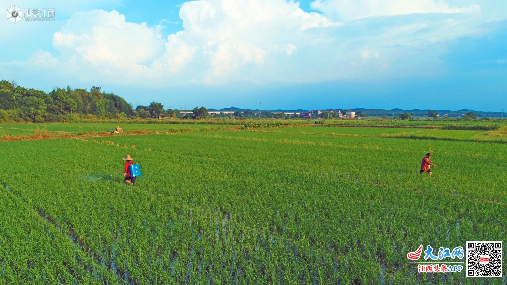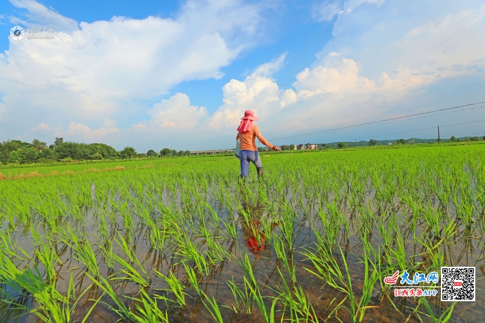 7月28日,在江西省吉安市泰和县塘洲镇土洲村,农民抢抓农时在田间劳作,对晚稻进行管护。