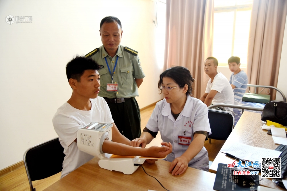 2019年8月1日上午,在江西省南丰县征兵体检站,体检医师正在一丝不苟的为报名参军的适龄青年进行征兵体检复查。