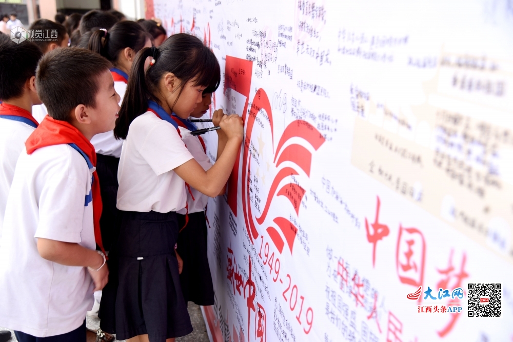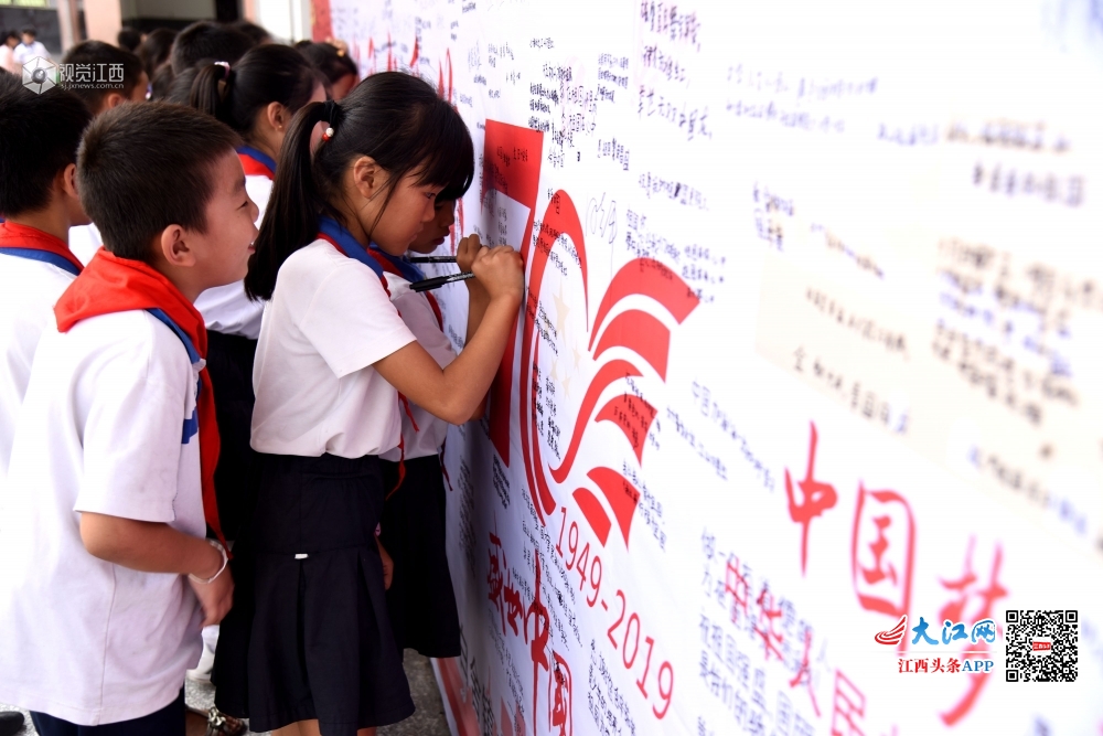 2019年9月30日,江西省南丰县白舍镇中心小学组织师生在“祖国我想对您说”签名墙上开展签名活动,表达师生对祖国母亲的热爱和赞美之情。