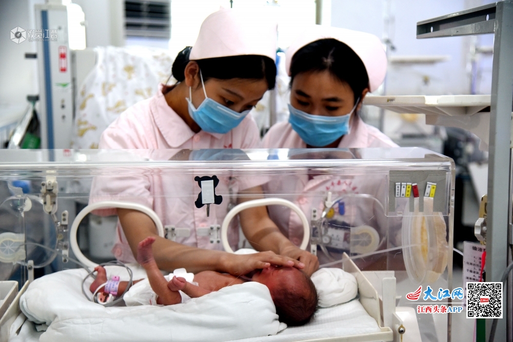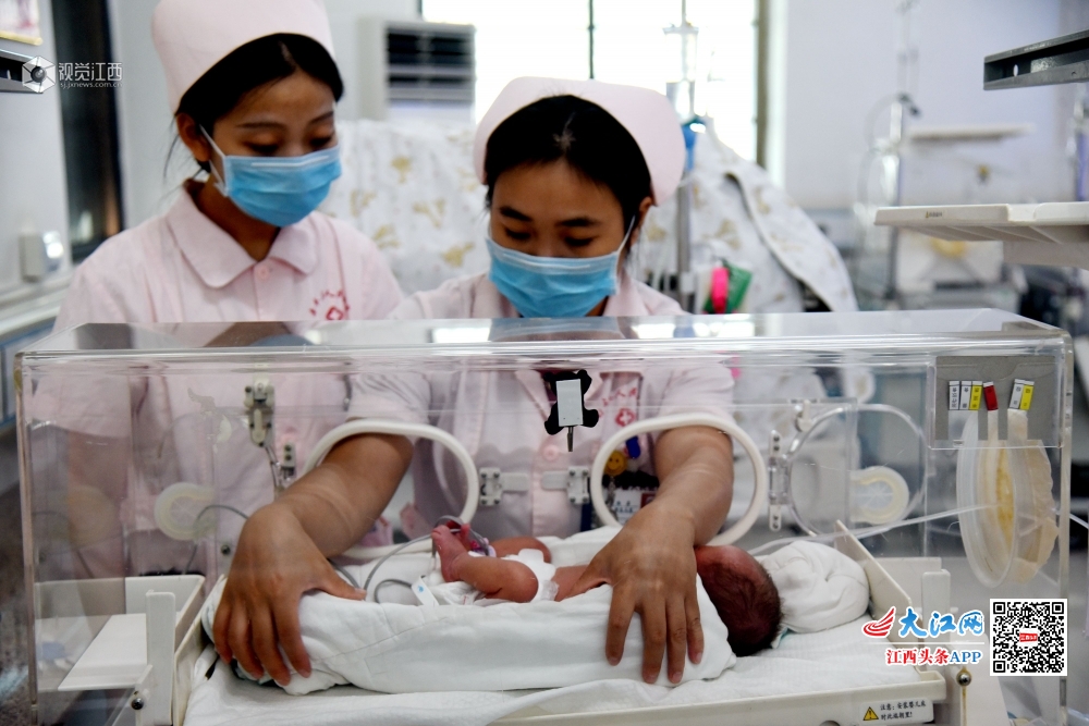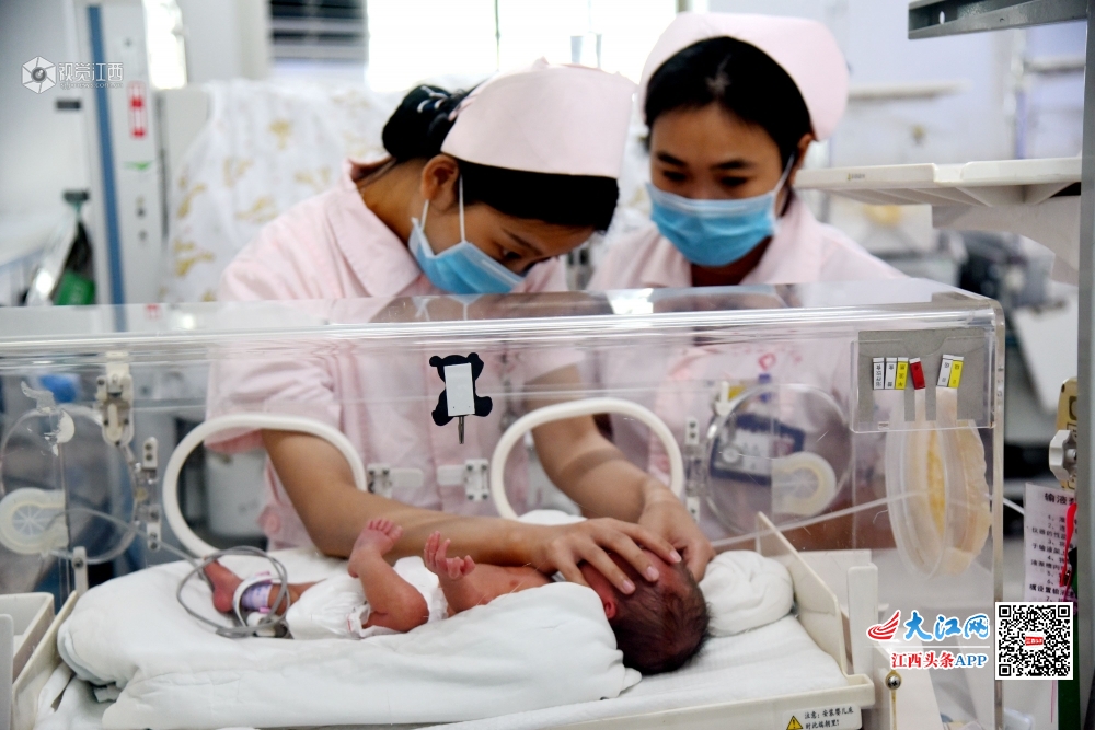 2019年10月1日,江西省南丰县人民医院护士罗宏宇(左)、陆芬(右)在新生儿重症监护室护理婴儿。当日是国庆节,新中国成立70周年纪念日,坚守在各自工作岗位上的人们,以特有的方式庆祝国庆节的到来。