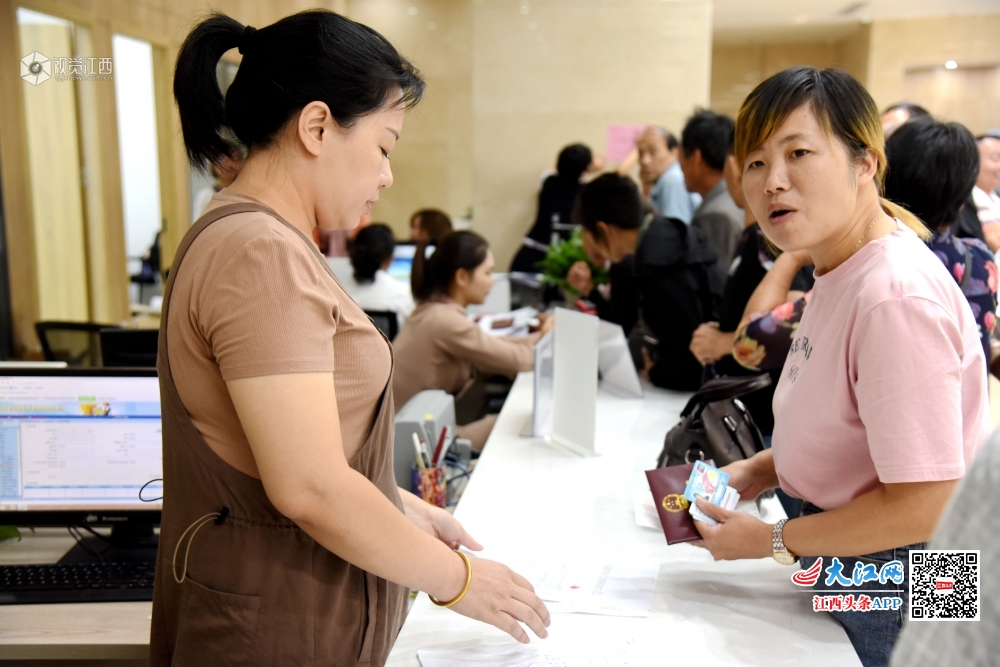 2019年10月9日上午,江西省南丰县行政服务中心办事大厅人社系统服务窗口前,县农保局的工作人员正在办理进驻县行政服务中心首笔城乡居民养老保险业务。
