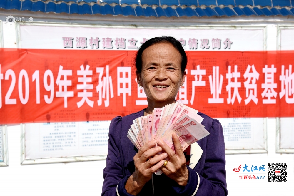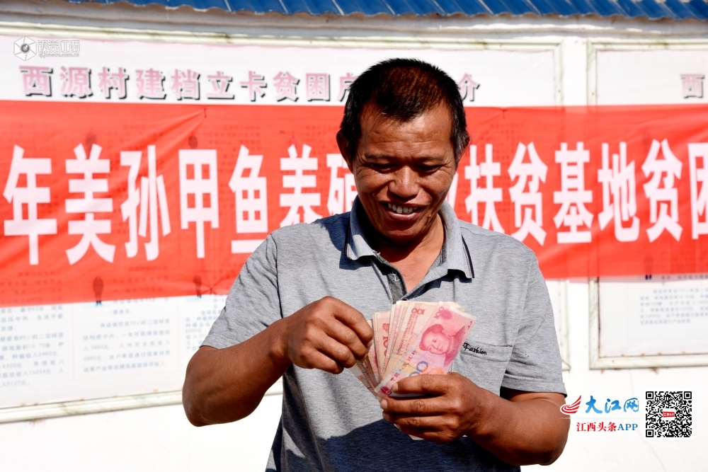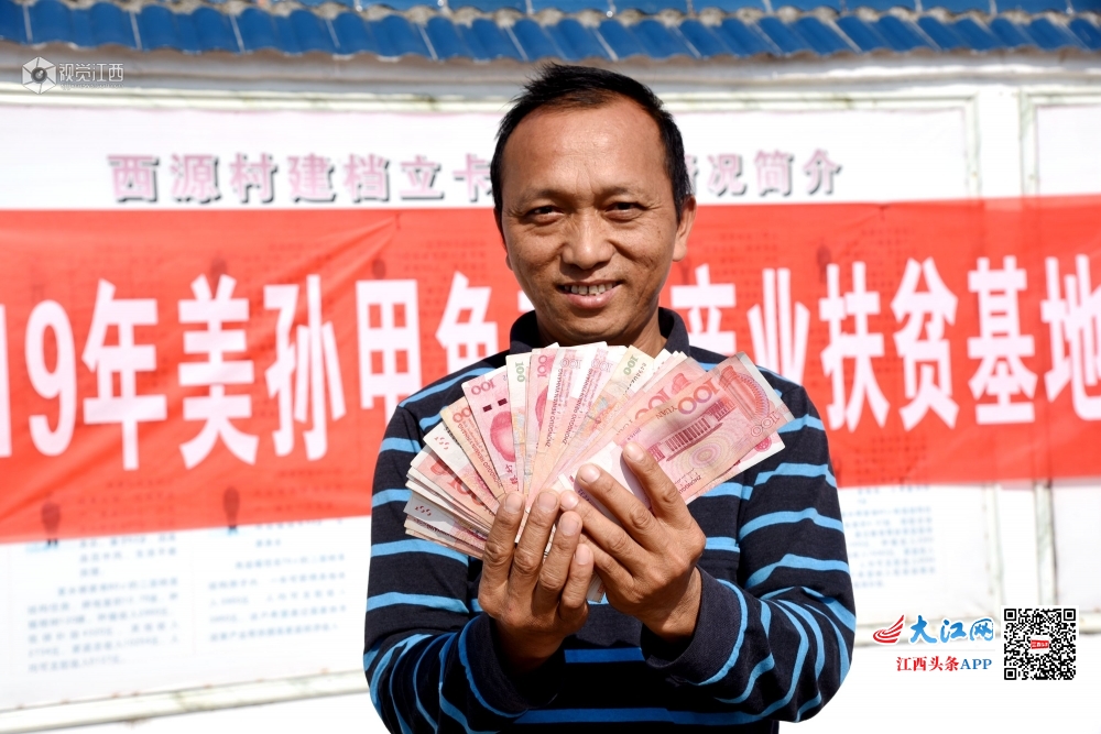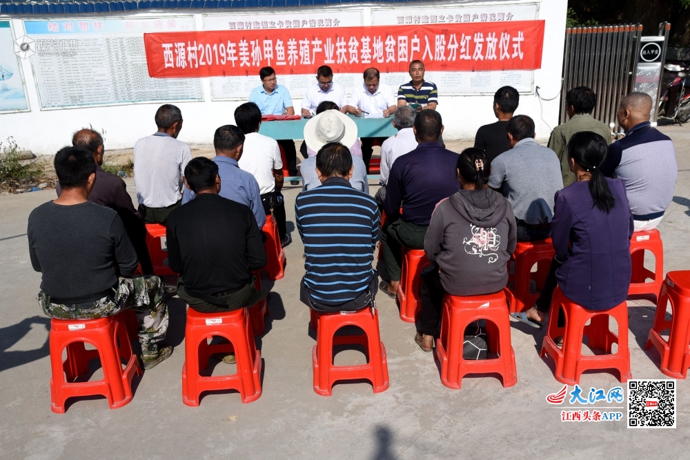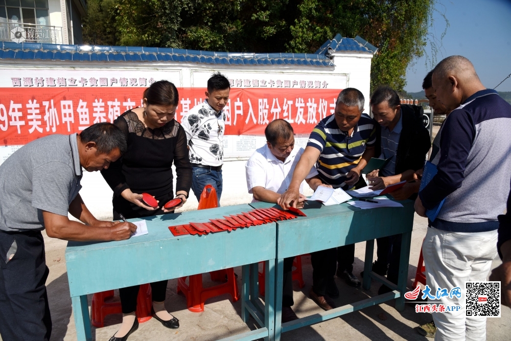2019年10月16日,江西省南丰县桑田镇西源村美孙甲鱼养殖产业扶贫基地,2019年度贫困户入股分红发放仪式在这里举行,21户贫困户高高兴兴地领到了当年的分红款。