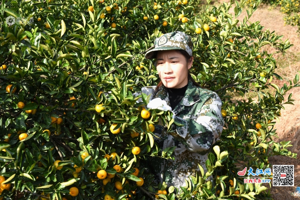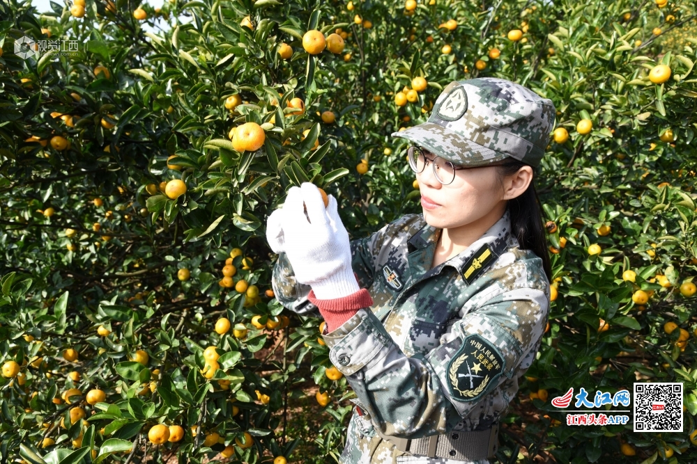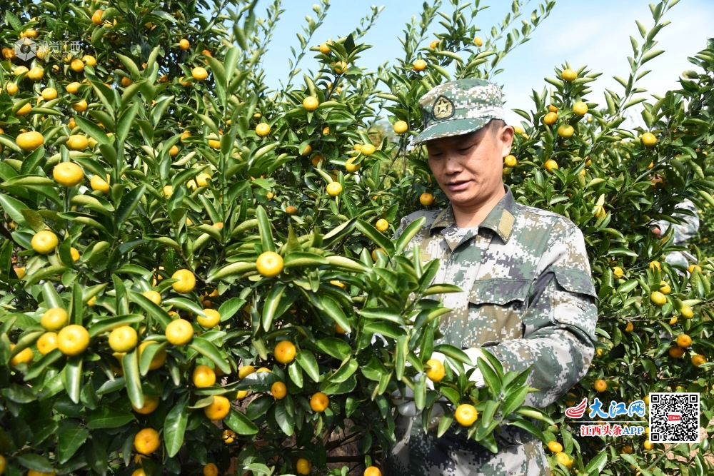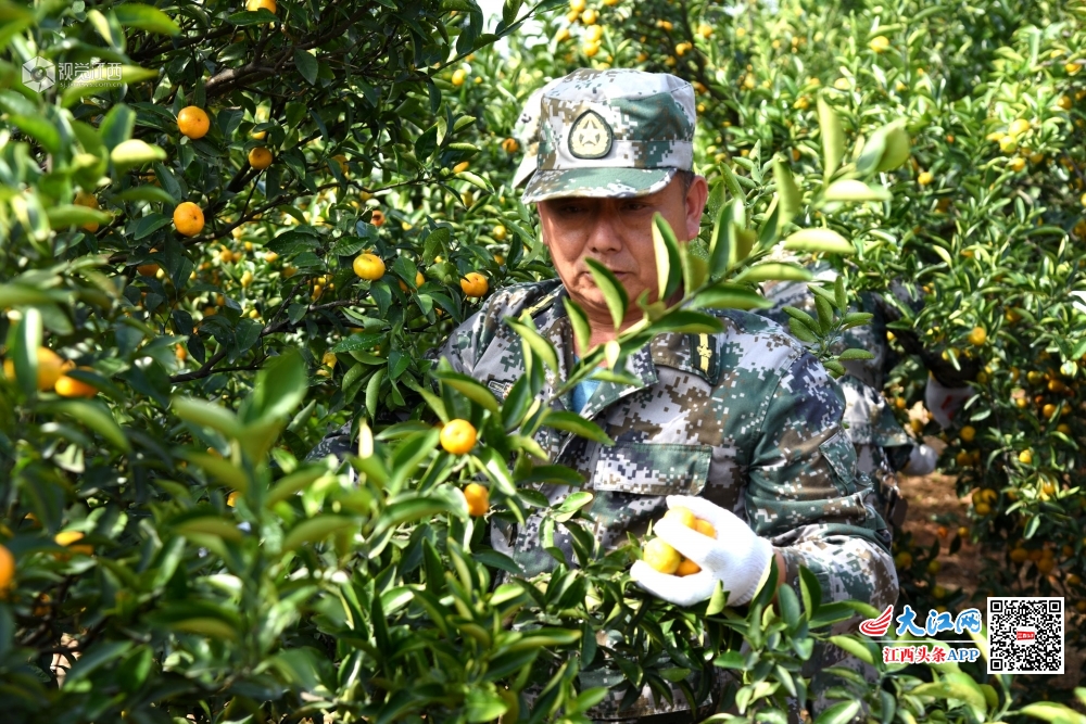 2019年11月11日,江西省南丰县桑田镇曾家丰村上庄村小组桔园里,民兵应急小分队的民兵正在帮助军属采摘蜜桔。