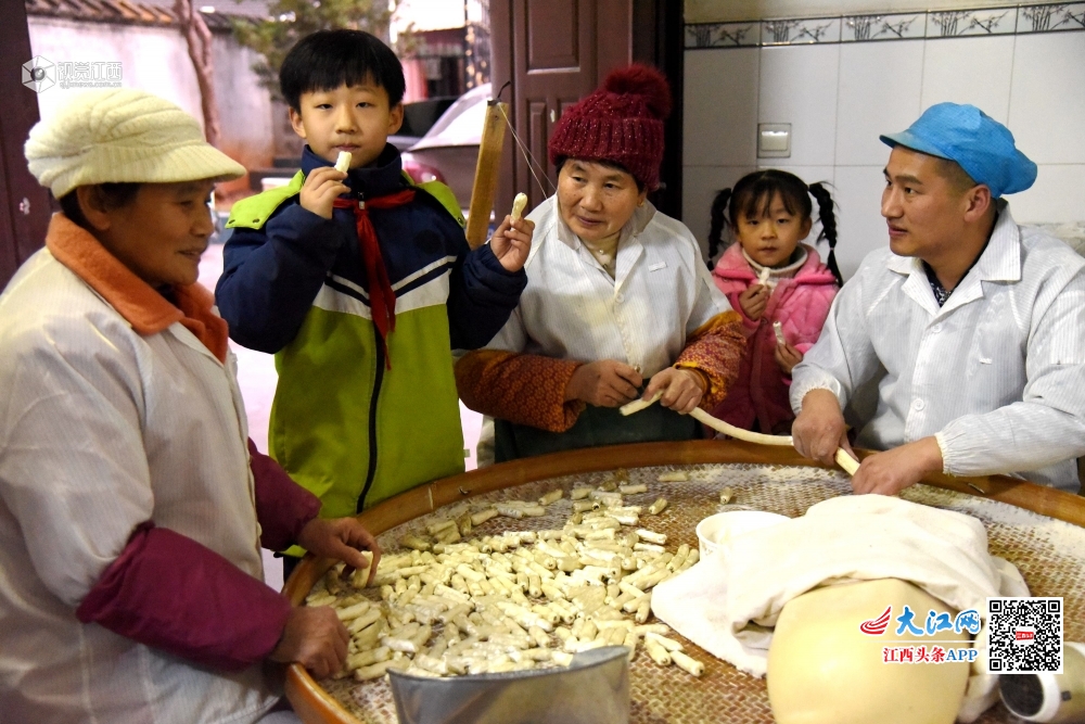 2020年1月8日,江西省南丰县琴城镇徐家边村刘氏灌芯糖厂,刘辉一家人正在加工制作传统美食——灌芯糖,以满足春节消费者需求。