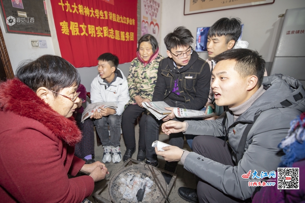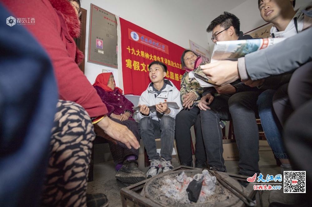 围着火盆,大学生们为老人们讲在苏区接受红色教育时的见闻,讲高铁、讲5G通信。