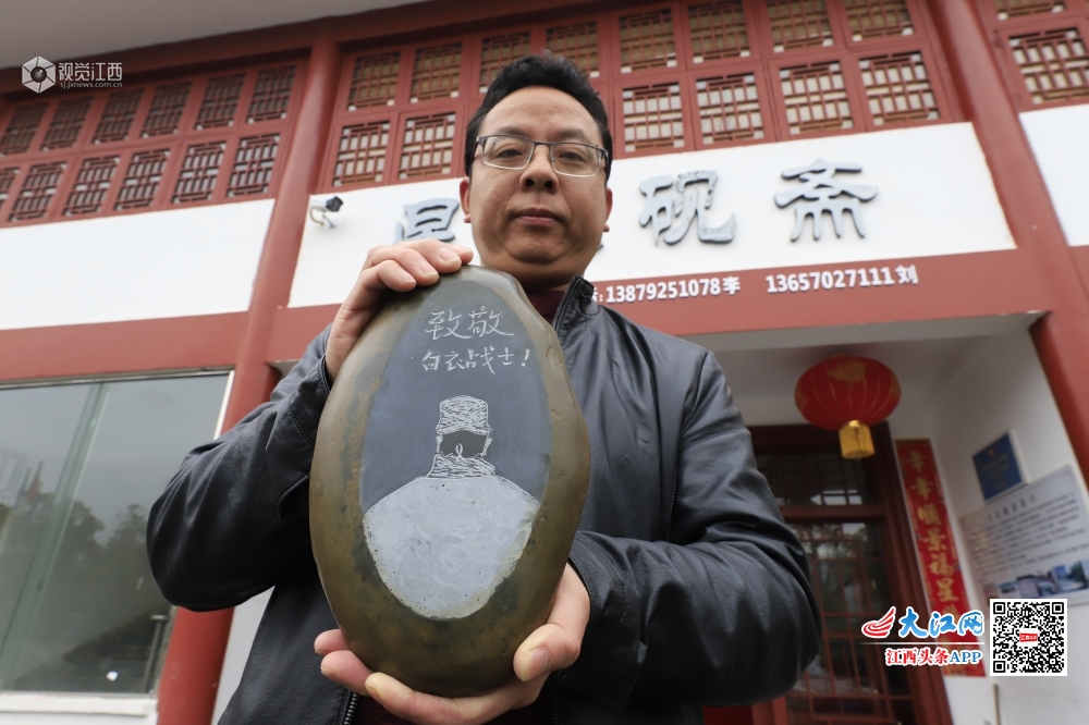 2月10日,江西庐山市金星砚雕传承人李平汉完成了他的文创作品《致敬白衣战士》,为战斗在抗“疫”前线的医务工作者致敬。 《致敬白衣战士》采用一方天然的籽料砚石,分正反两面进行雕刻,正面取材为战斗在抗“疫”一线医务工作者的背影,背面刻有“医者仁心、天佑华夏”几个篆字,右上闲章为“吉祥”二字,左下印章为“同舟共济”四字,采用国家级非物质文化遗产——金星砚雕刻技艺精心制作。 李平汉是国家级非物质文化遗产——金星砚制作技艺省级传承人。在看到身边干部群众投身新冠肺炎疫情防控尤其是医务工作者战斗在抗“疫”一线时李平汉深受感动,特进行构思创作,同时表示要用更多的作品反映全国人民众志成城、共克时艰的伟大壮举。