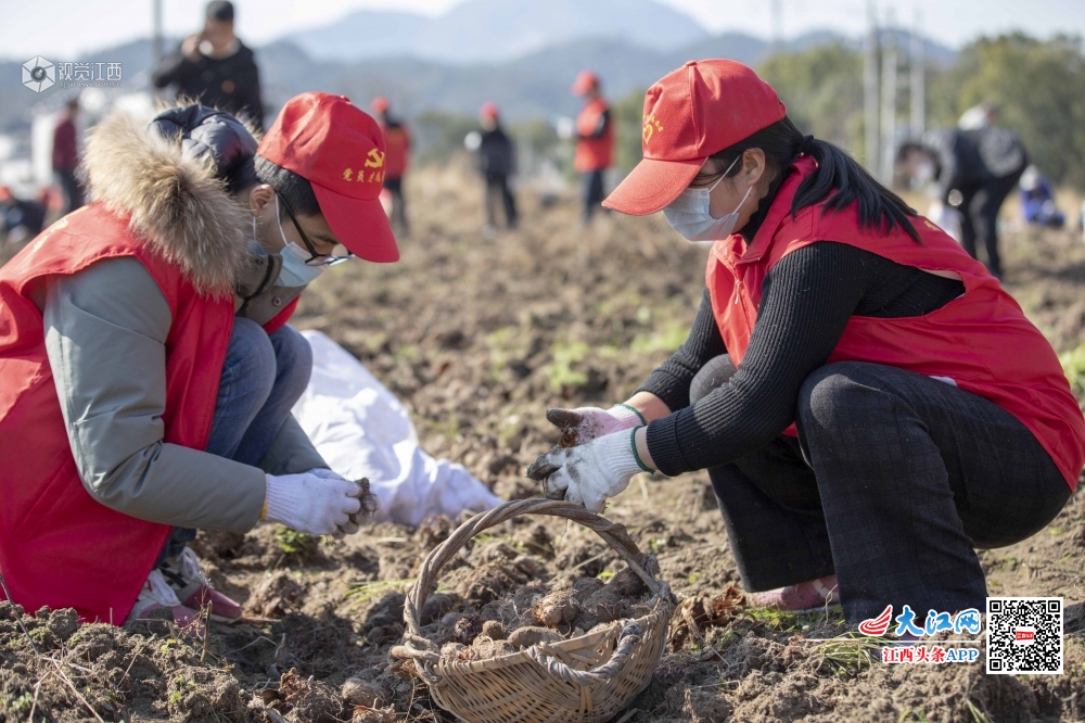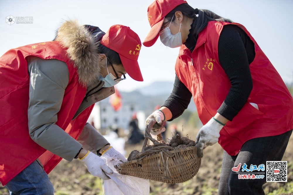2月20日,江西庐山市白鹿镇万杉村扶贫产业基地里党旗飘扬,40多名镇村党员干部在这里帮助贫困户抢收毛芋。 江西庐山市白鹿镇万杉村是“十三五”省级贫困村,村“两委”积极探索“基地+合作社+贫困户”模式,示范带动党员群众发展毛芋头产业,种植面积65余亩,产量10万斤,带动贫困户就业10人,可支撑贫困户105户344人达到稳定脱贫。 春节前,村里的贫困户集中收获了8万斤毛芋,受疫情影响,地里还有近2万斤毛芋无法收获。当前春季到来,再不收获这些毛芋将烂在地里。针对这一情况白鹿镇党委急贫困户所急,组织开展党员活动日,40余名党员干部全上阵,大家挖的挖、扛的扛,帮助贫困户解决生产难题。同时,镇村两级采取线上线下共同销售的模式,帮助贫困户找销路,面向市民开放扶贫基地,鼓励市民到基地体验采收,确保扶贫果实真正惠及贫困户。