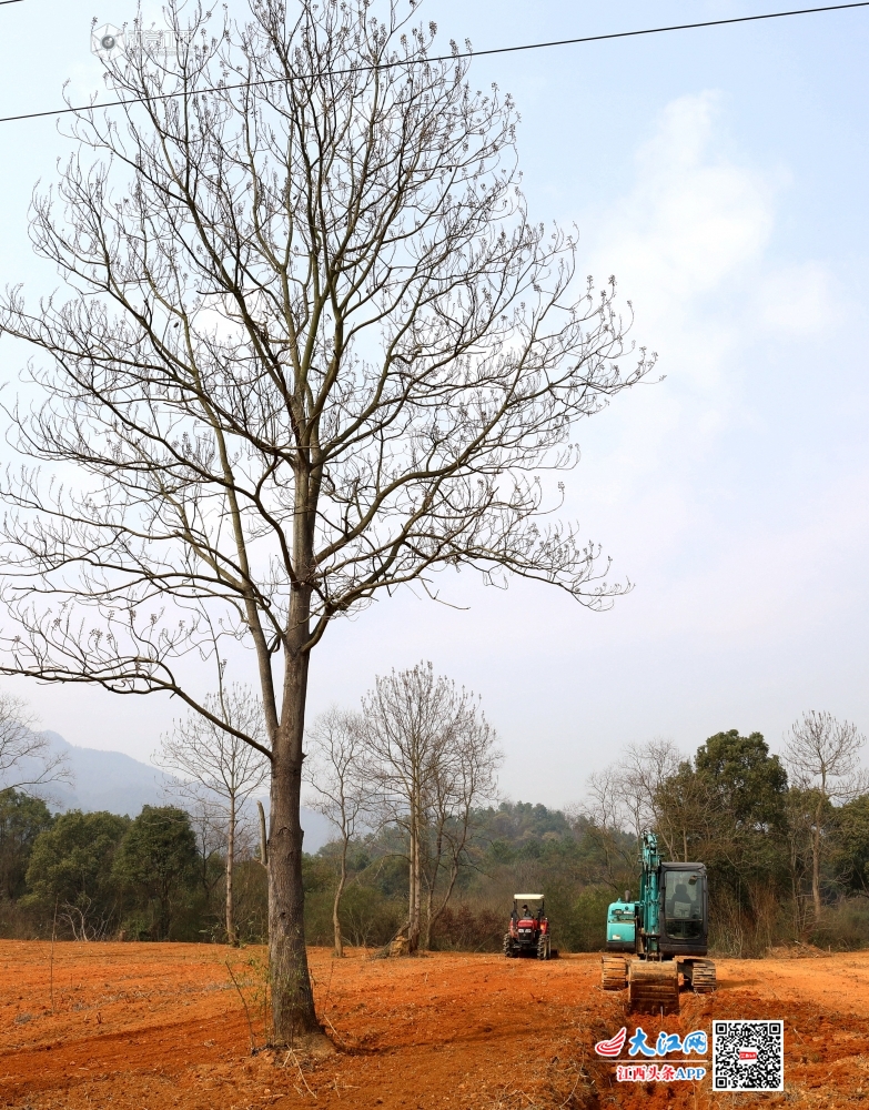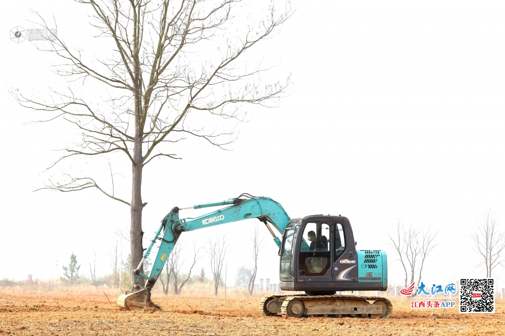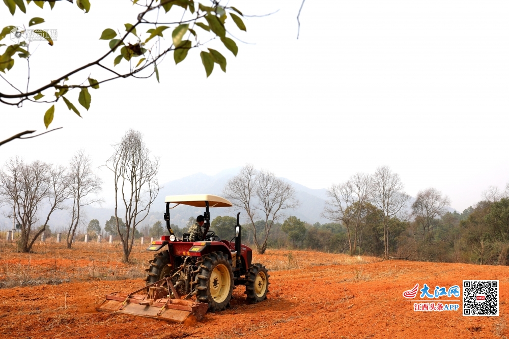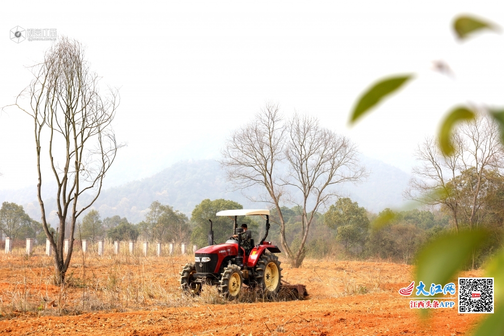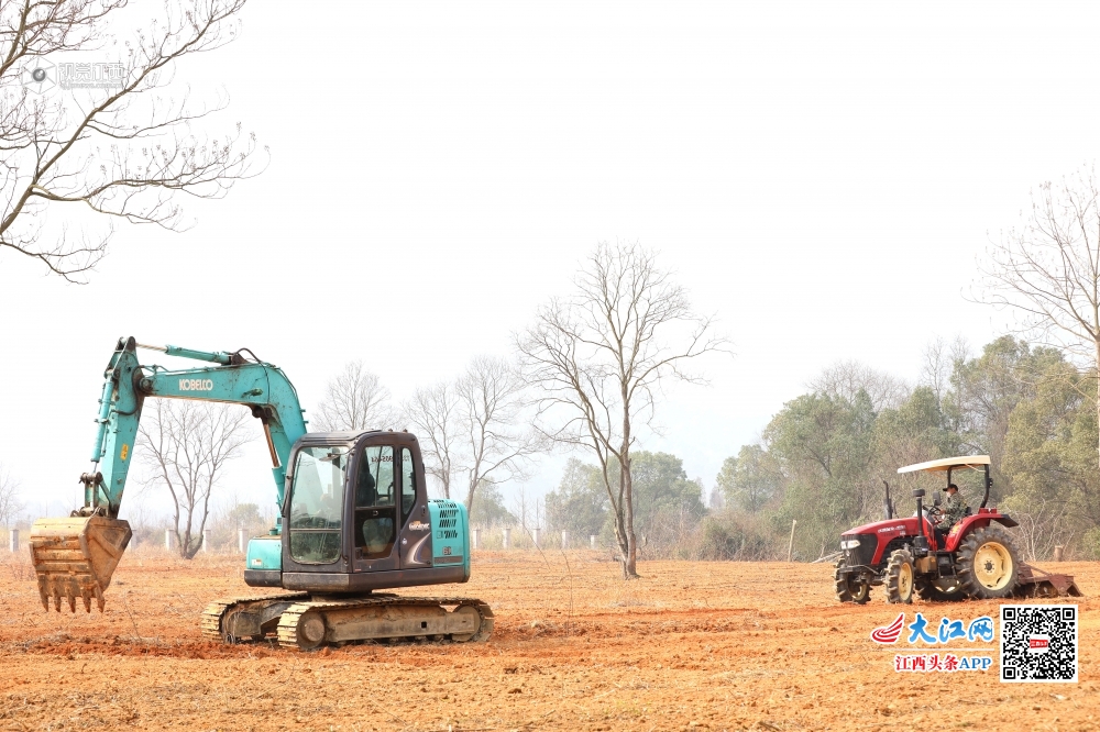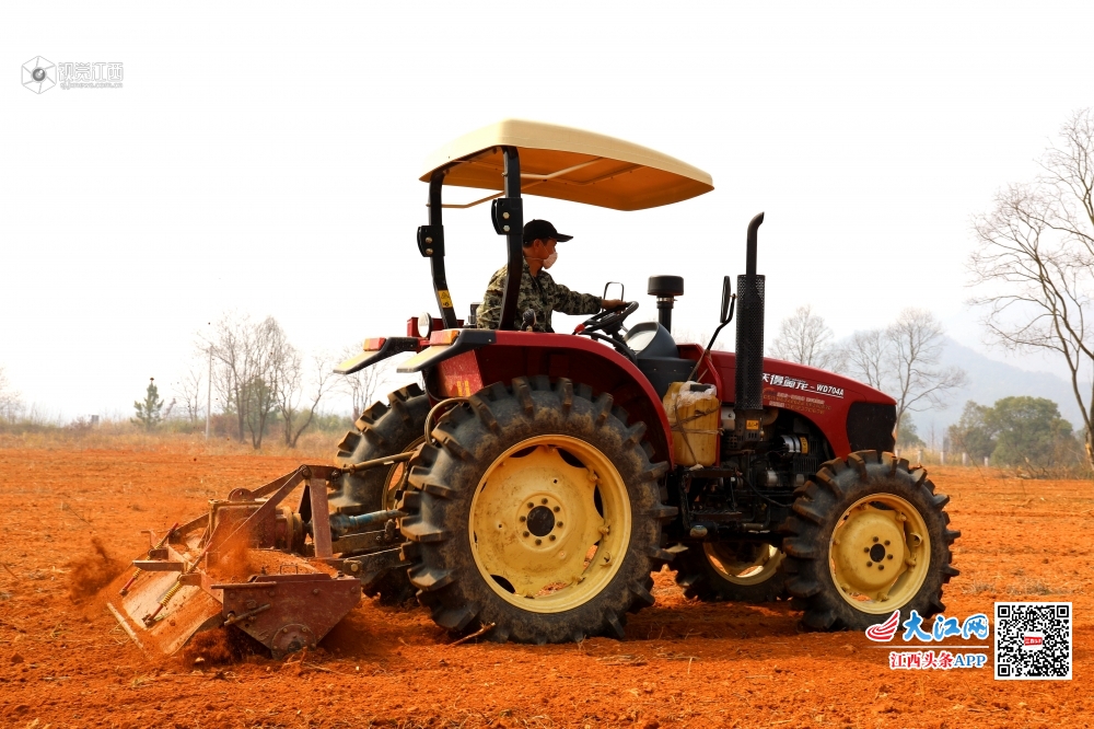 2月26日,江西省分宜县分宜镇万溪村肖公庙荒山地,戴着口罩的农户开着旋耕机、挖掘机正在荒山地里翻耕泥土。