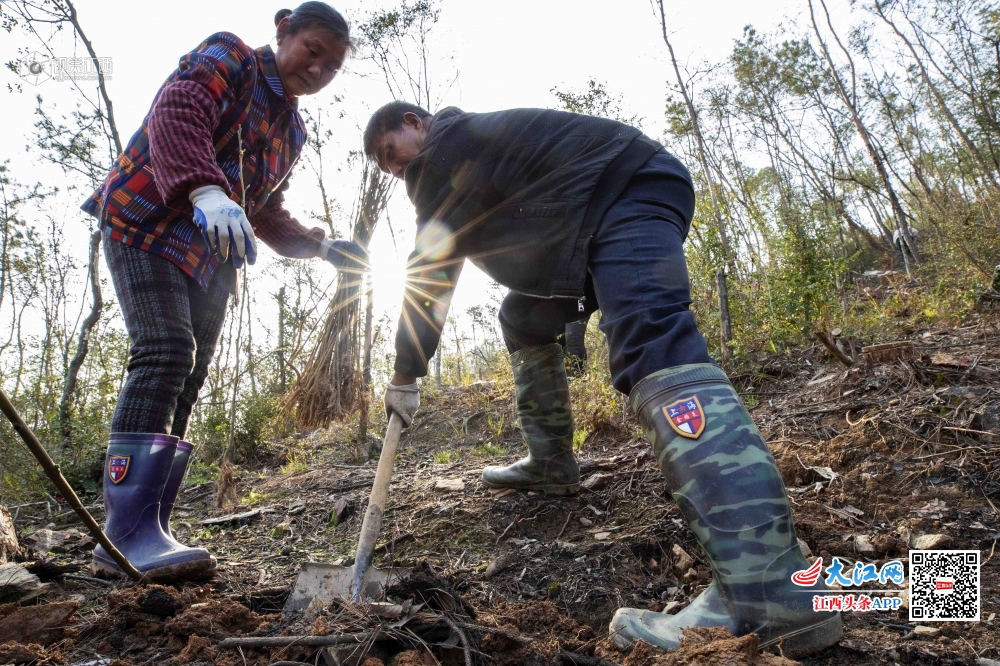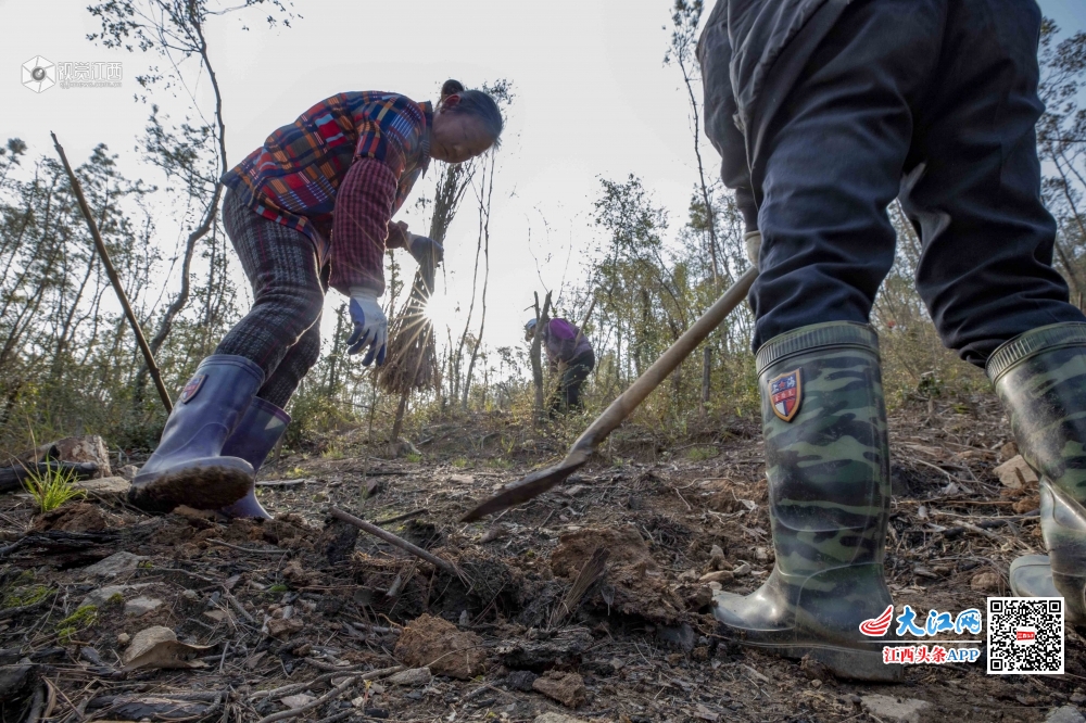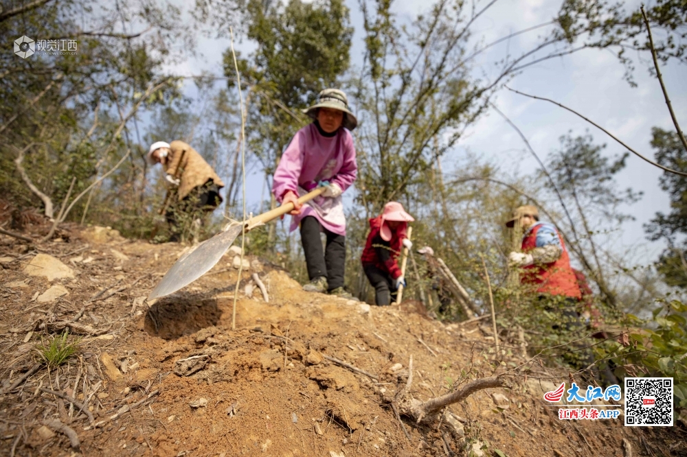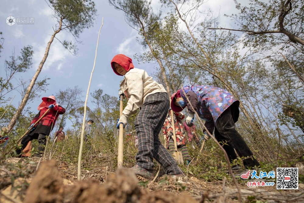植树节即将到来之际,江西庐山市干群共赴“春天的约会”纷纷扛上铁锹,植树造林,为山川添绿。图为3月10日,江西庐山市白鹿镇一手抓防疫,一手抓低产林改造项目,抢抓晴好天气组织群众开展植树造林活动,总面积1050亩。