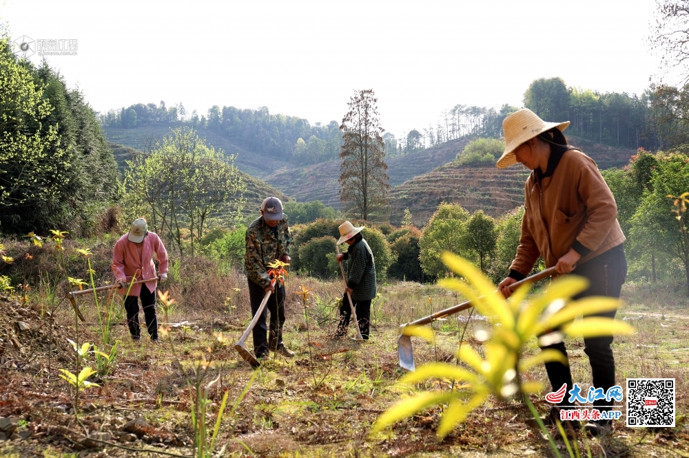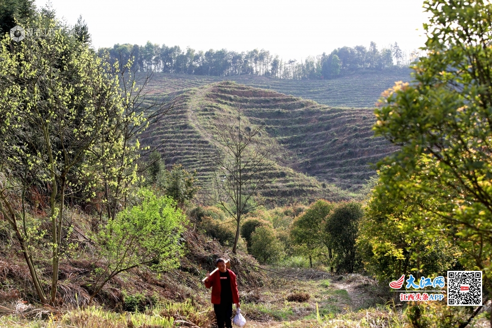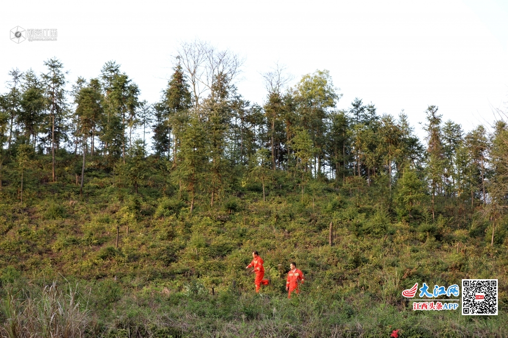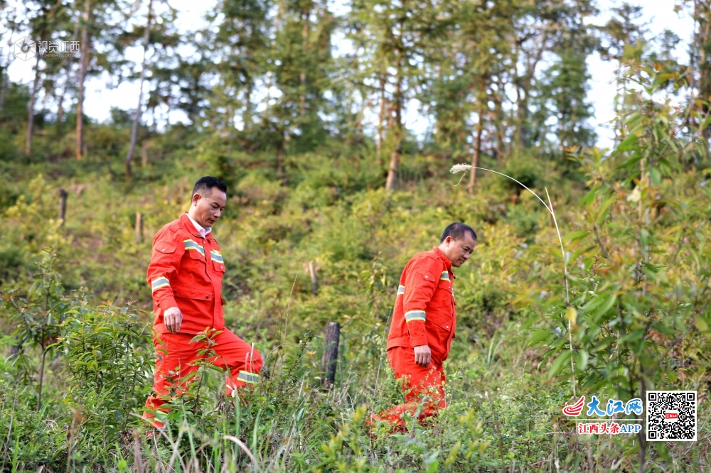 3月20日,江西省分宜县林业局防火办工作人员在该县昌山生态林场贺元分场的山林里巡护生物防火林带苗木长势情况。