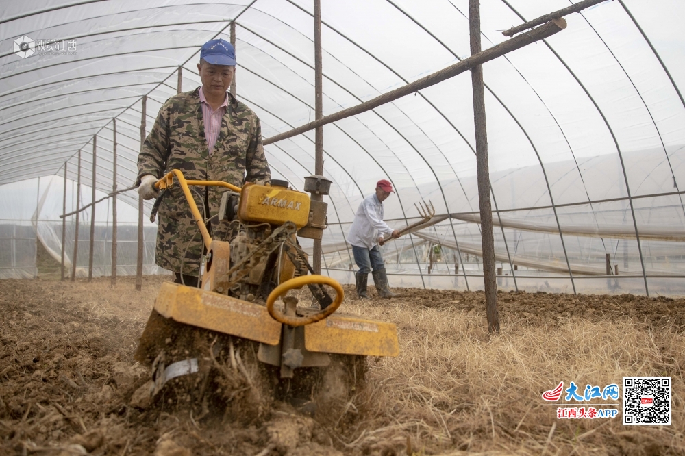 3月22日,庐山市蓼南乡桥南村天滋大棚蔬菜合作社扶贫基地,贫困户们忙着在秧田里疏浚排水沟渠、在大棚里除草、耕地。该合作社是2019年成立的扶贫产业项目,总面积47亩,年产量30万斤。生产的蔬菜直接销往中快餐饮集团,形成产供销一体产业链,助力脱贫攻坚,促进村级集体经济收入。