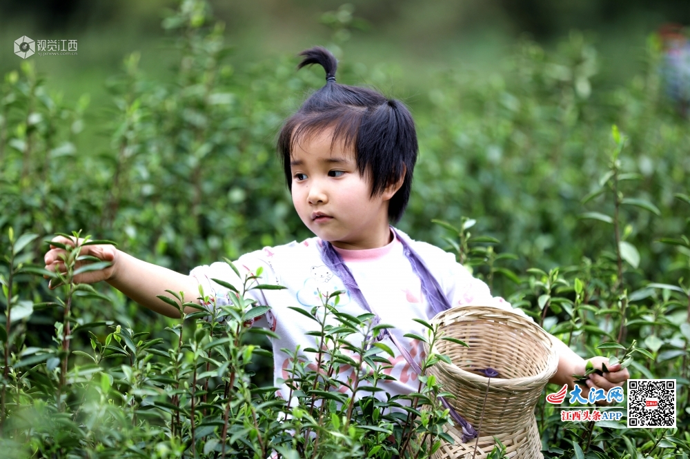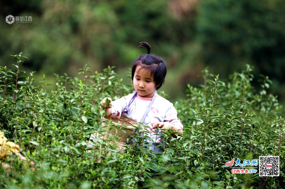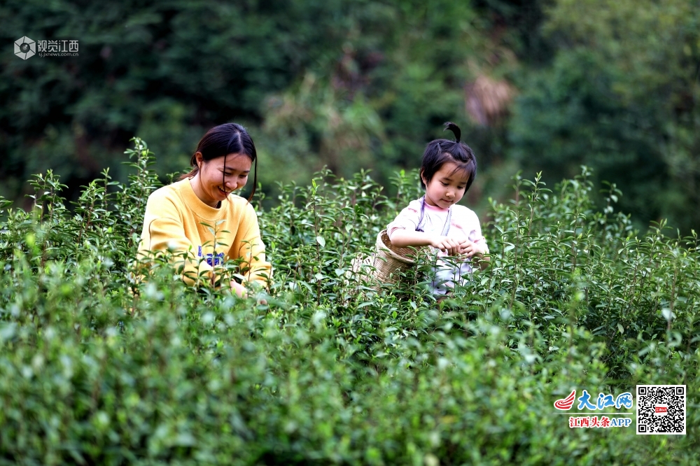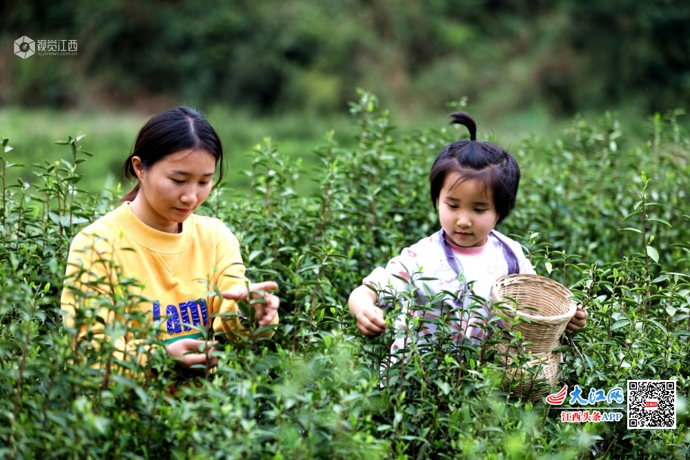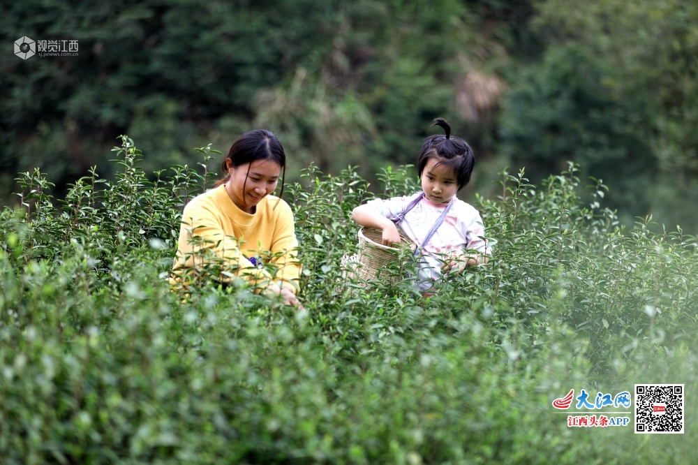 3月25日,江西省分宜县钤山镇金鸡布村扶贫产业茶园基地里,400多亩成龄茶树已经抽出嫩芽,当地村民周女士带着6岁女儿前来茶园体验采摘春茶的乐趣,享受美好春光。