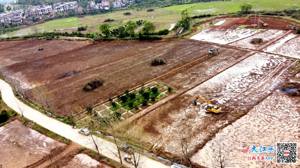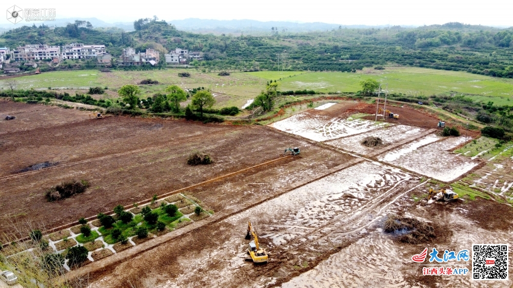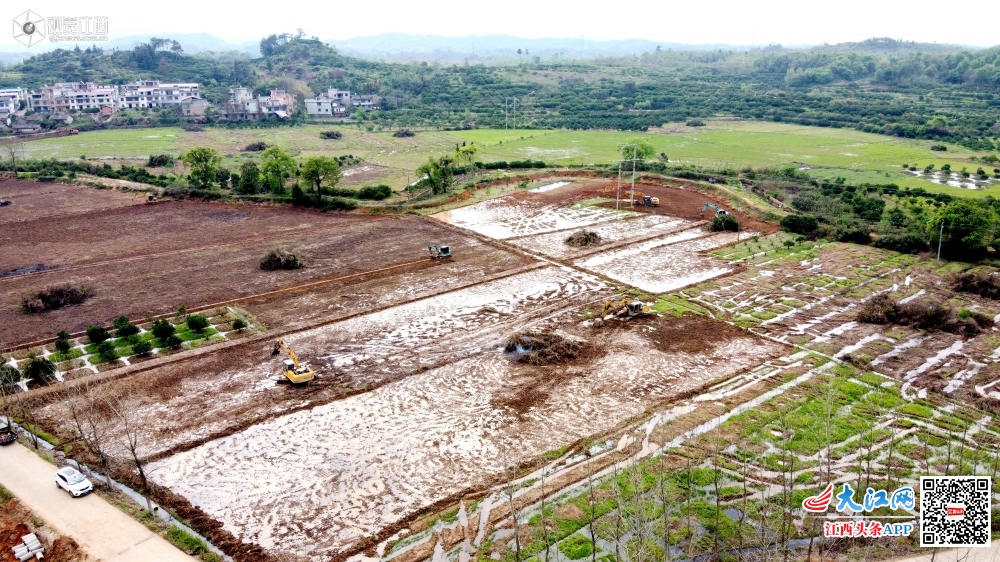 2020年3月26日,无人机拍摄江西省南丰县洽湾镇上店村“退桔还田”高产良田建设现场,几台机械来回穿梭作业忙,力争“退桔还田”高产良田能够栽种上早稻。