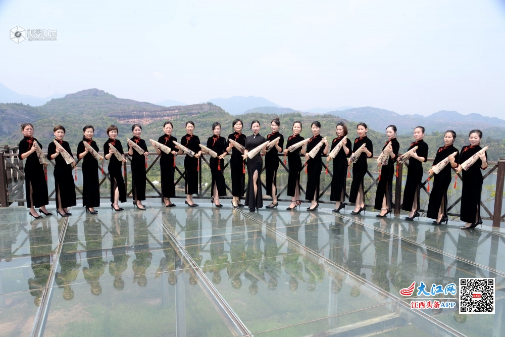 2020年4月10日,江西省抚州市南丰县观必上景区观景台上, 20名旗袍爱好者身着黑色旗袍尽展靓丽风采。