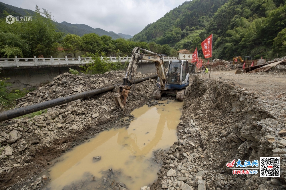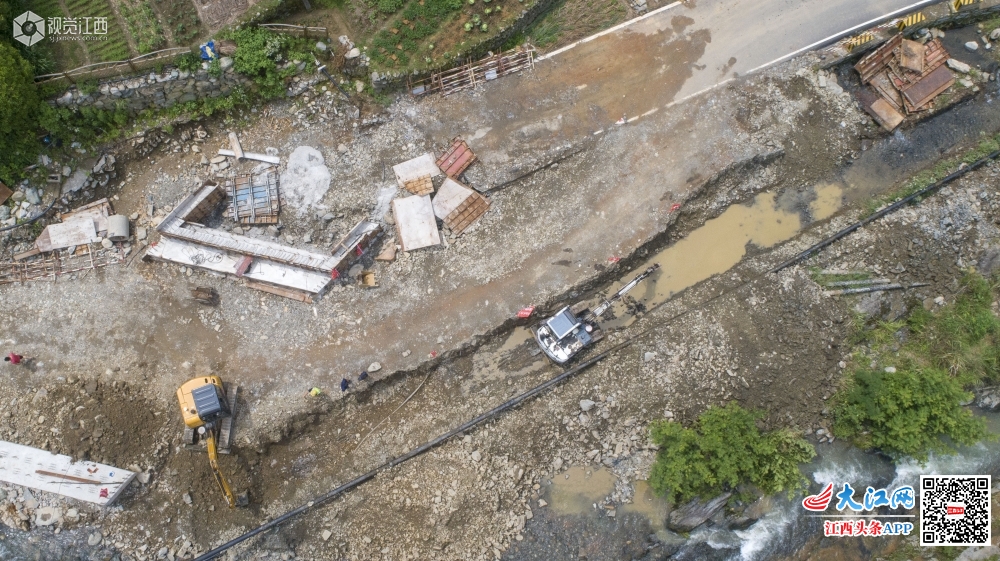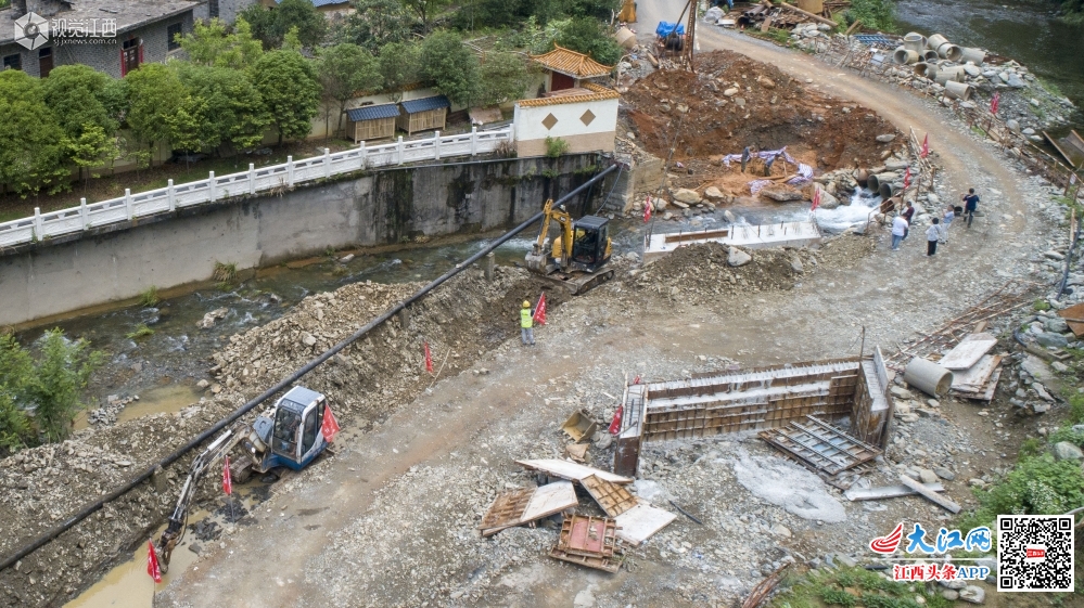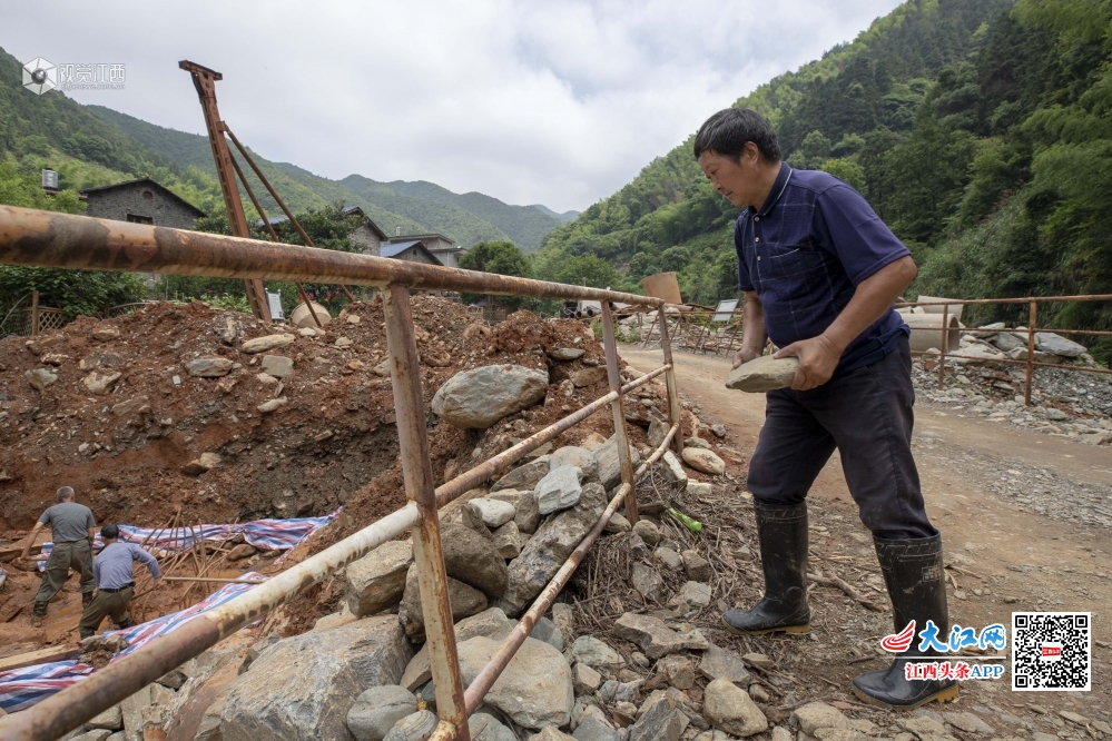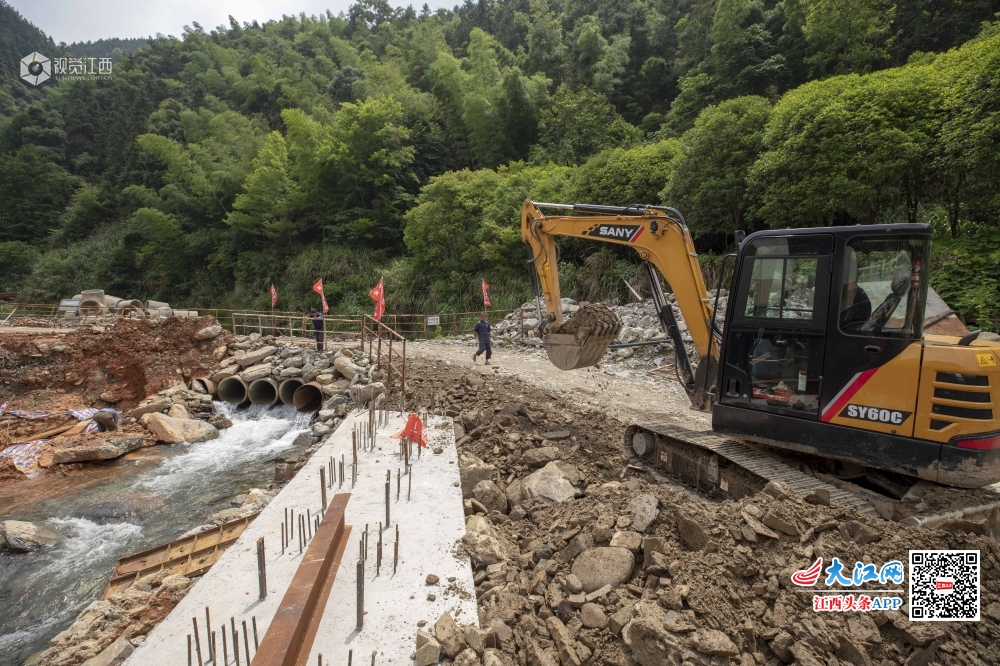 6月6日,江西省庐山市温泉镇桃花源村,贫困户吴升木在修建通村公路桥的工地上干活,这段桥修通后将解决村民们出行难的问题,为今后村里发展旅游产业铺平道路。
