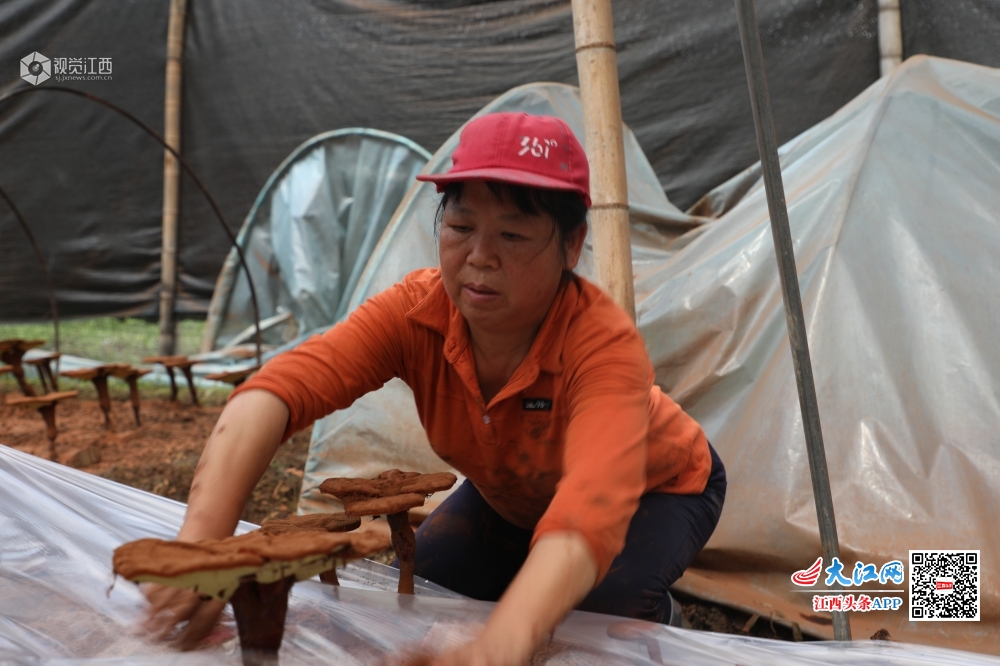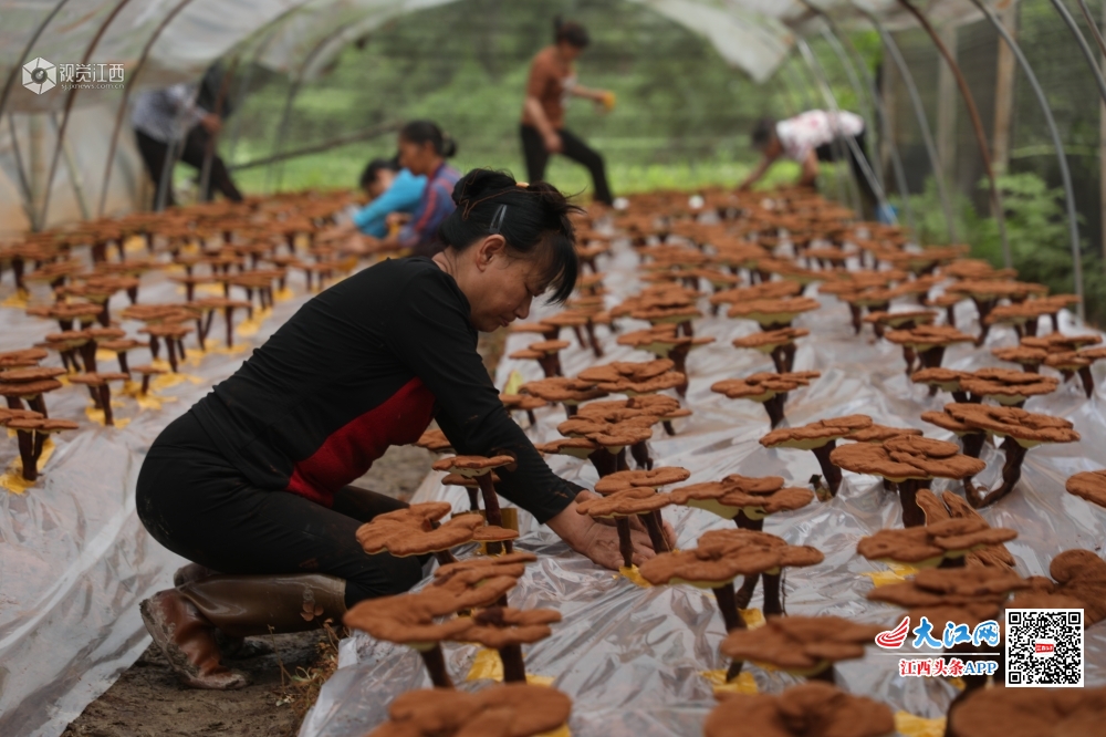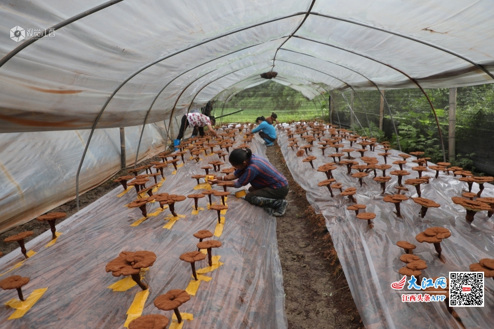 6月11日江西泰和县老营盘镇扶贫产业灵芝孢子粉管护,带动周边贫困户、村民20余户就业,增加收入。