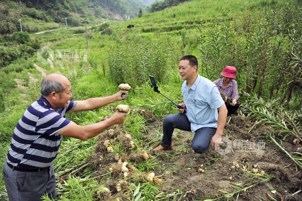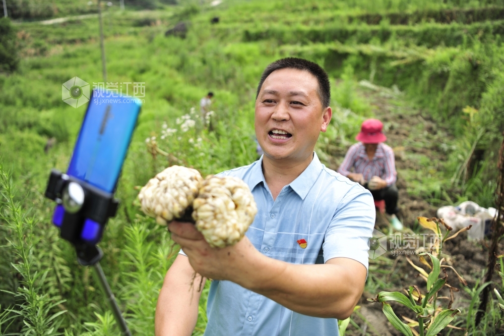 2020年6月22日,在江西省宜春市万载县白水乡老山村,党员干部谢启亮正在直播销售刚出土的百合。