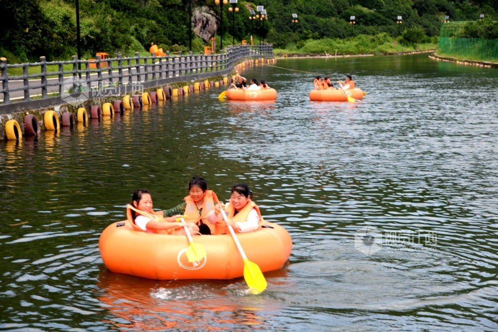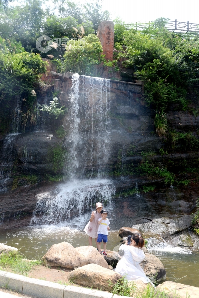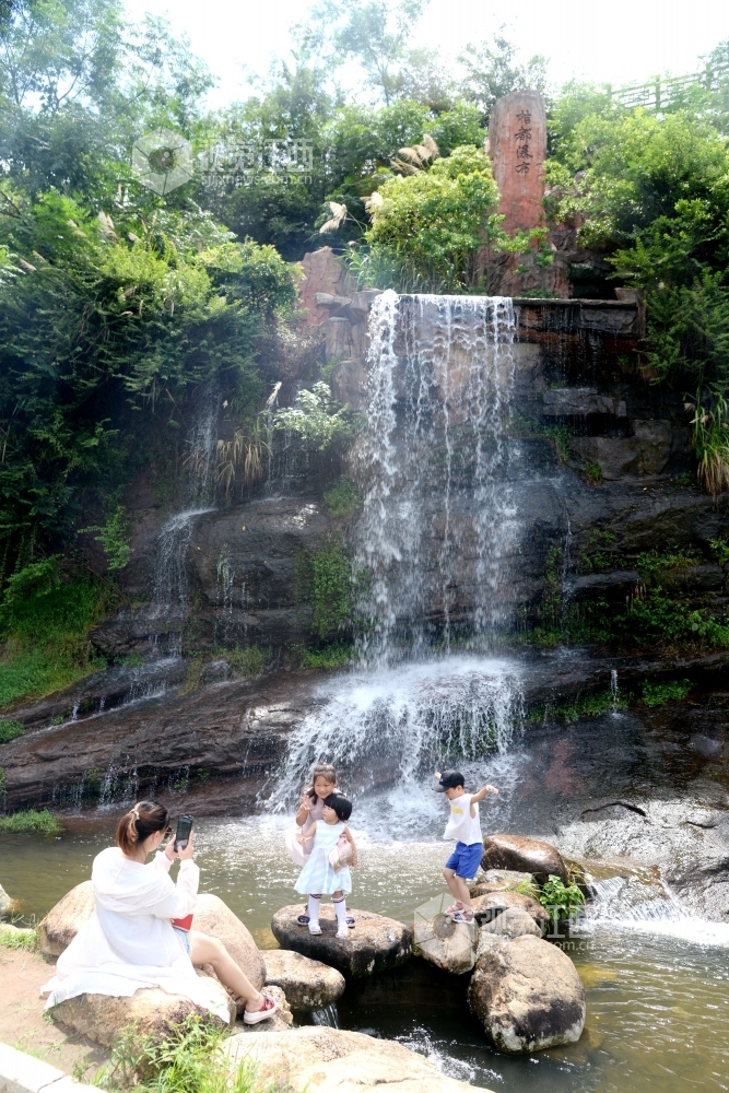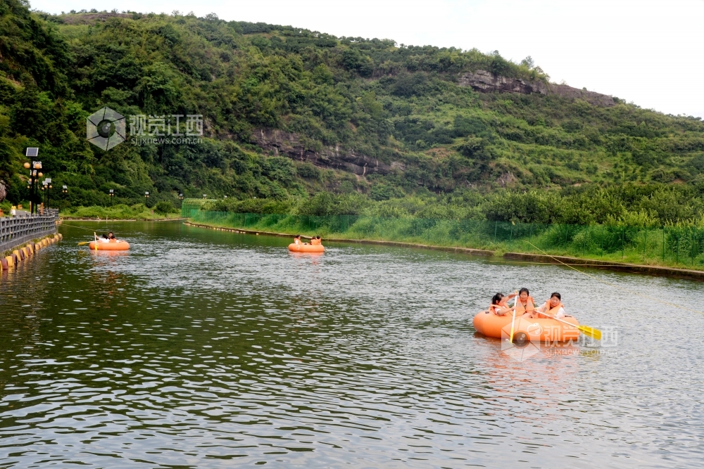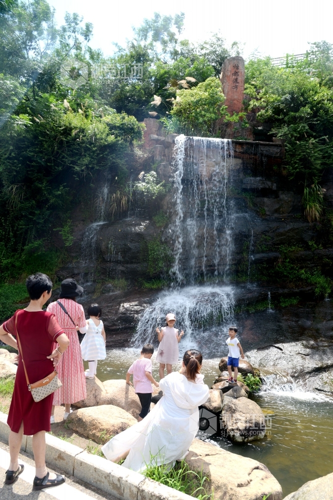 2020年6月27日,江西省抚州市南丰县观必上乐园景区桔漂水渠里和桔都瀑布旁,游客正在观光拍照,乐享夏日清凉。夏至过后,南丰县观必上乐园景区利用水上桔漂项目吸引游客感受万亩桔园恢弘壮观、如诗如画的美景,带动当地旅游经济发展。