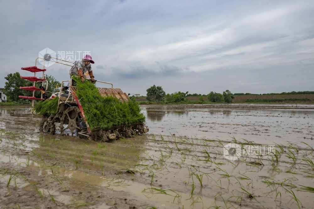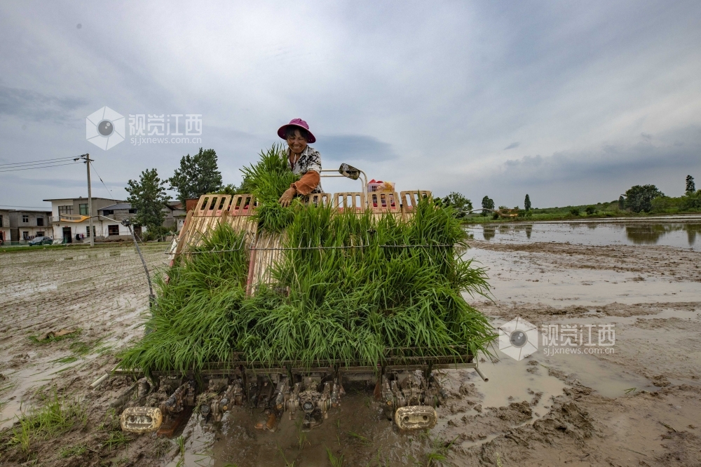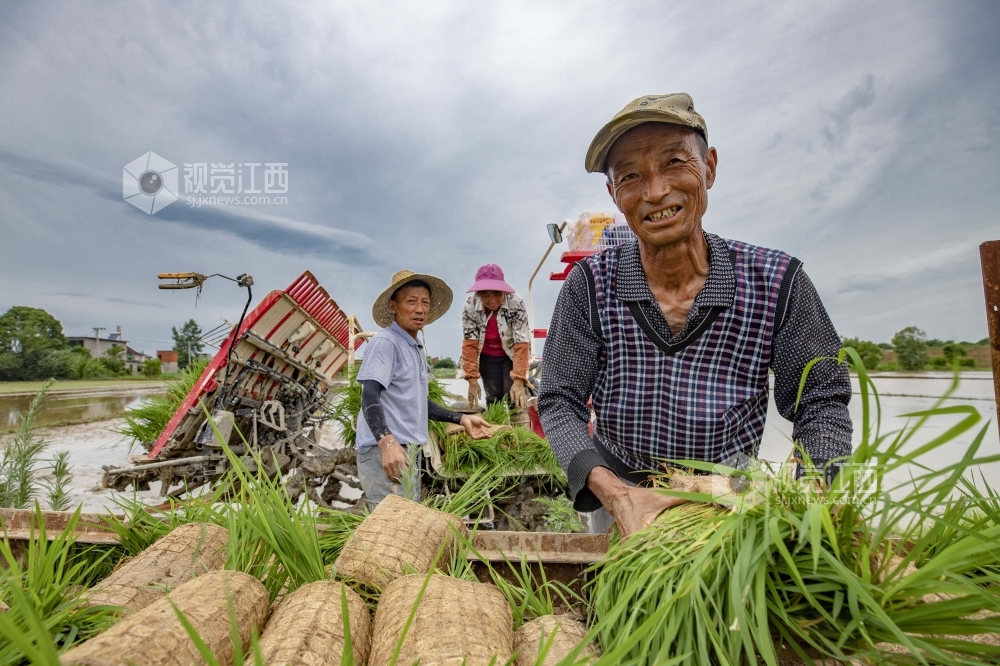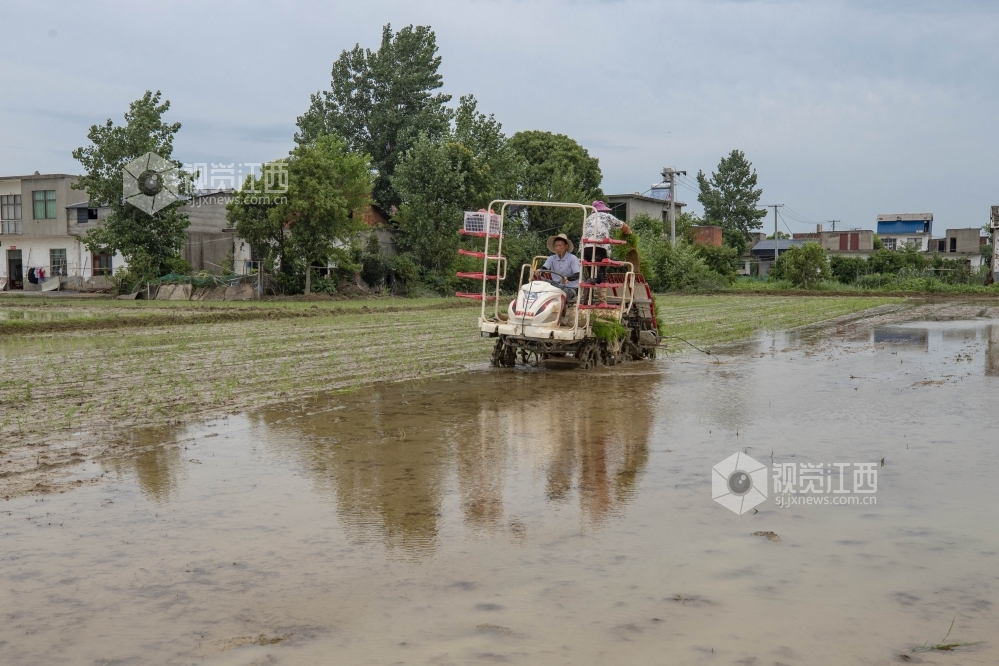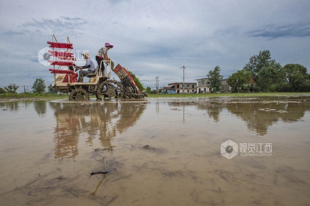 6月28日,在江西省庐山市一家粮食种植农民专业合作社的种植基地,农民正在栽插中稻。