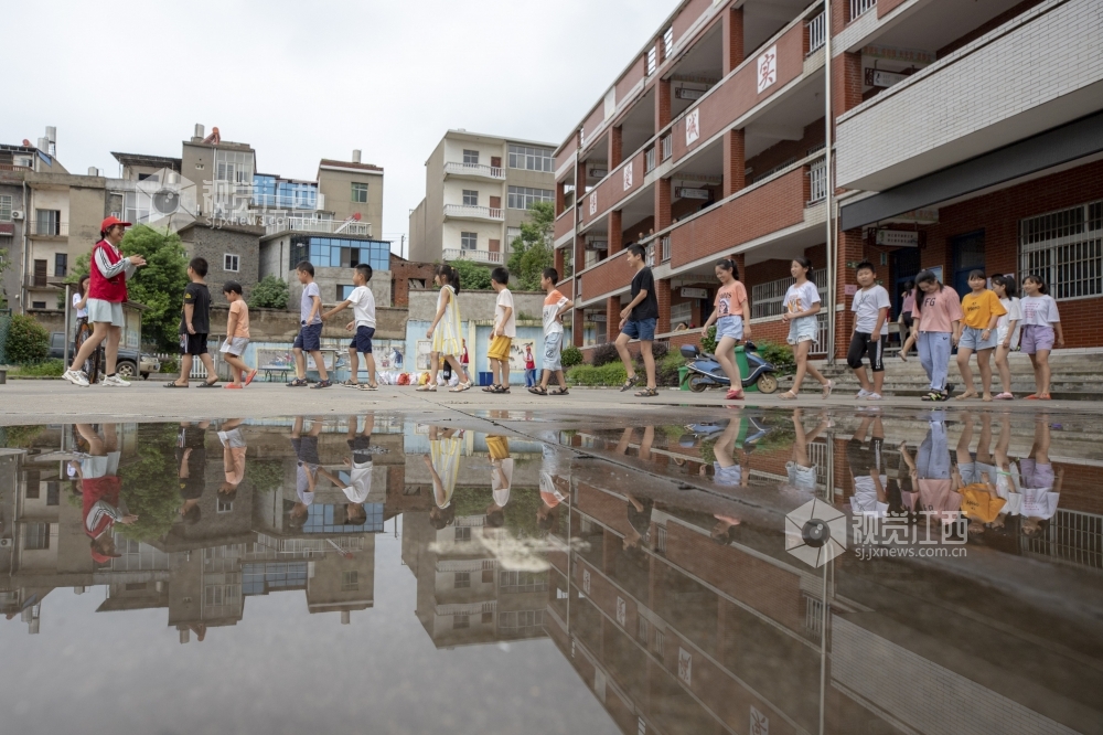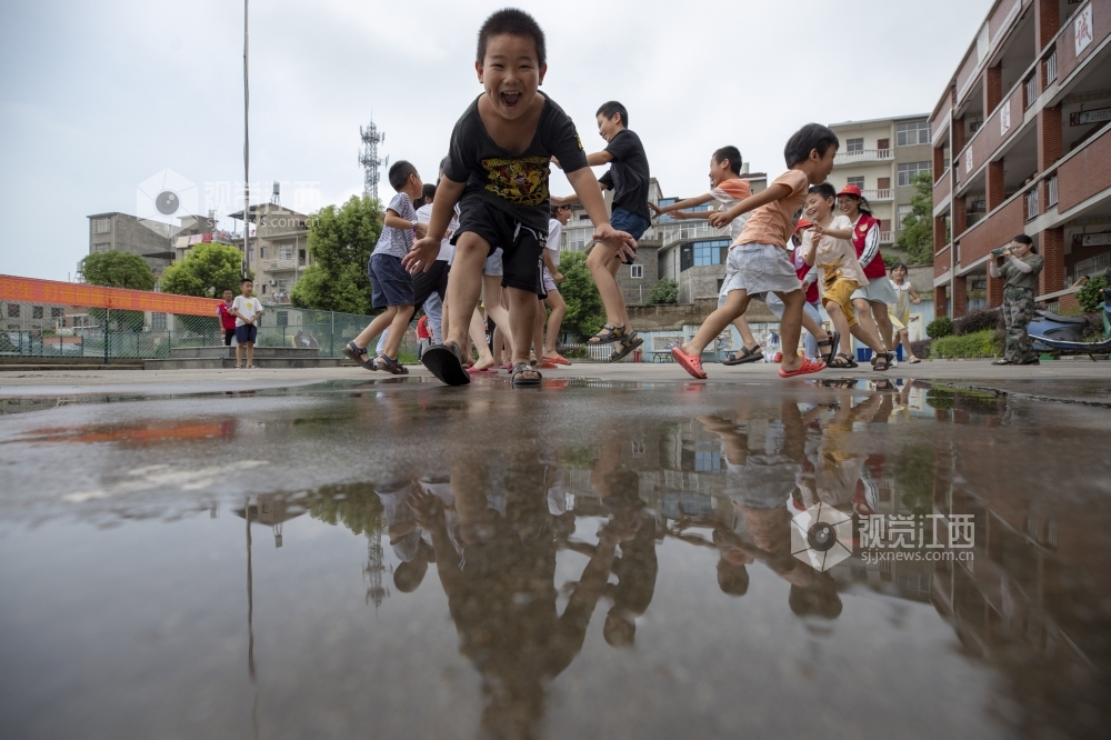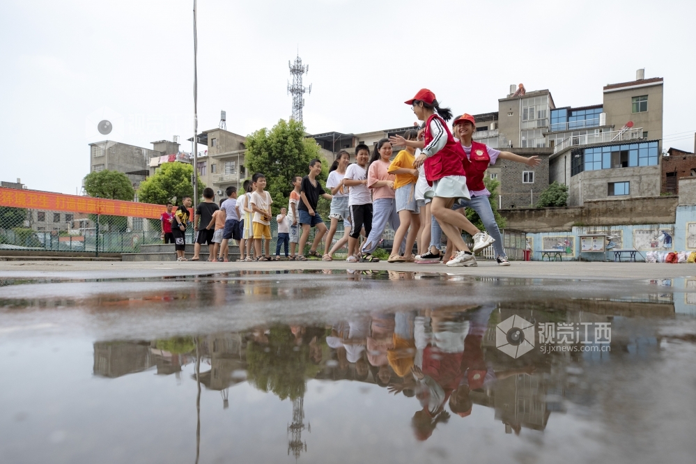 2020年7月14日,江西庐山市蛟塘镇中心小学受灾群众安置点,孩子们在志愿者的带领下做游戏。面对洪水,江西省庐山市以人民群众生命安全为重,及时转移高风险地区群众并妥善安置。设在蛟塘镇中心小学的的集中安置点,不仅让群众住得安全,吃得放心,还开设了暑期班,让孩子们能过上一个安全、健康、快乐的暑假。