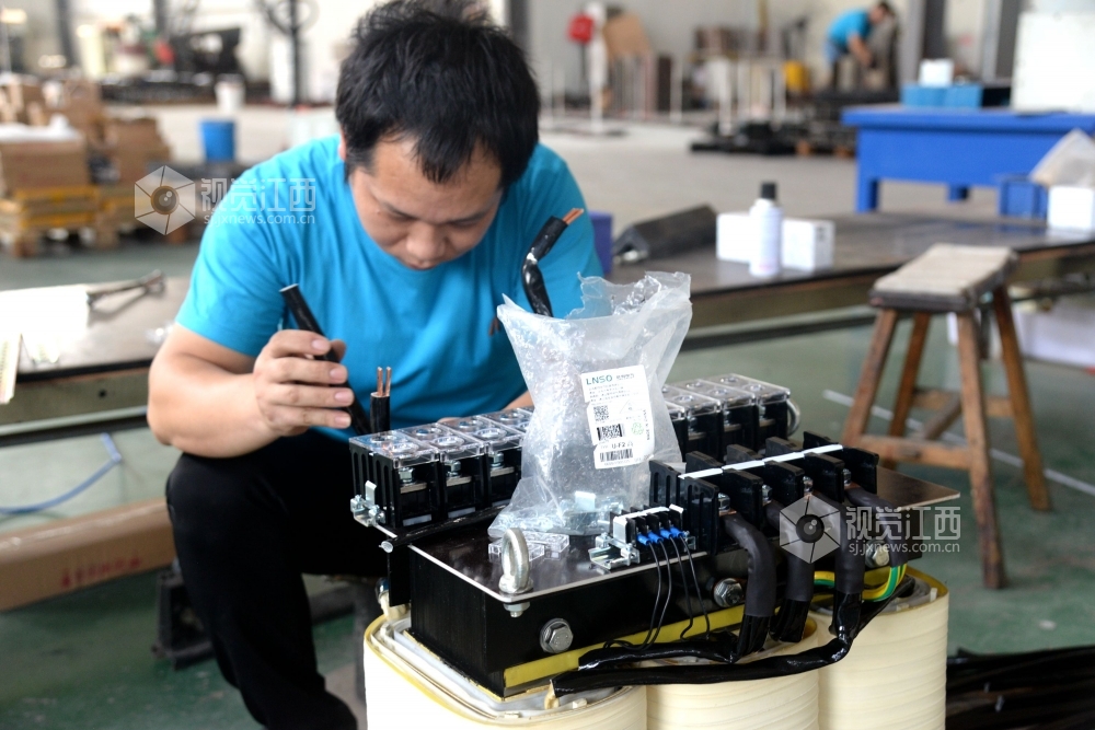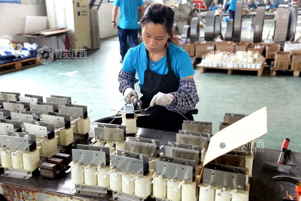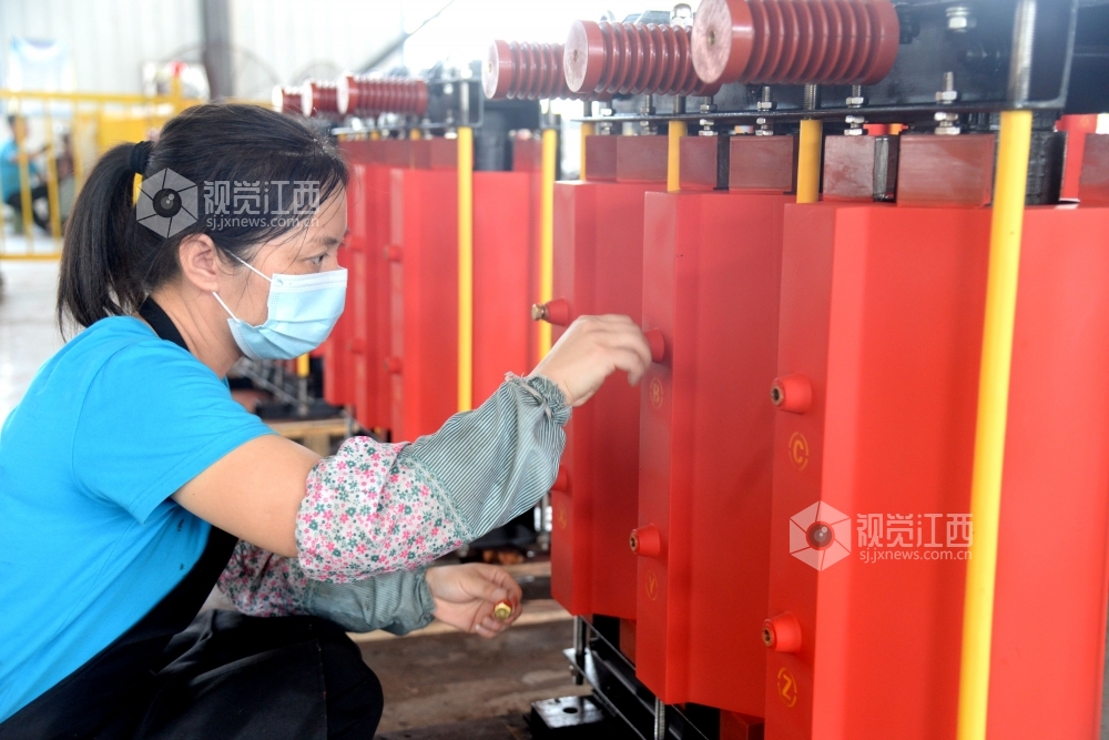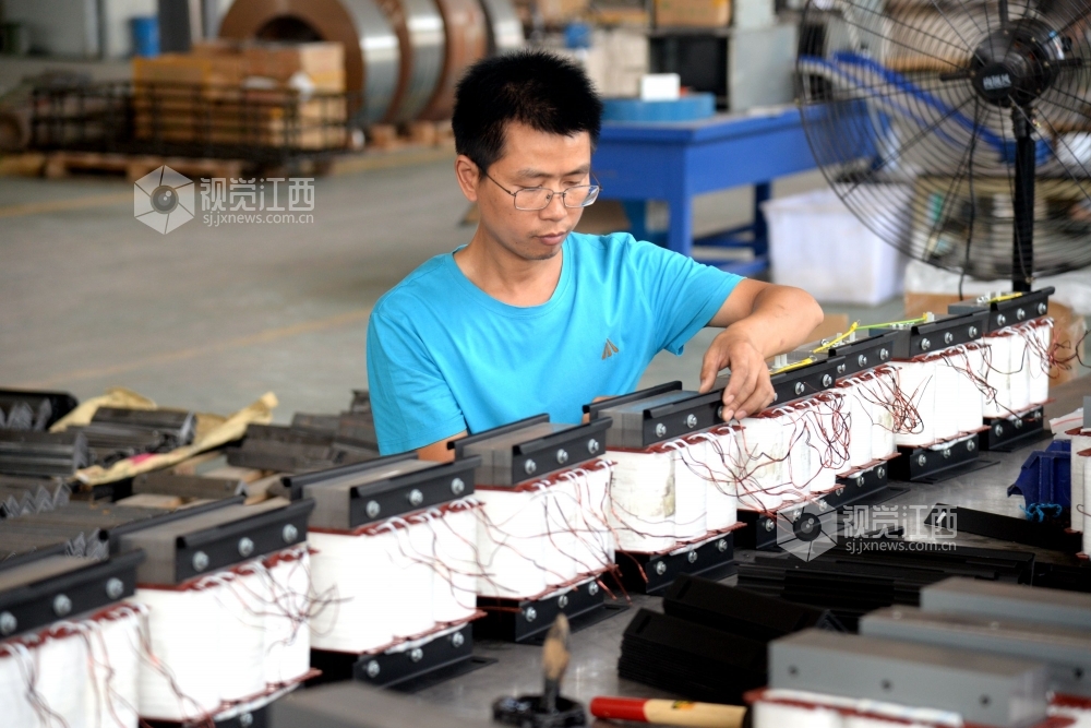 2020年7月17日,在江西奥恒达科技有限公司生产车间内,工人们正在电抗器、变压器生产线上加班加点赶制订单产品。