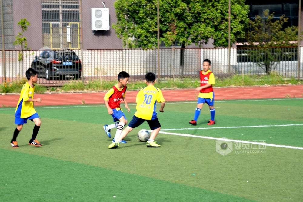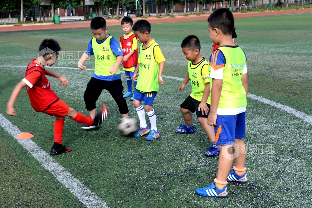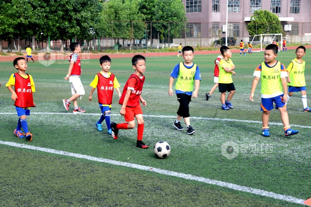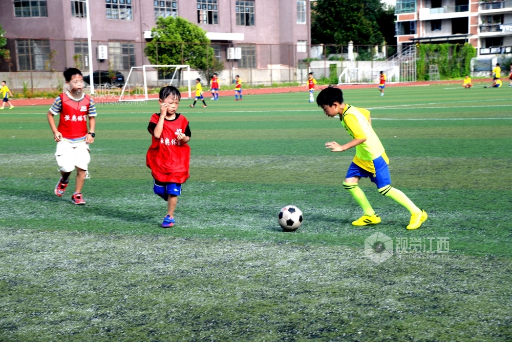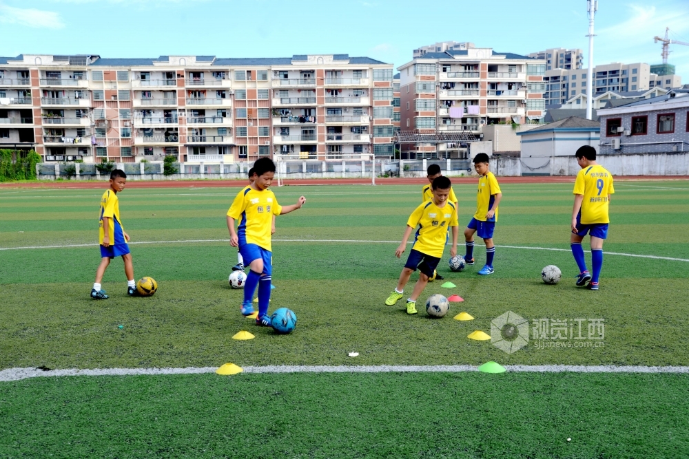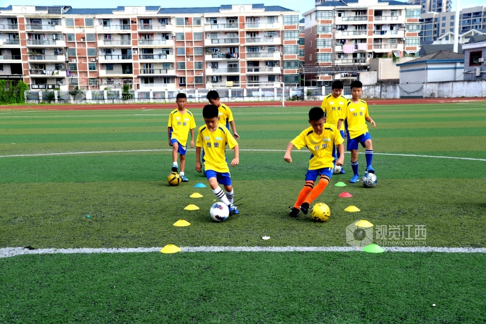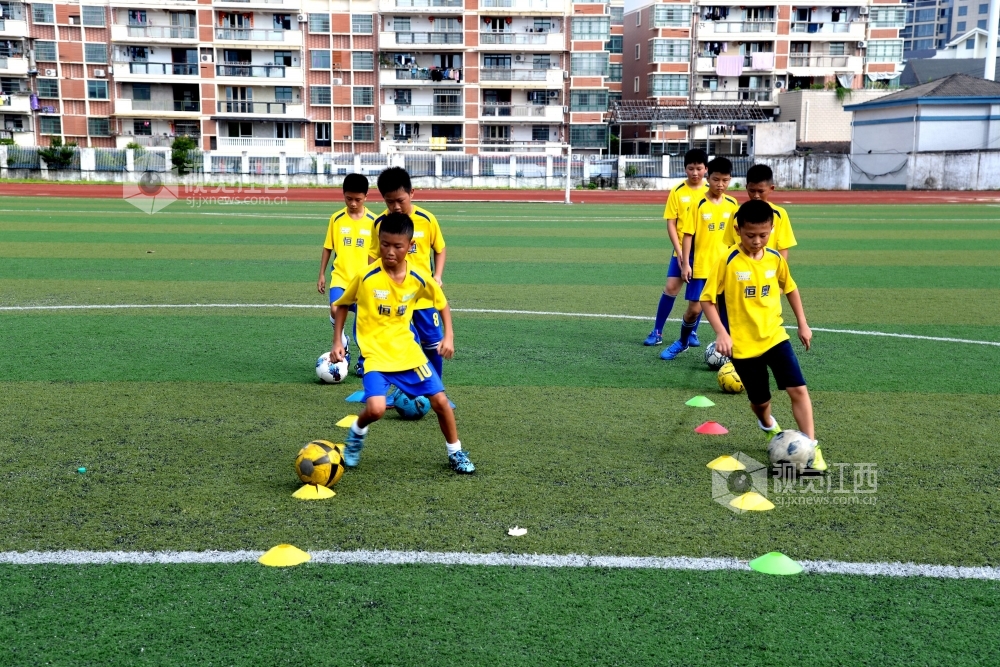 2020年7月31日,在江西省抚州市南丰县第二中学足球场上,爱好足球的学生们在练习踢足球,享受足球运动的乐趣,在绿茵场上快乐奔跑,学习足球运动的技巧,强身健体,度过一个愉快、健康的暑假。