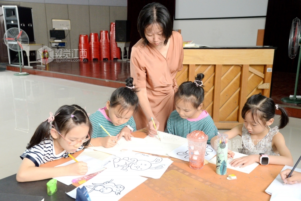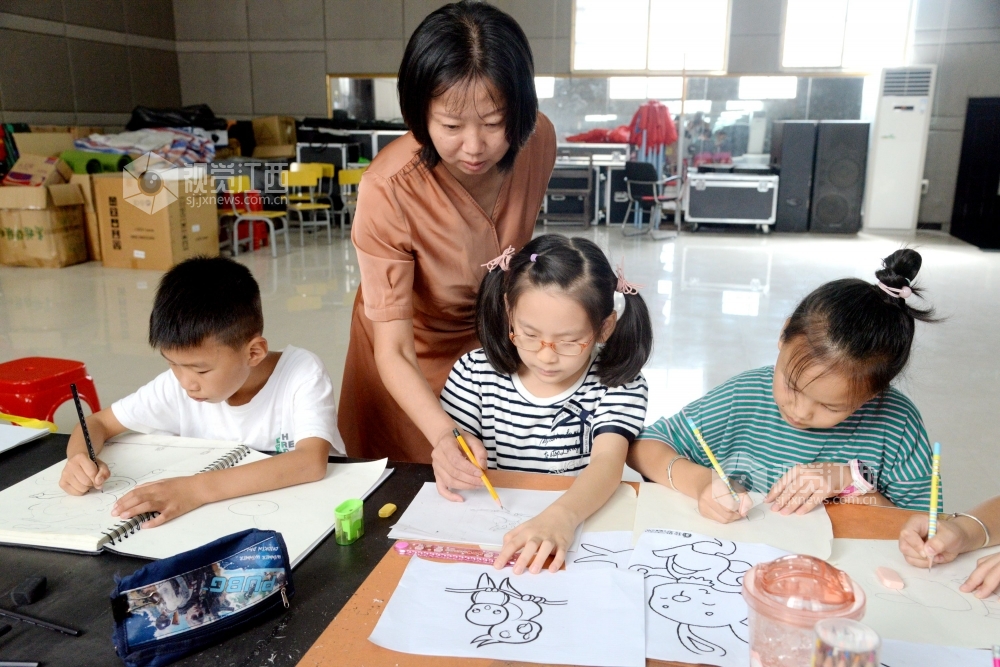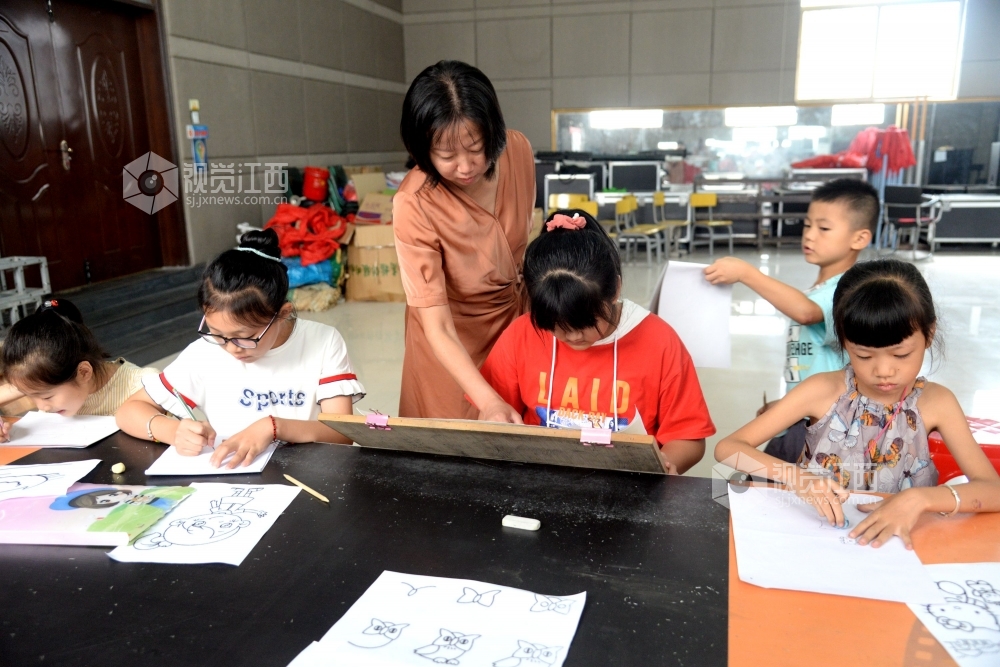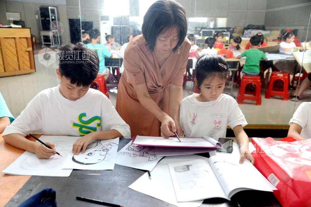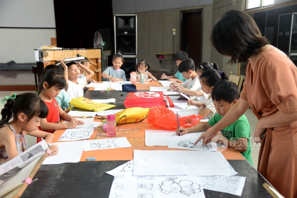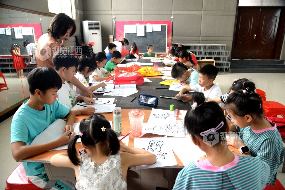 2020年7月31日,在江西省南丰县文化馆培训教室内,少儿美术培训班的孩子们在老师指点下兴致勃勃地学习绘画技巧,充实暑期生活。