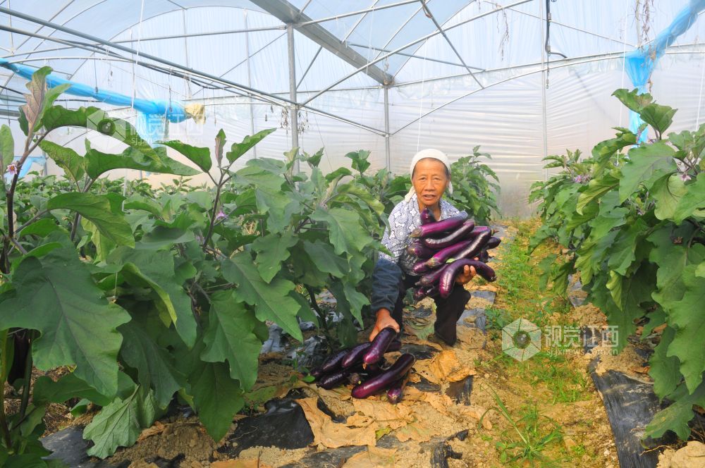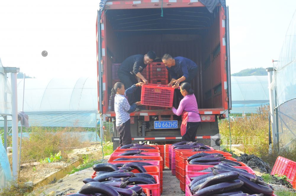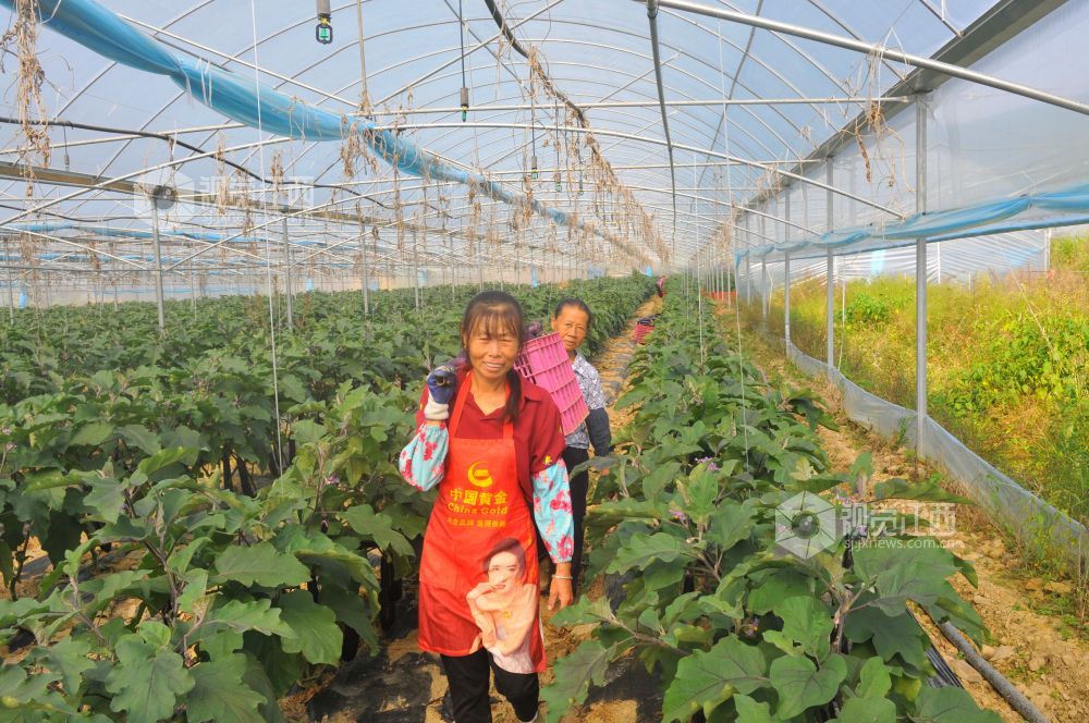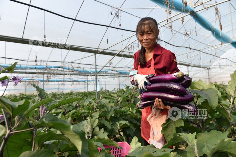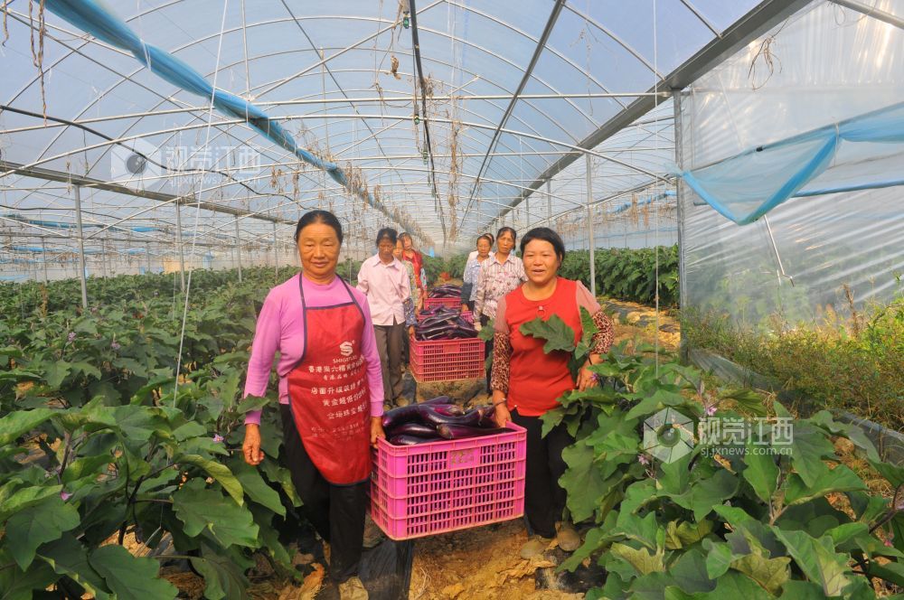 10月28日,在江西省全南县金龙镇水口村扶贫产业基地,贫困户们正在高兴采摘销往广东市场的紫茄子。