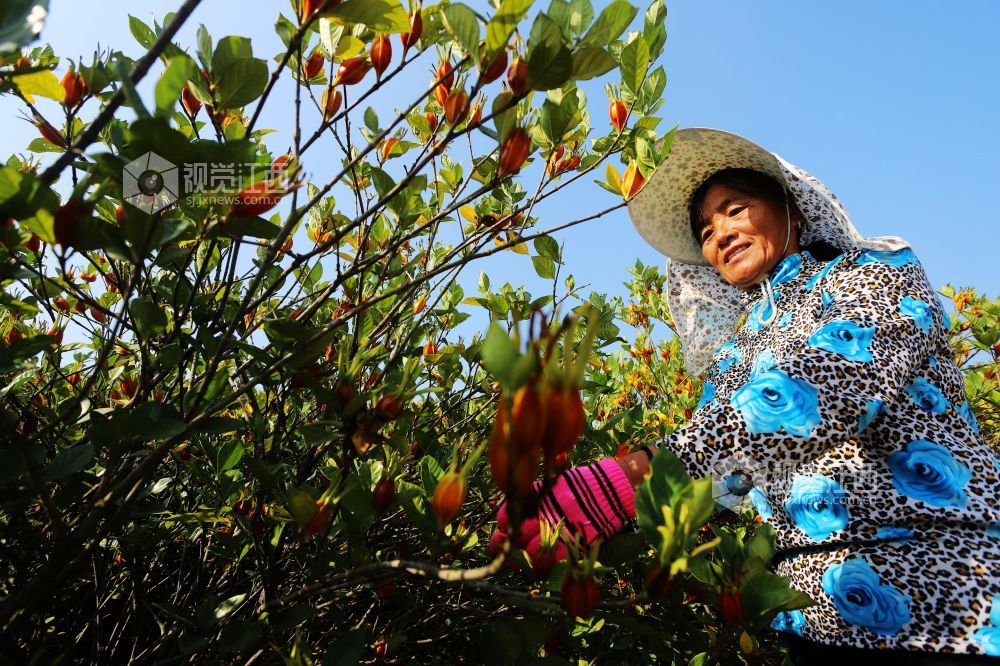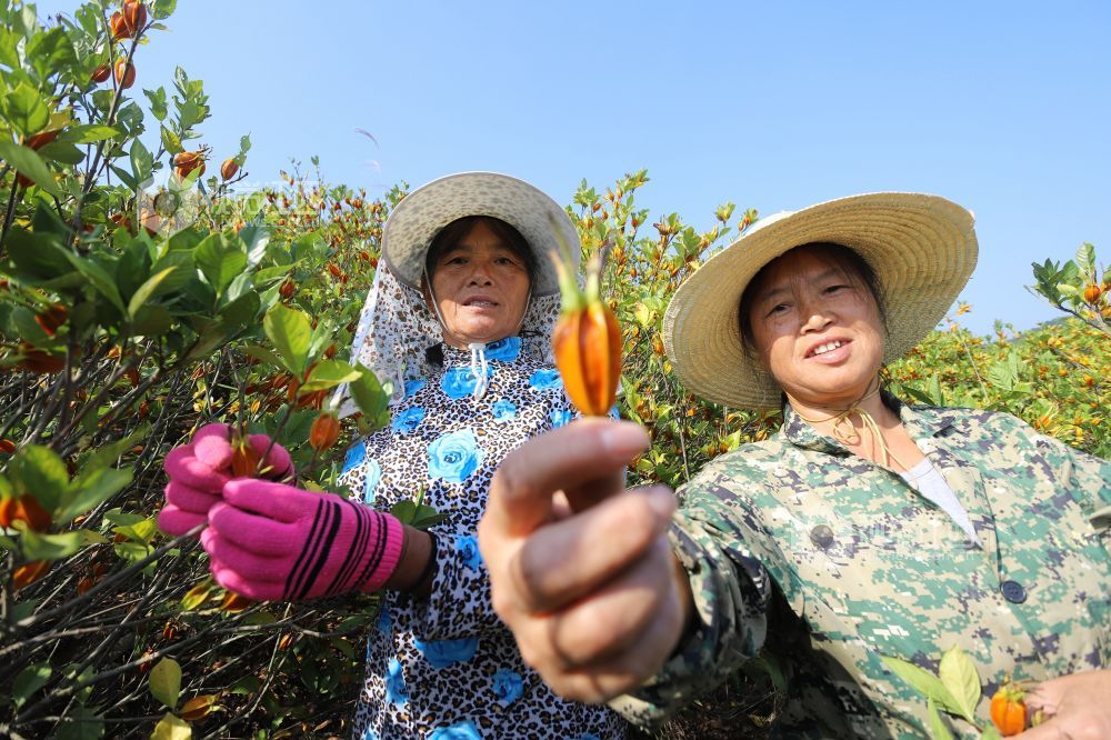 10月28日,江西省安福县甘洛乡水栀子基地农民在采摘水栀子果实。金秋时节,该基地水栀子迎来成熟期,一排排水栀子树挂满了金灿灿的果实,颗颗果子饱满壮实,争相从枝叶中探出头去,又是一个丰收季。