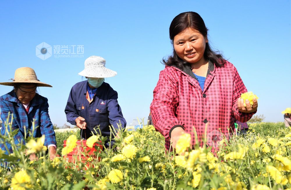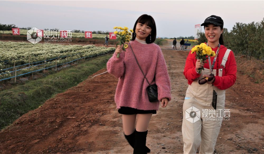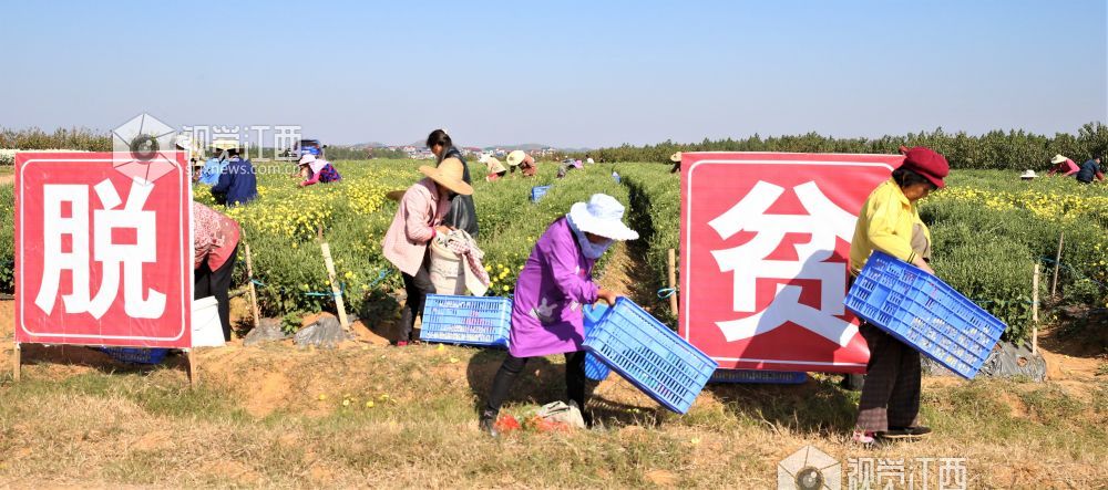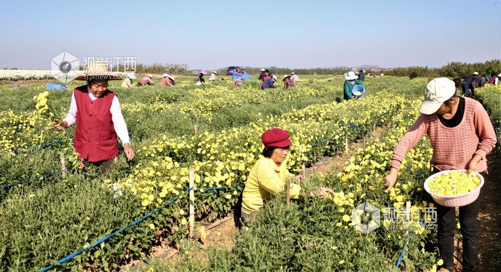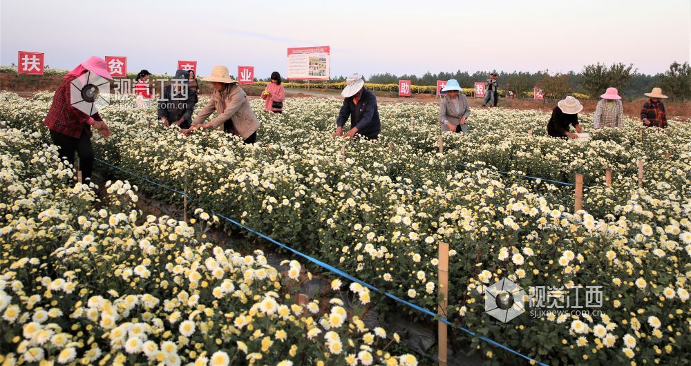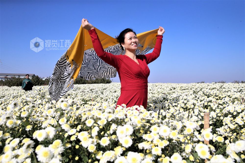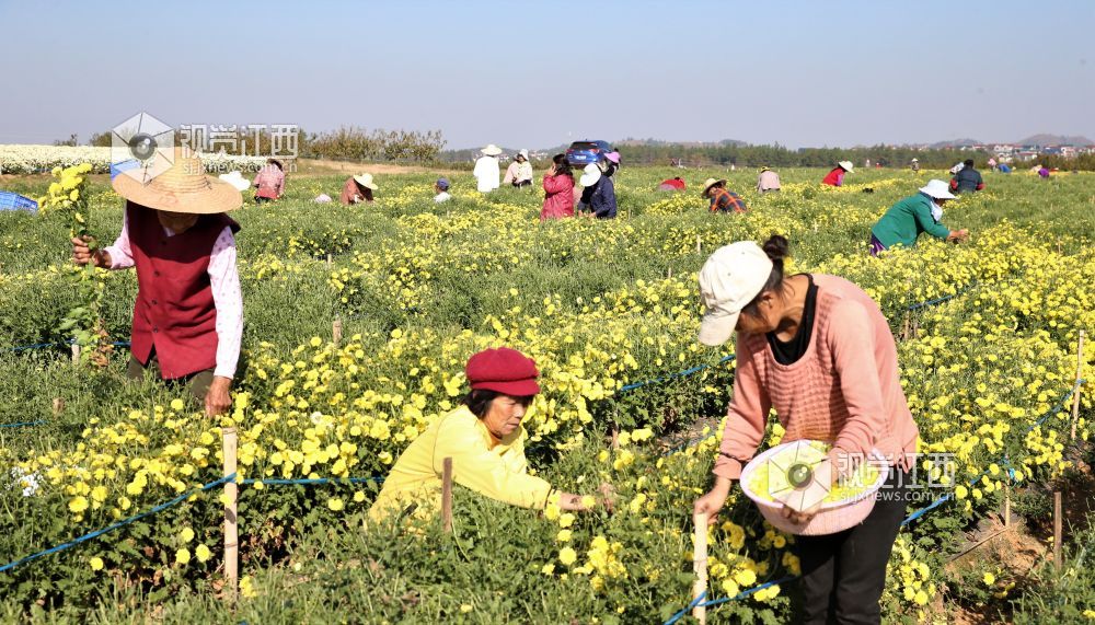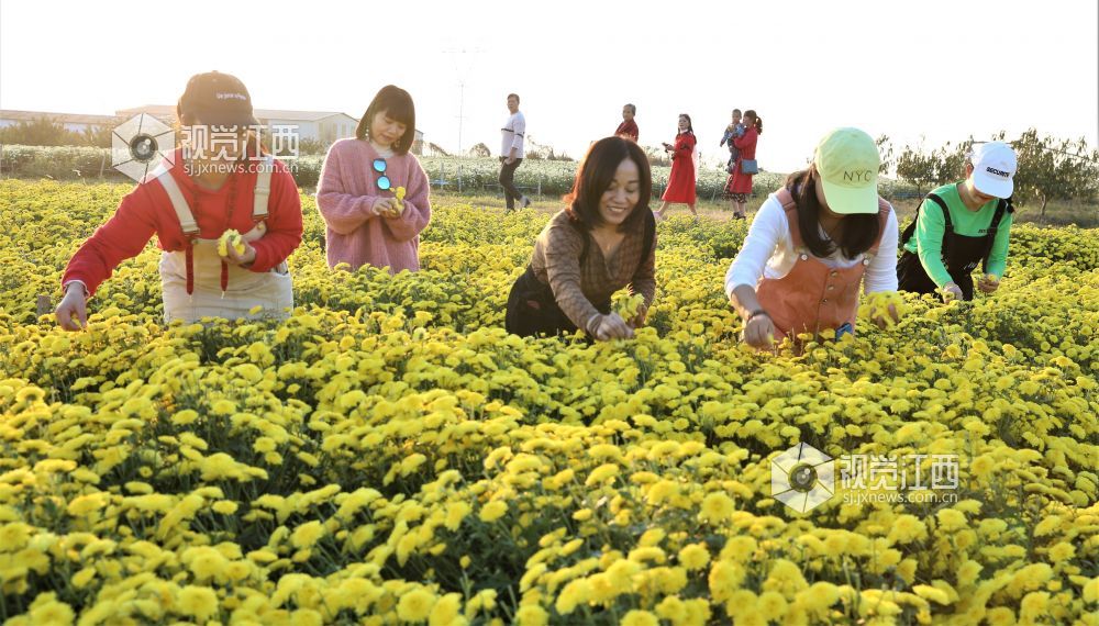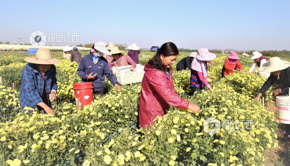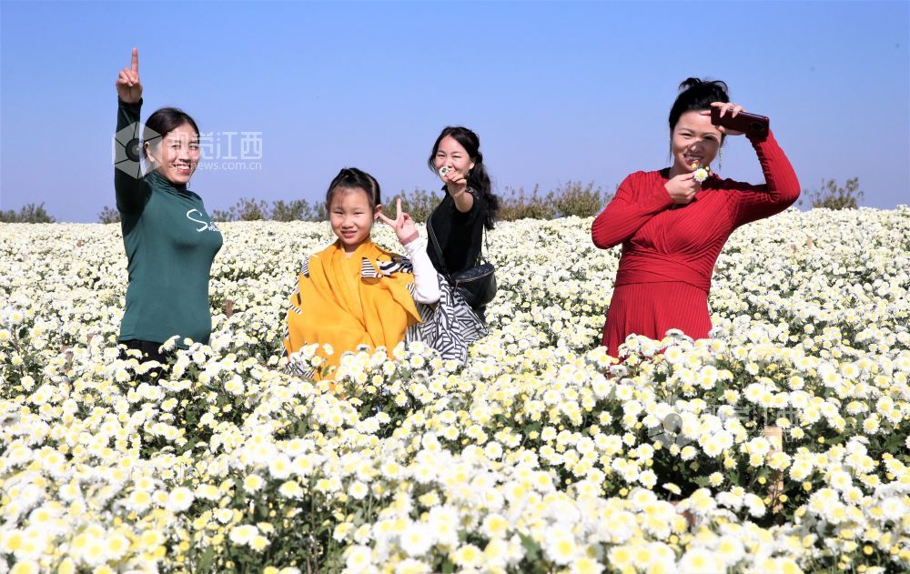 2020年11月12日,江西省鄱阳县鄱阳镇道叉村产业扶贫基地菊花盛开进入采摘期,村民们抓住大好晴天釆摘皇菊,游人们在菊花中赏菊拍照,该村产业扶贫基地一片繁忙。