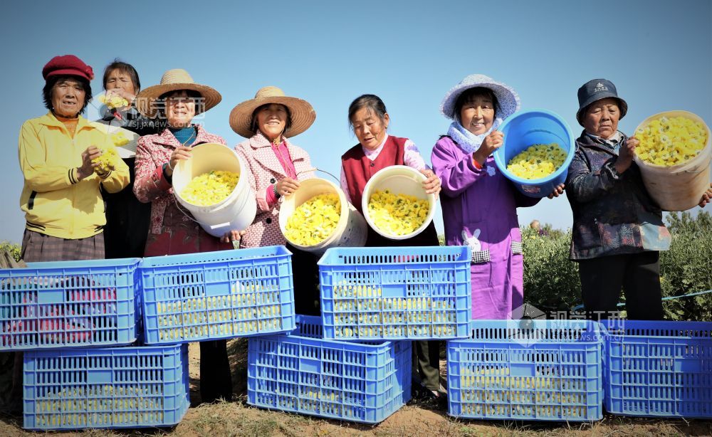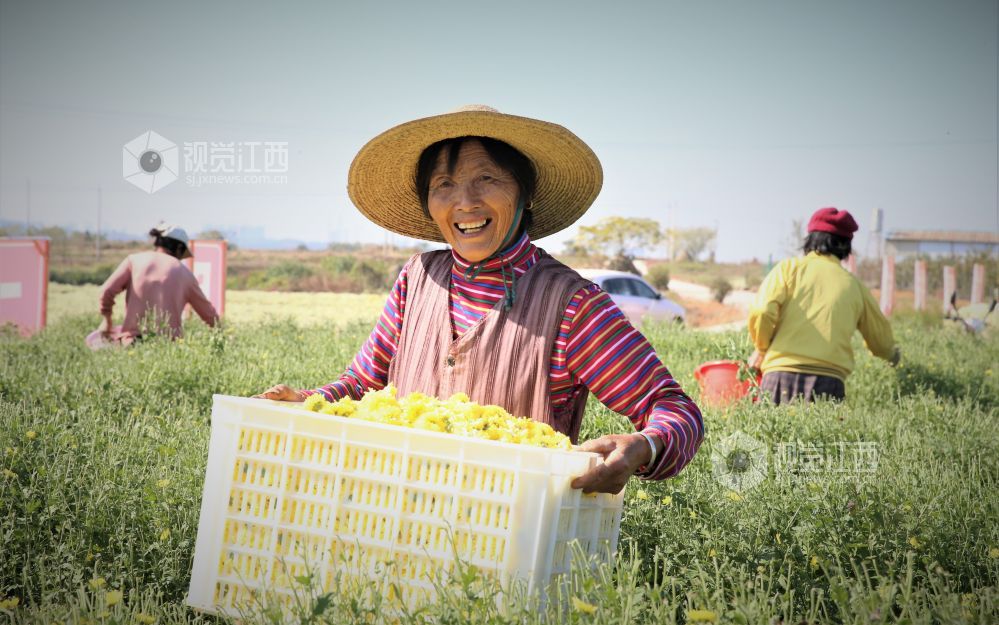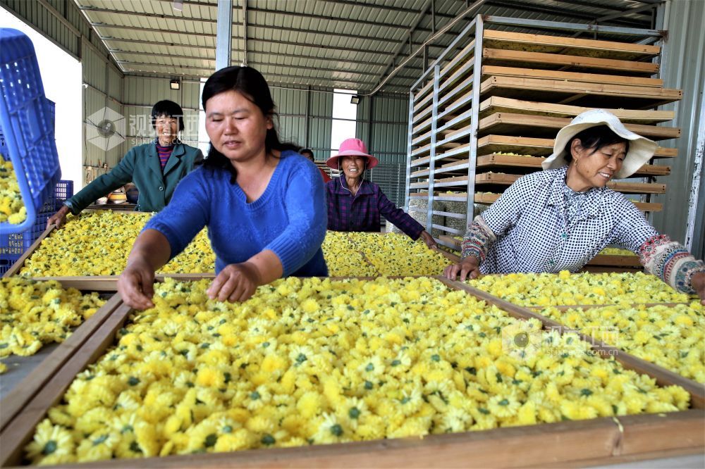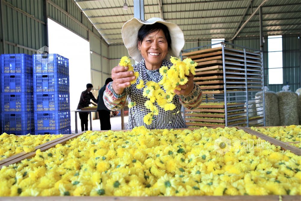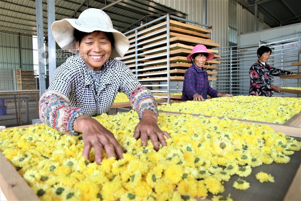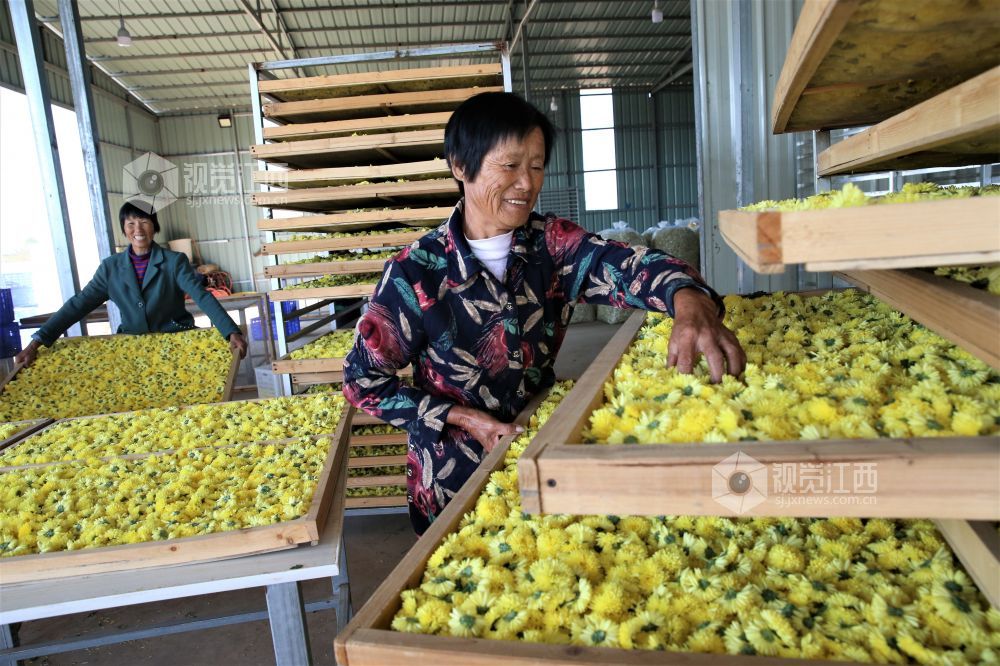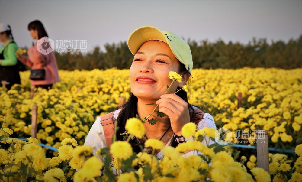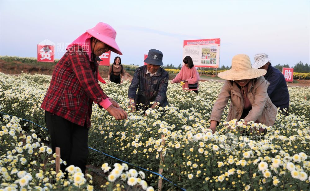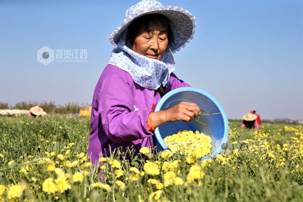 2020年11月12日,江西省鄱阳县鄱阳镇道叉村产业扶贫基地菊花盛开进入采摘期,村民们抓住大好晴天釆摘皇菊,游人们在菊花中赏菊拍照,该村产业扶贫基地一片繁忙。