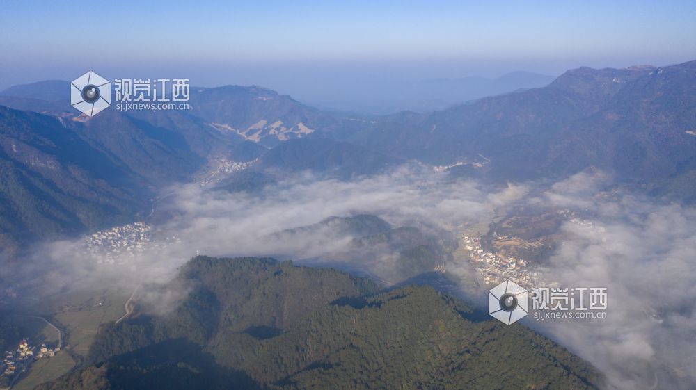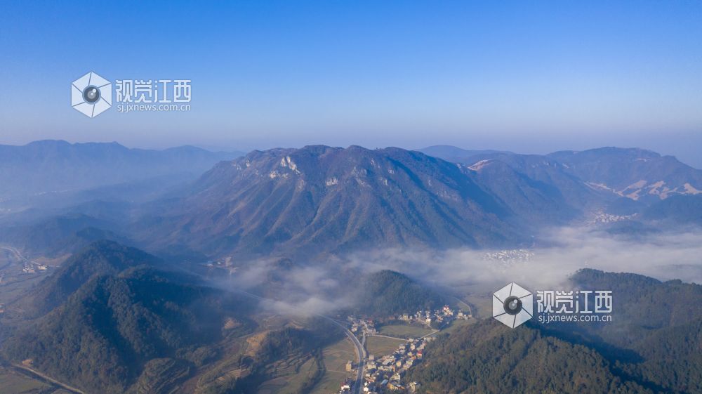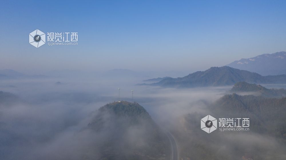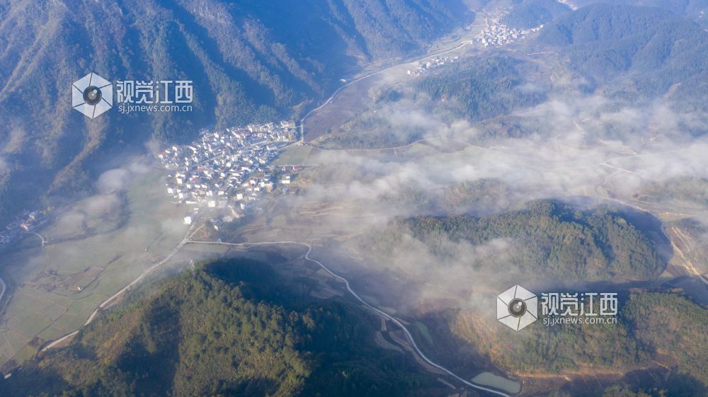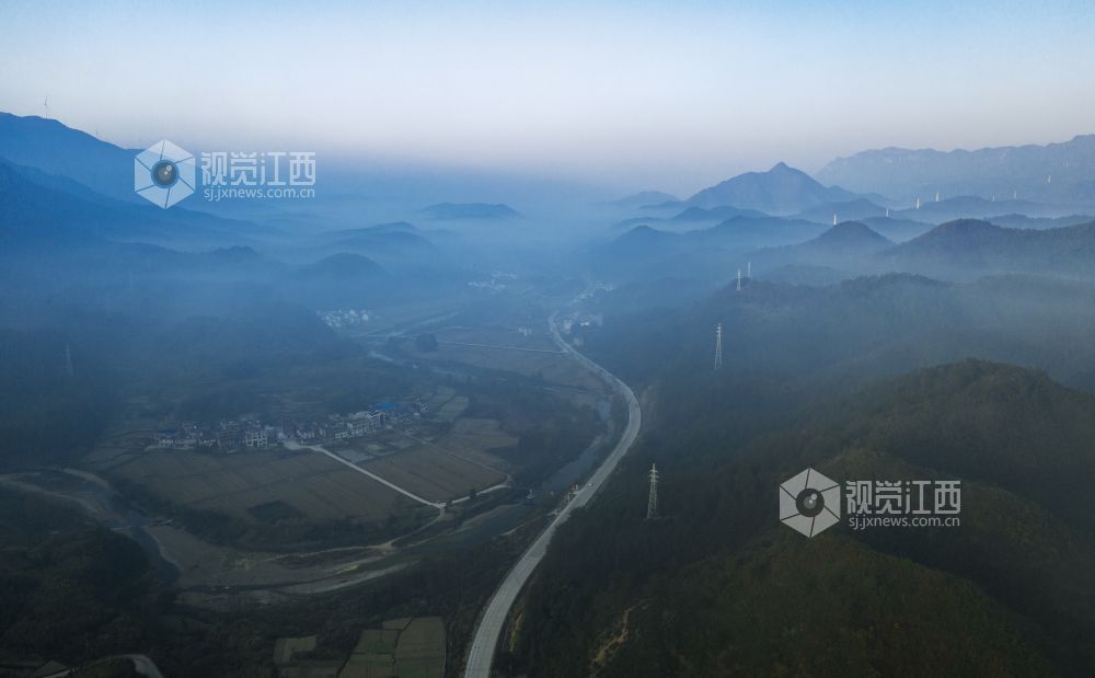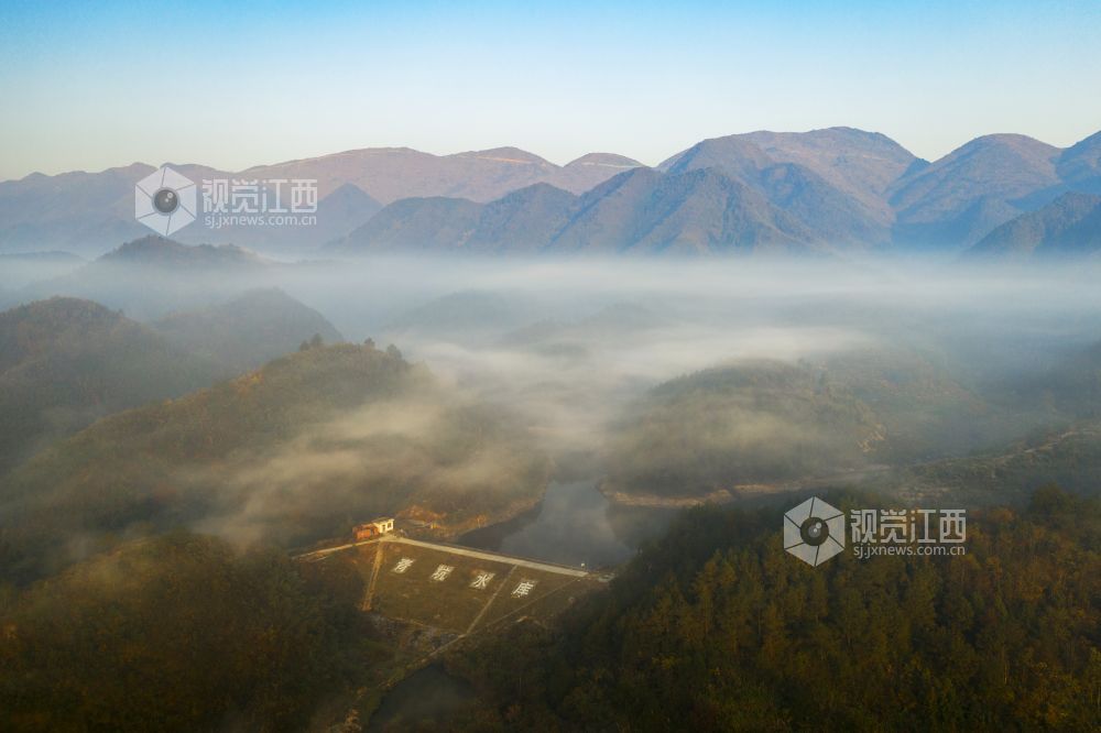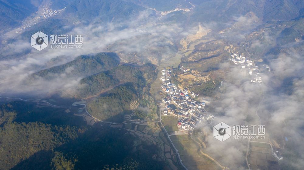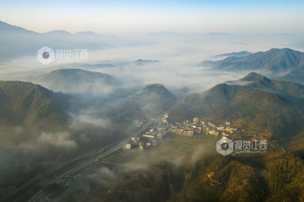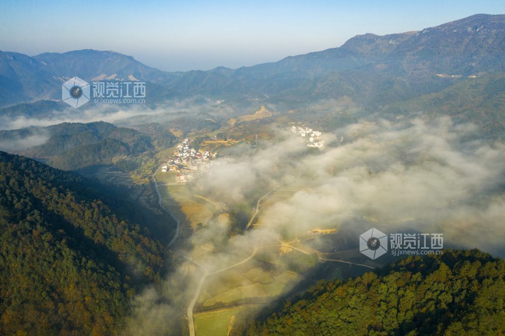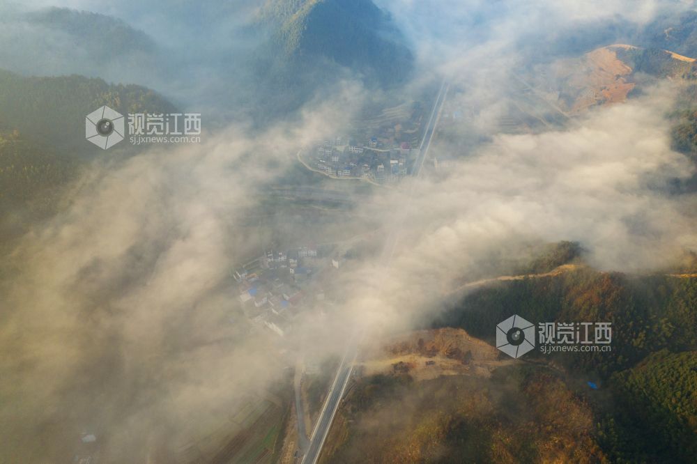 2020年11月15日,江西省瑞昌市大德山、花园上空出现了美丽的云雾景观,房屋、道路、田野和青山在云雾间若隐若现,宛若仙境。