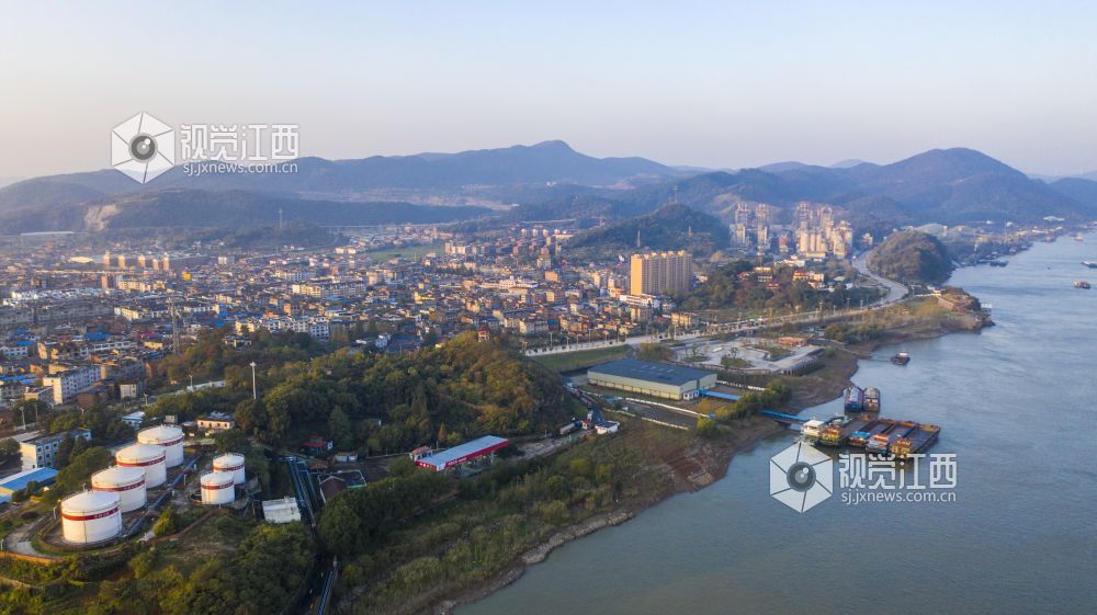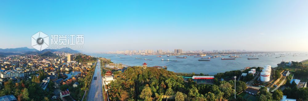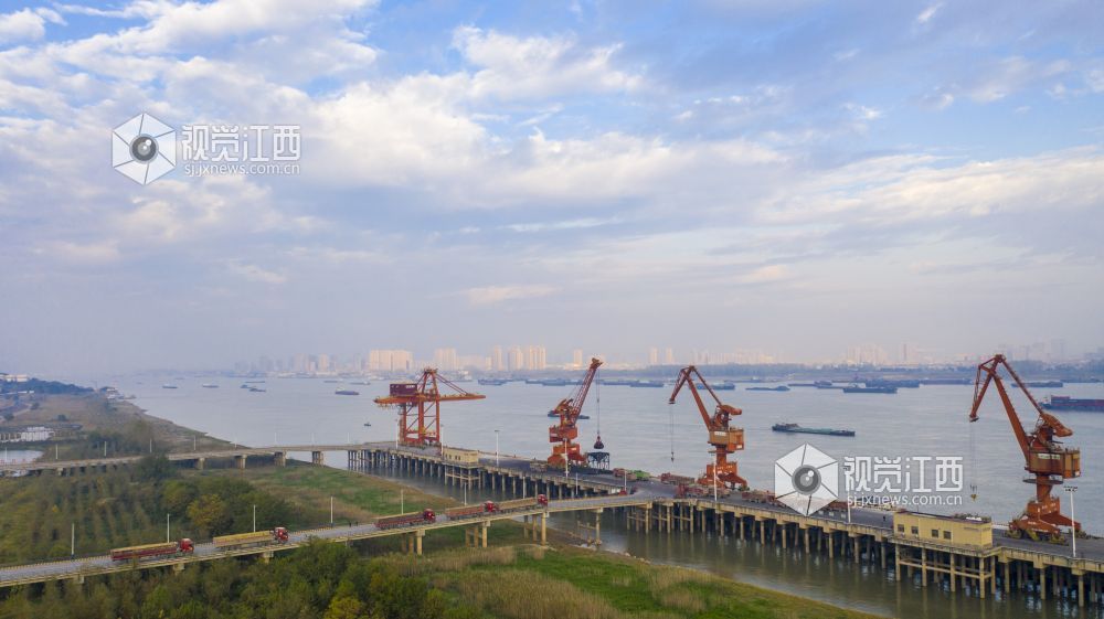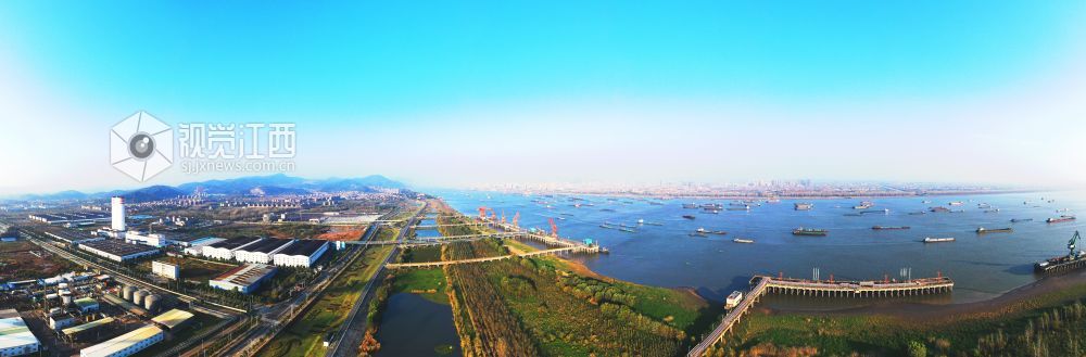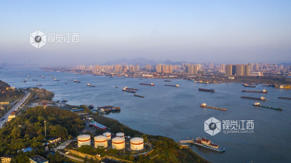 2020年11月18日,航拍下的长江江西省瑞昌段江堤,江岸绿意葱茏,江面烟波浩渺,长江航道船舶来往不断,公用码头生产一派繁忙。