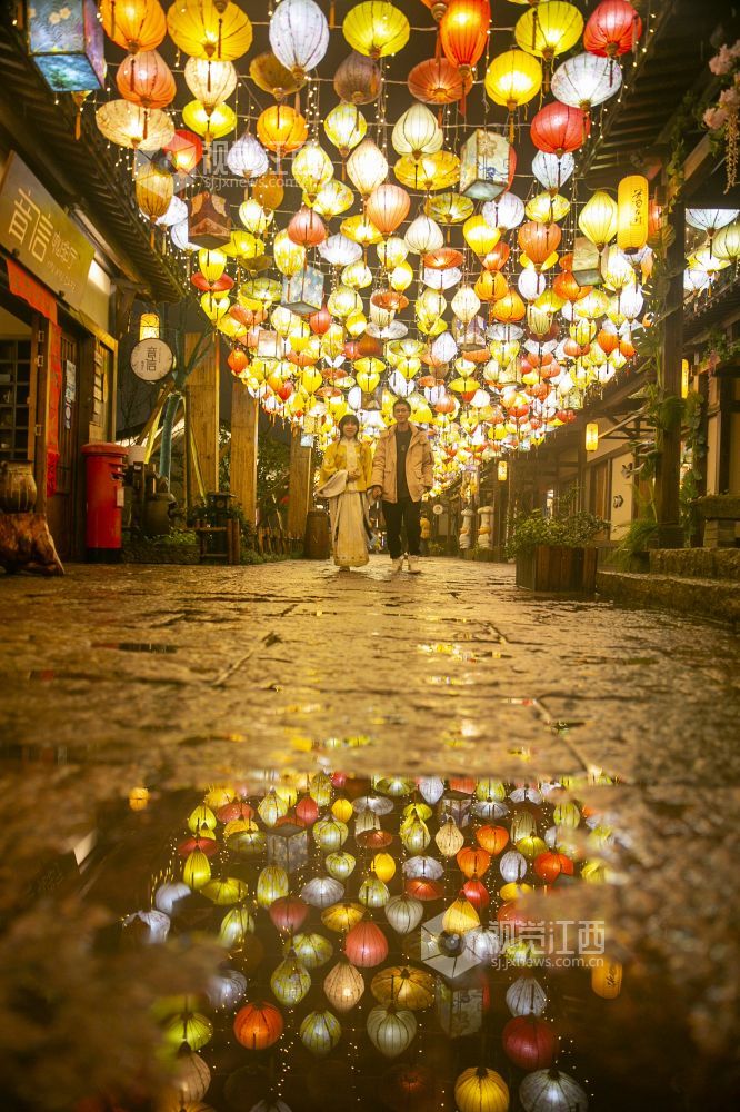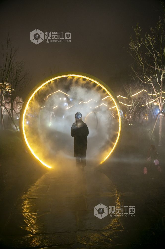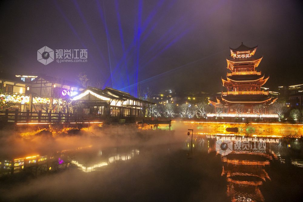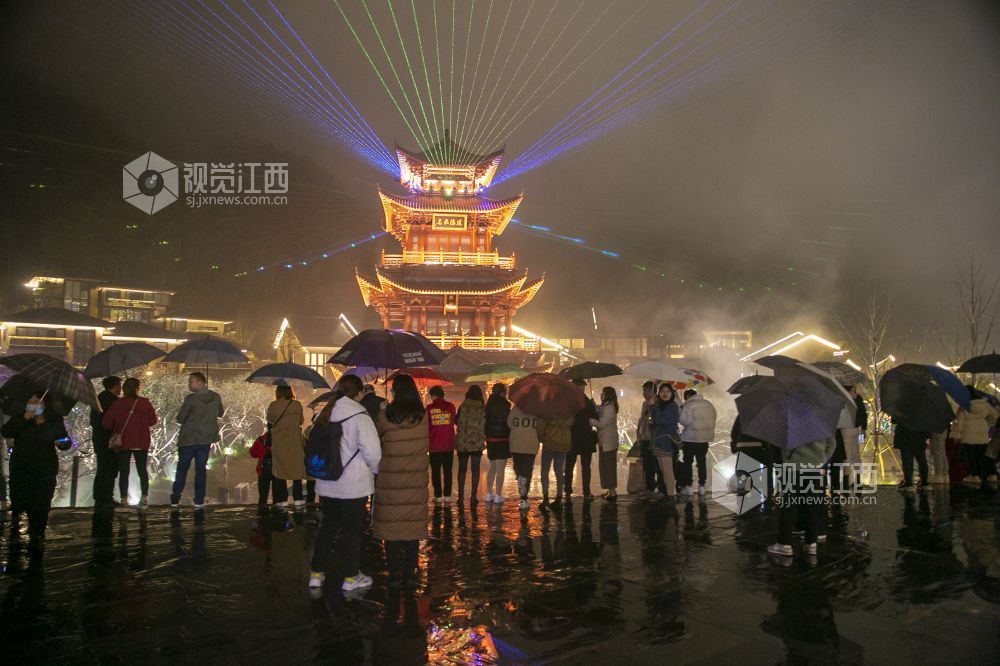 江西省铅山县葛仙村风景名胜区白天云雾缭绕,让人仿佛置身仙境。每到夜晚,景区内灯光璀璨,流光溢彩,欣赏灯光秀、水幕电影的游客摩肩接踵。