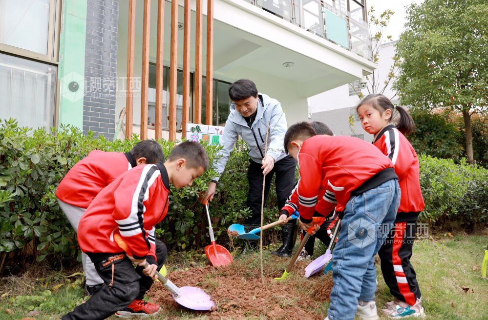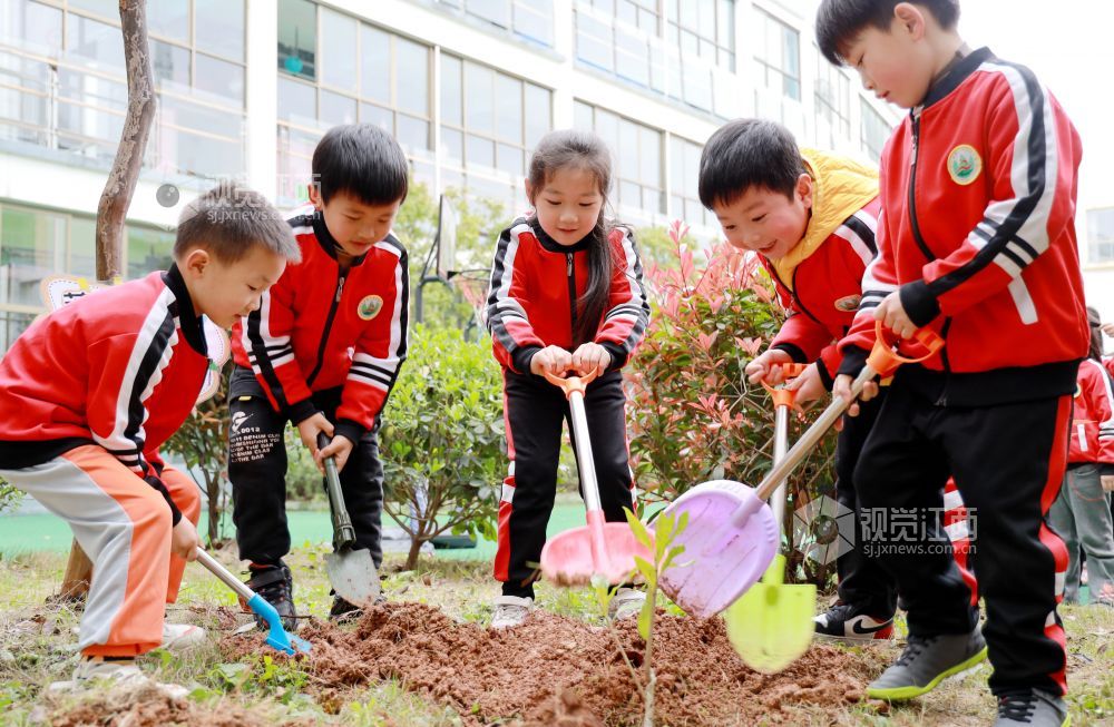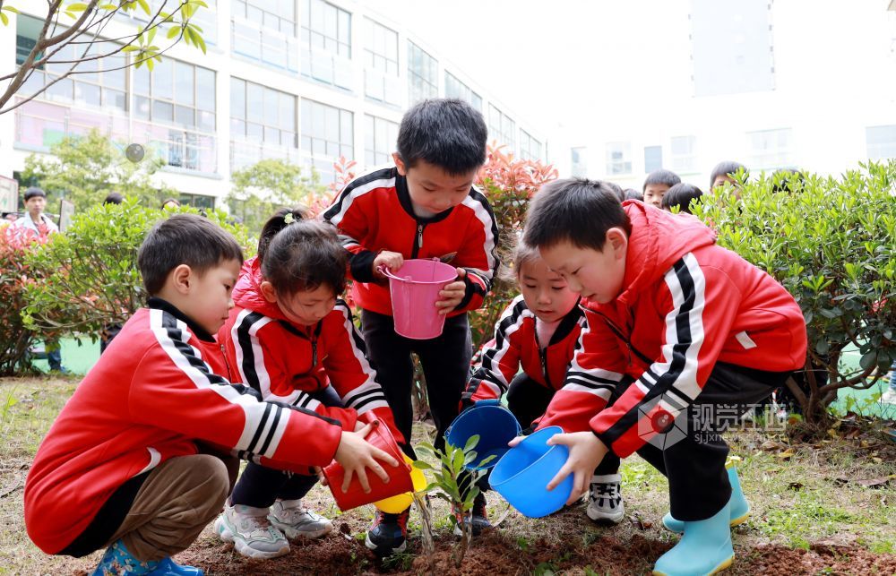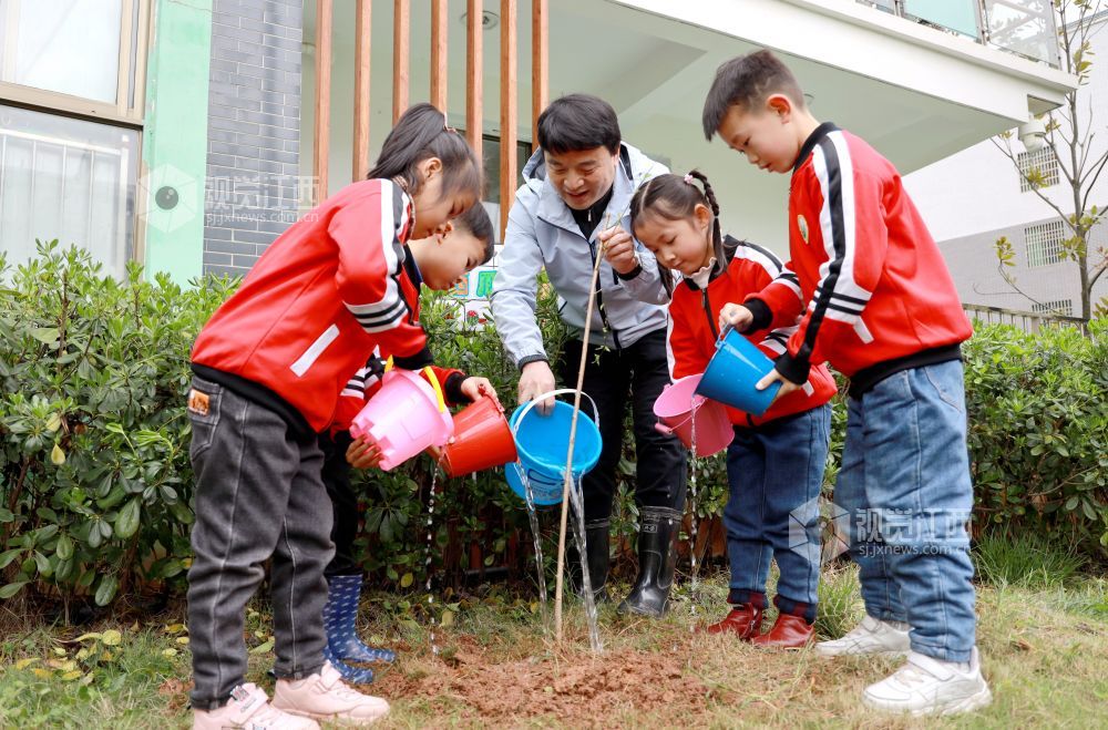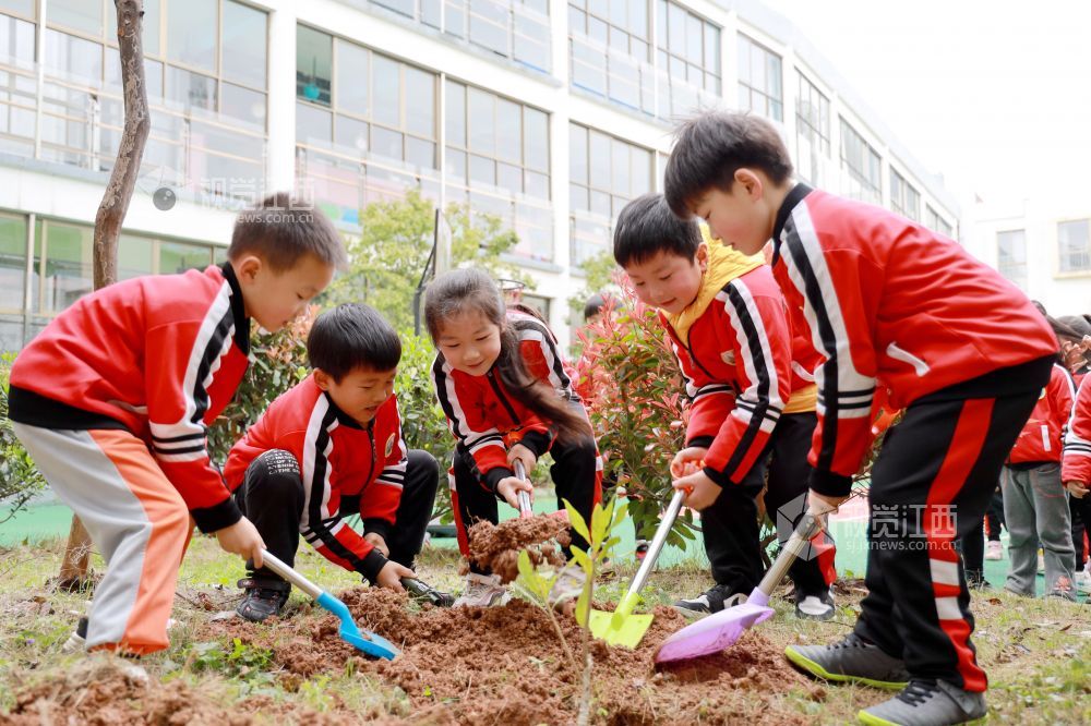 2021年3月12日,第43个植树节,江西省吉安市吉水县第二中心幼儿园的小朋友在幼儿园老师的带领下,在校园内栽种新树苗,体验劳动的艰辛,种下绿色的希望。