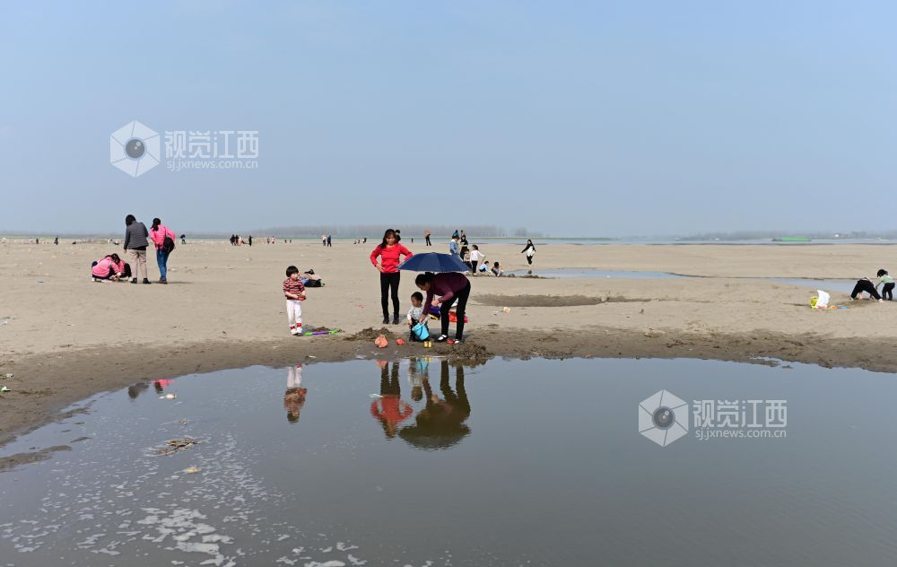 2021年3月14日,江西省九江市柴桑区城子镇长江段一处江滩裸露,不少市民在此嬉戏游玩。