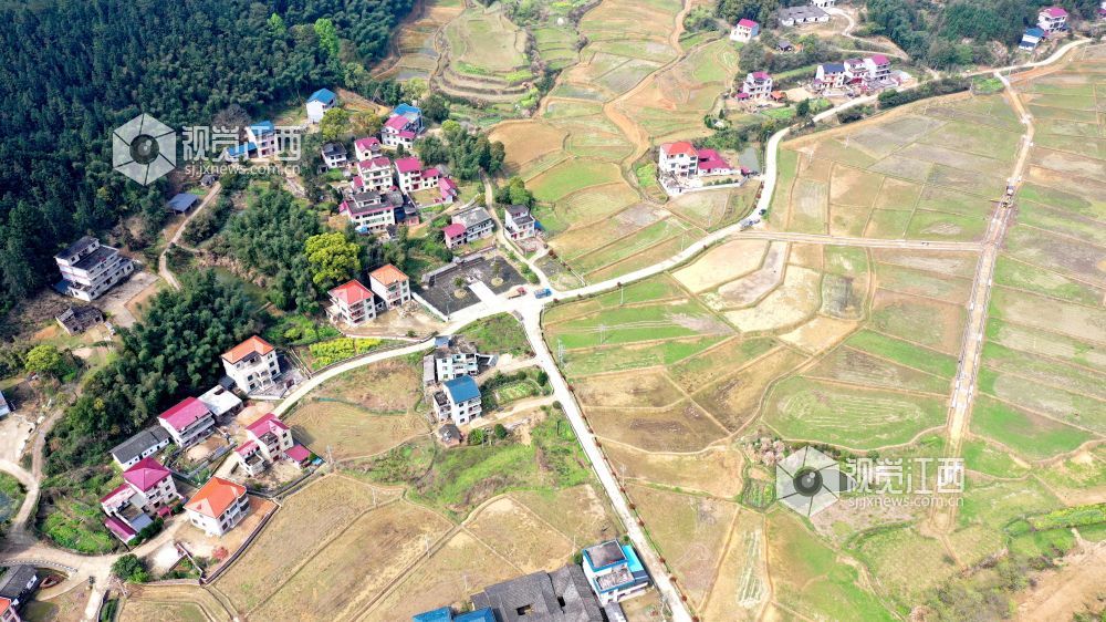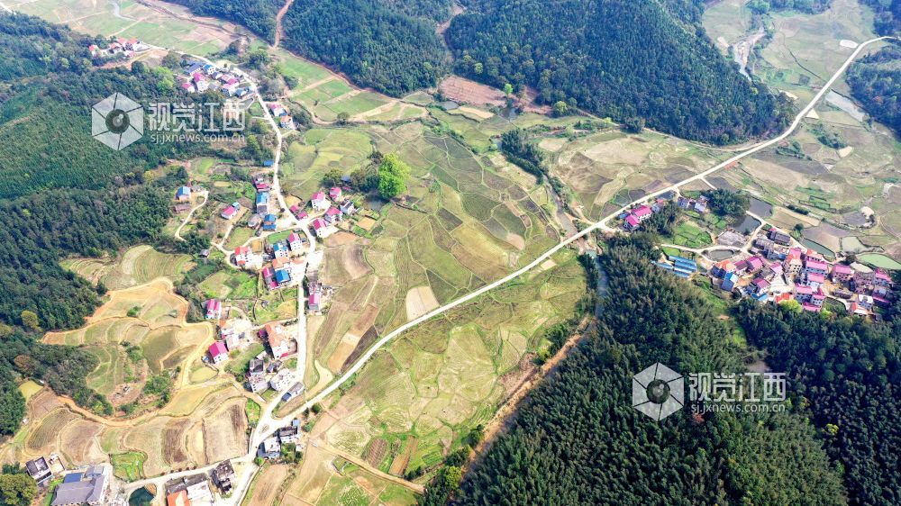 2021年3月16日,航拍下的江西省吉安市吉水县水南镇金城村通村公路,将一个个村庄串在一起,一栋栋美丽的民居仿佛项链上闪闪发光的宝石。