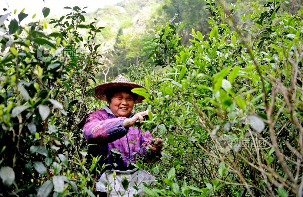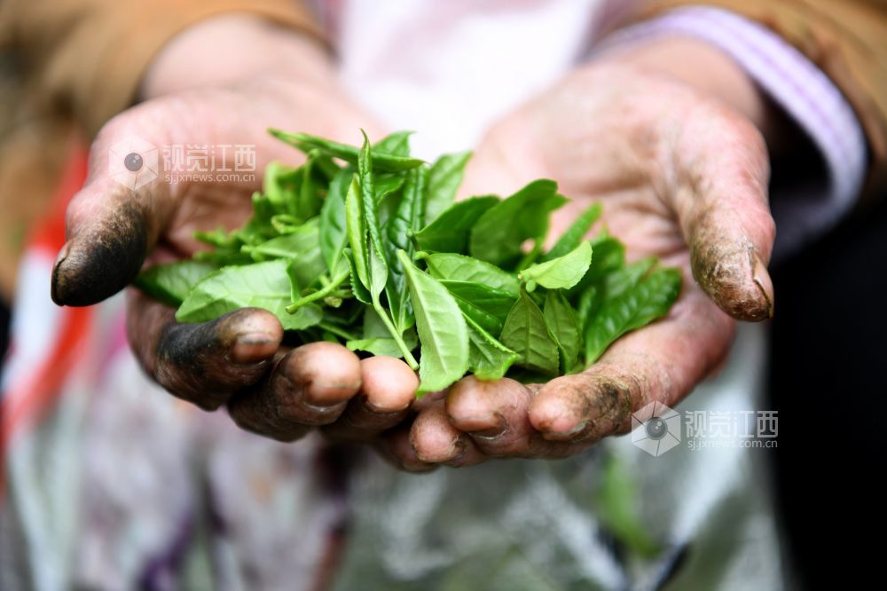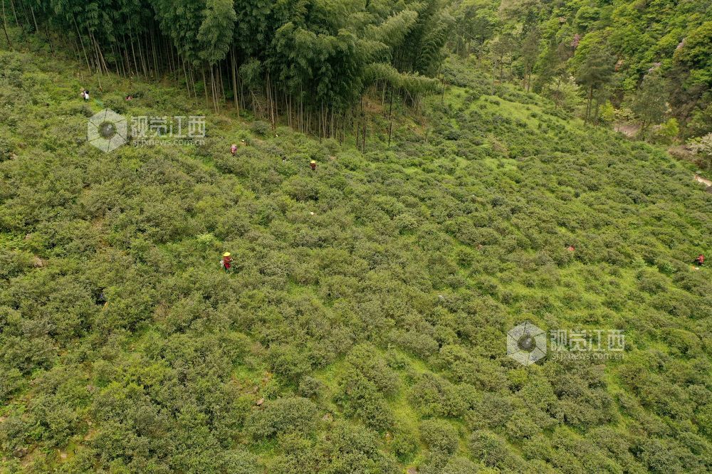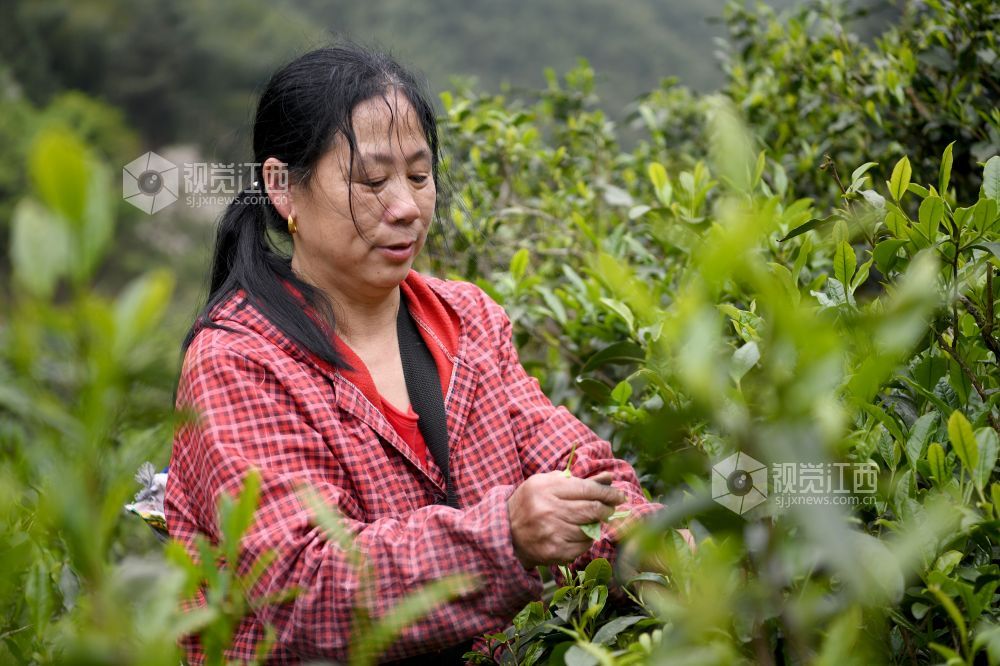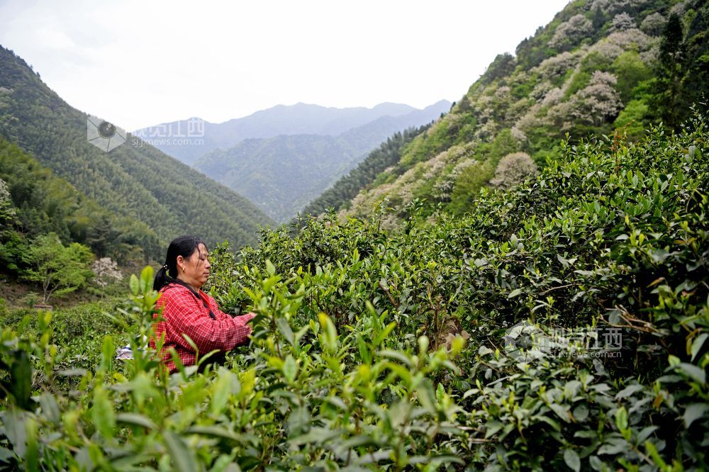 2021年4月19日,在江西省上饶市铅山县武夷山西坑茶山,村民正在采摘茶叶。