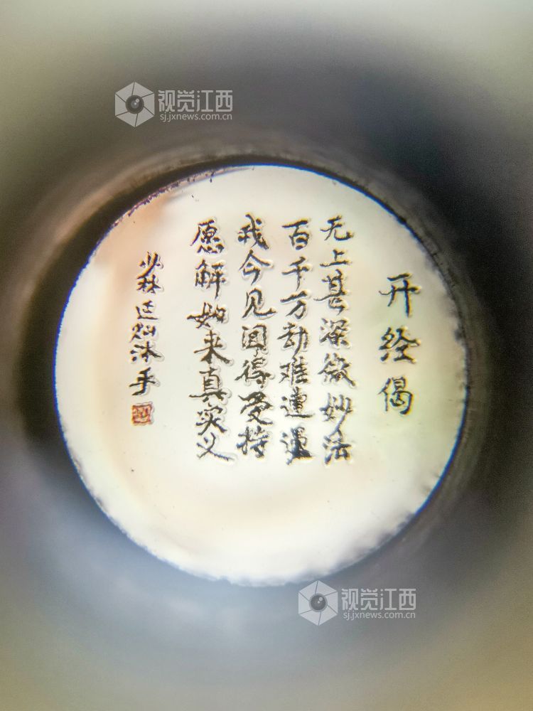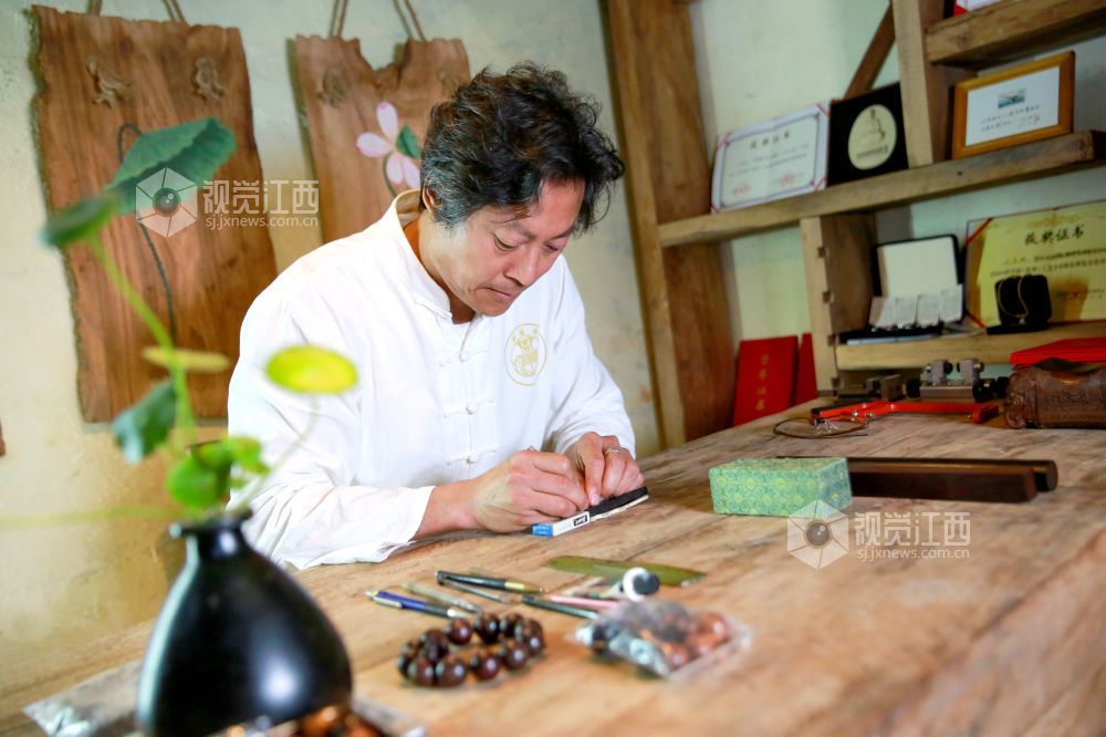 江西省吉安市吉水县金滩民间艺人刘学灿在微雕艺术独树一帜。刘学灿自幼酷爱书法绘画,曾师承著名微雕大师冯耀忠,潜心微雕艺术,微中求精,他不但能在微雕中表现行、草、隶、篆,人物,山水,花鸟,乃至彩墨抽象画,而且所刻的字,点、划、间架结构极其精妙,金石韵味十足。 其微雕艺术心得“艺在微”“意在精”。如在直径3毫米的圆内雕刻上百个文字,让作品小中见微、微中见艺、艺中传神。