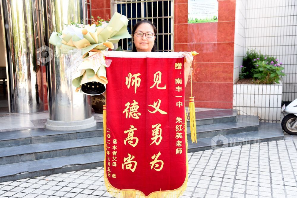2021年7月5日,在江西省抚州市南丰县第一中学办公楼前,该校共产党员、高级教师朱红英(女)接过溺水女孩父母送来的锦旗和鲜花,家长对朱红英老师勇救他们女孩的事迹深表感谢。