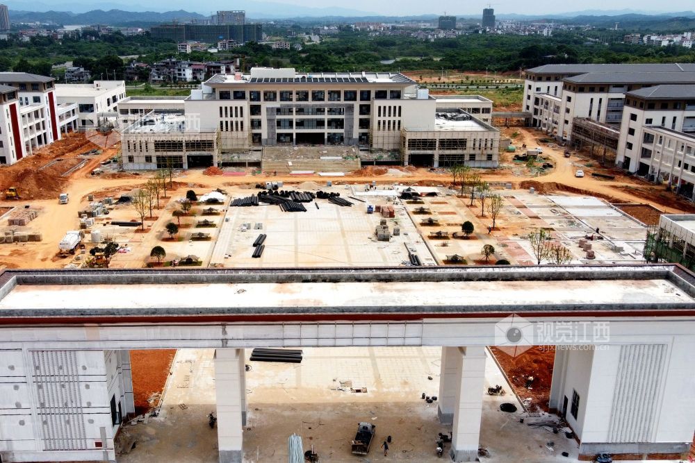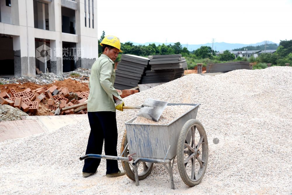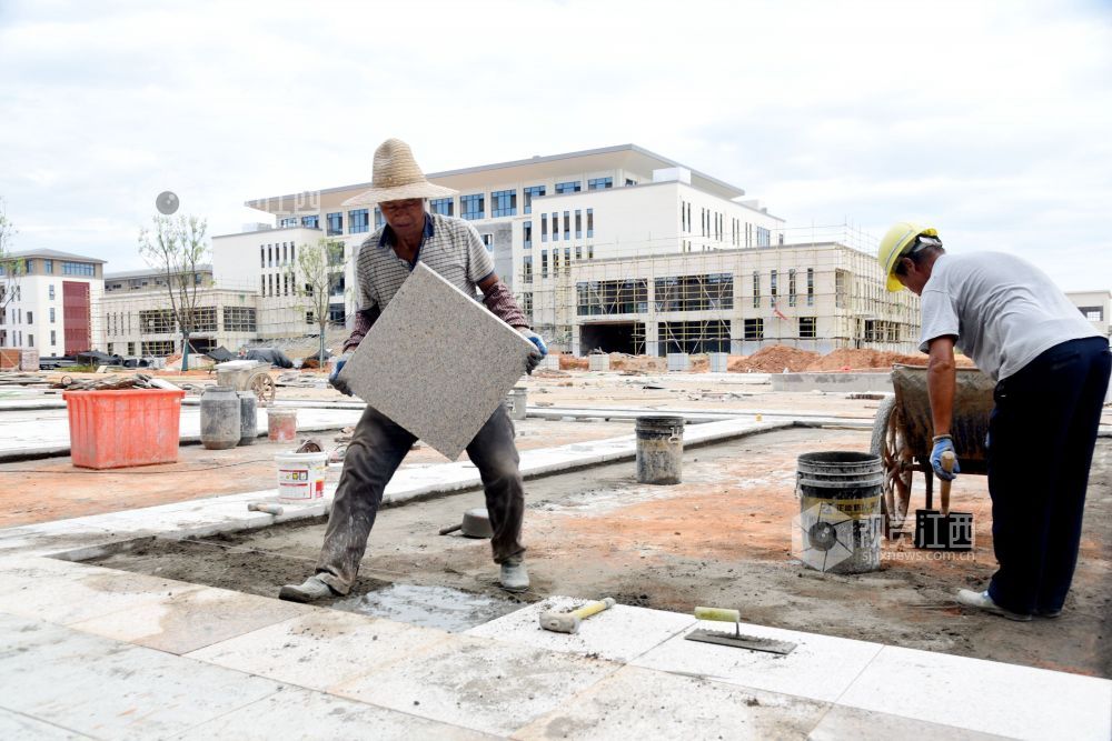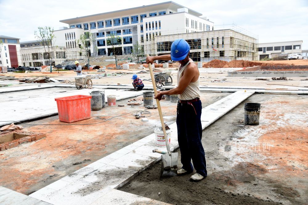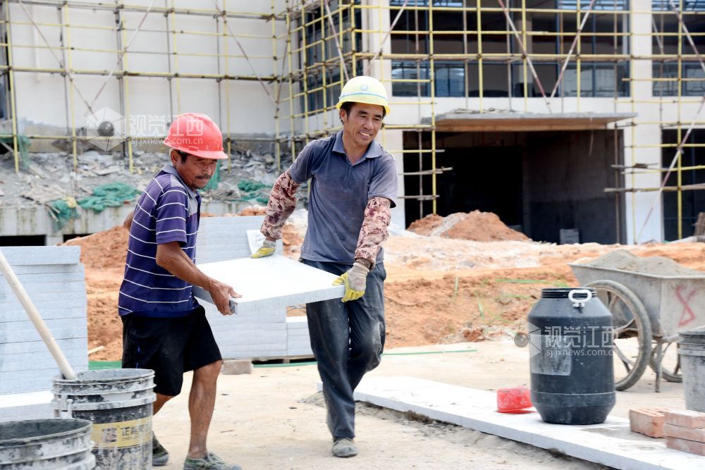 2021年7月7日,江西省南丰县第一中学新校区工地上,工人们在冒着高温抢工期,汗流浃背工作在各自岗位,确保2021年秋季新学期投入使用。