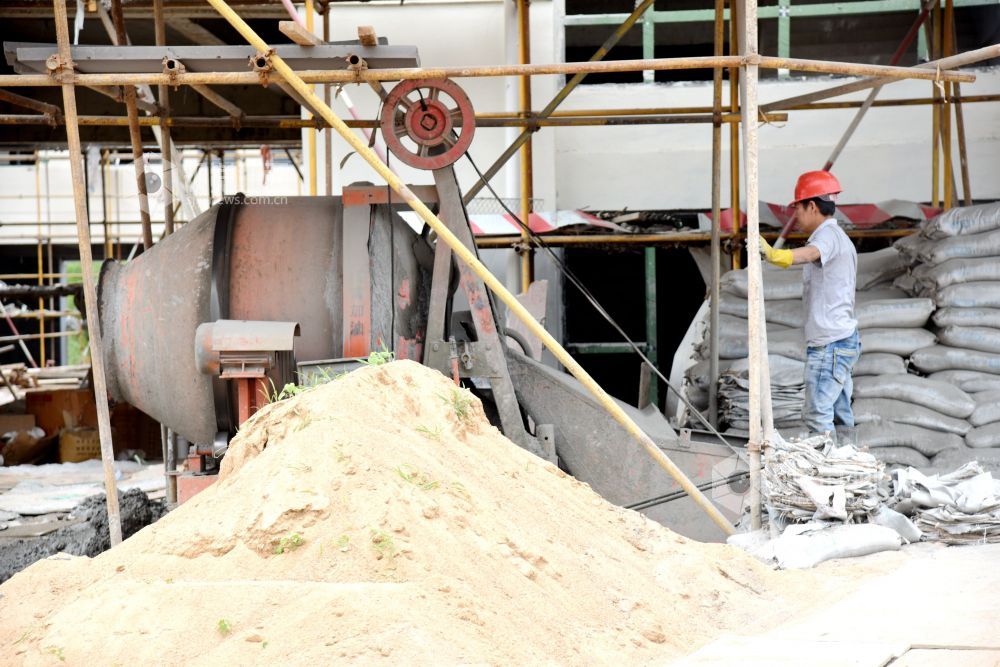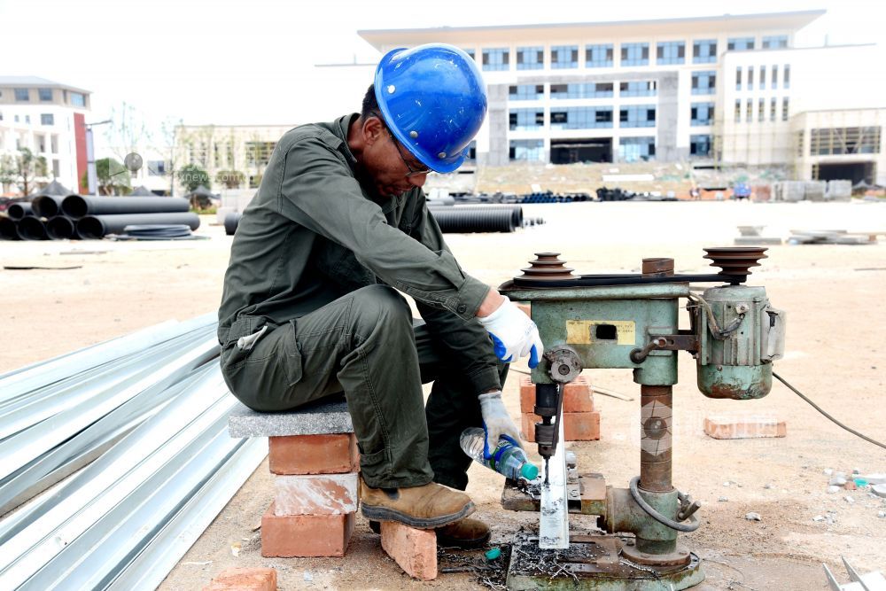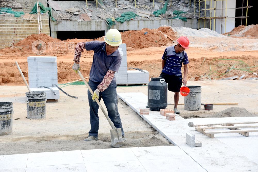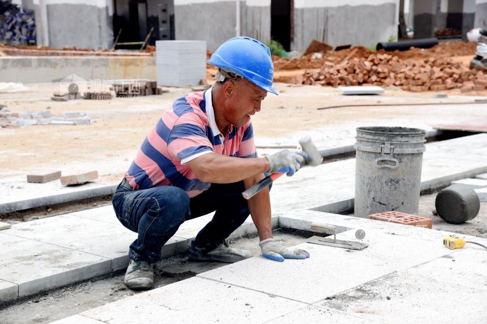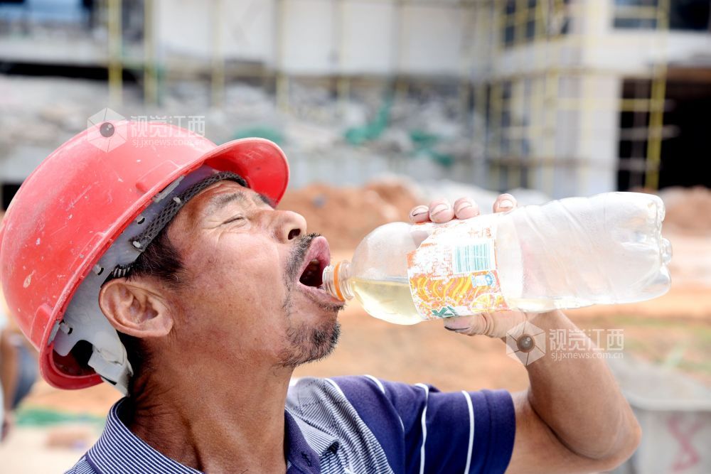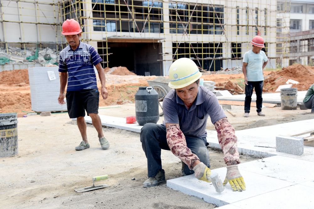 2021年7月7日,江西省南丰县第一中学新校区工地上,工人们在冒着高温抢工期,汗流浃背工作在各自岗位,确保2021年秋季新学期投入使用。